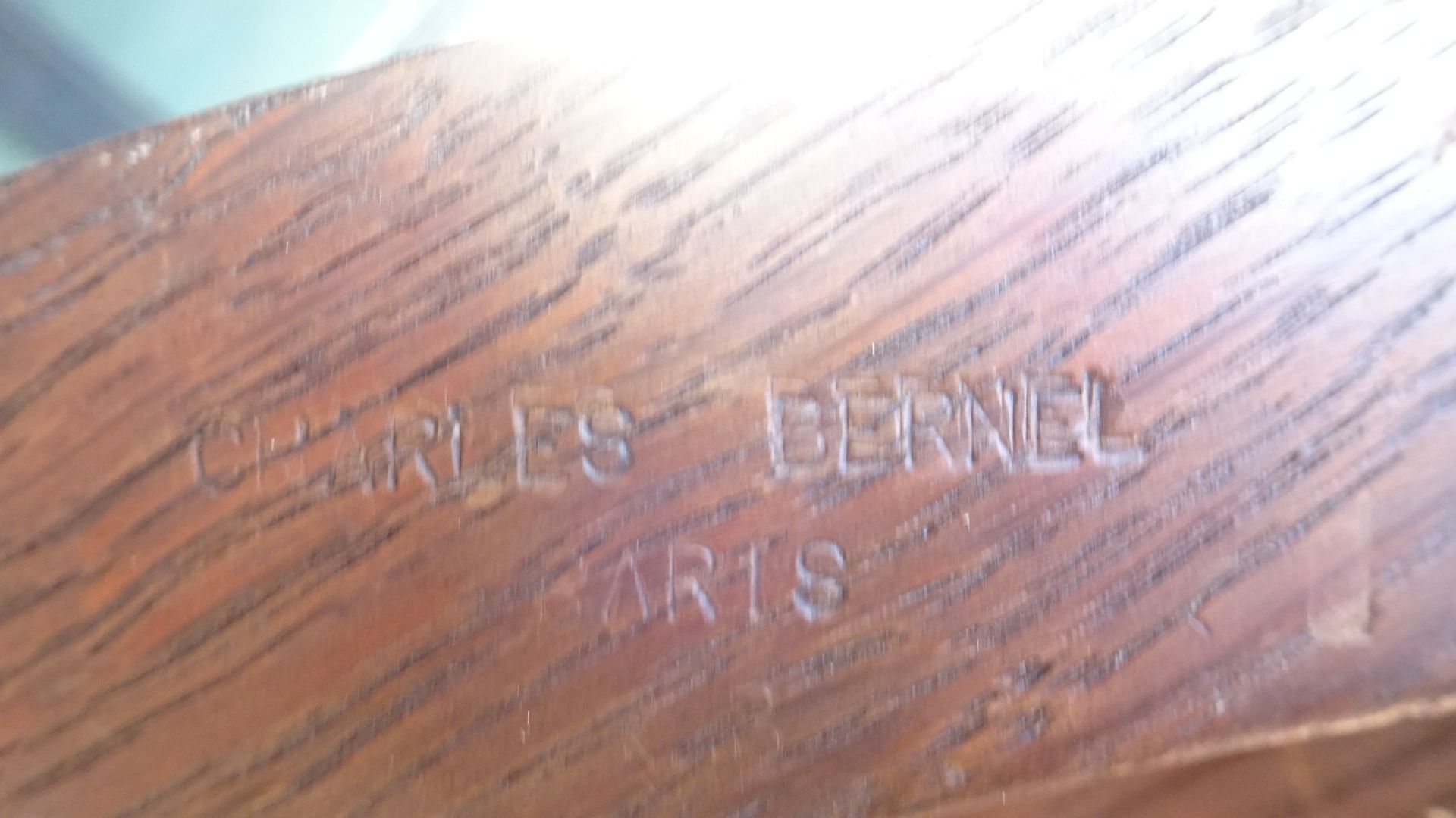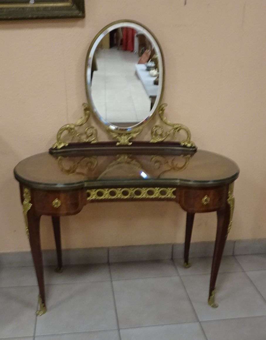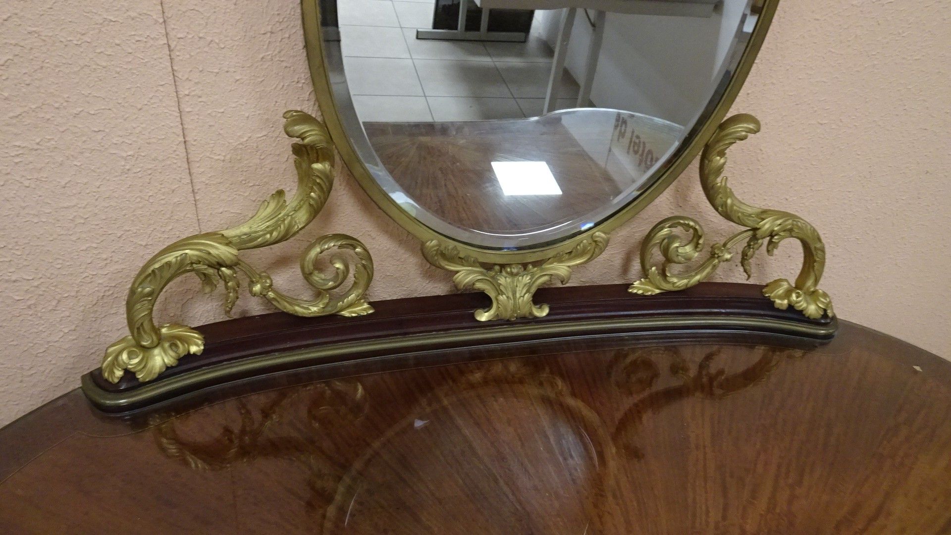 Coiffeuse rognon en bois marqueté et bronze. Elle ouvre à 3 tiroirs en ceinture. Estampillée Charles BERNEL (1889-1956). Paris. 143 x 112 x 57 cm