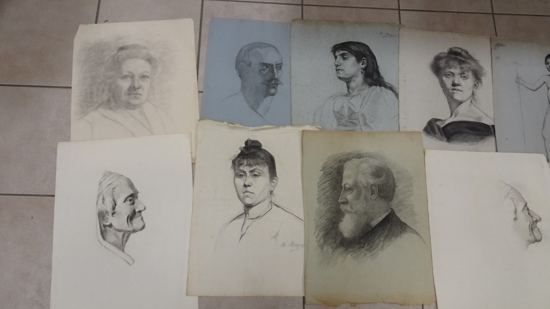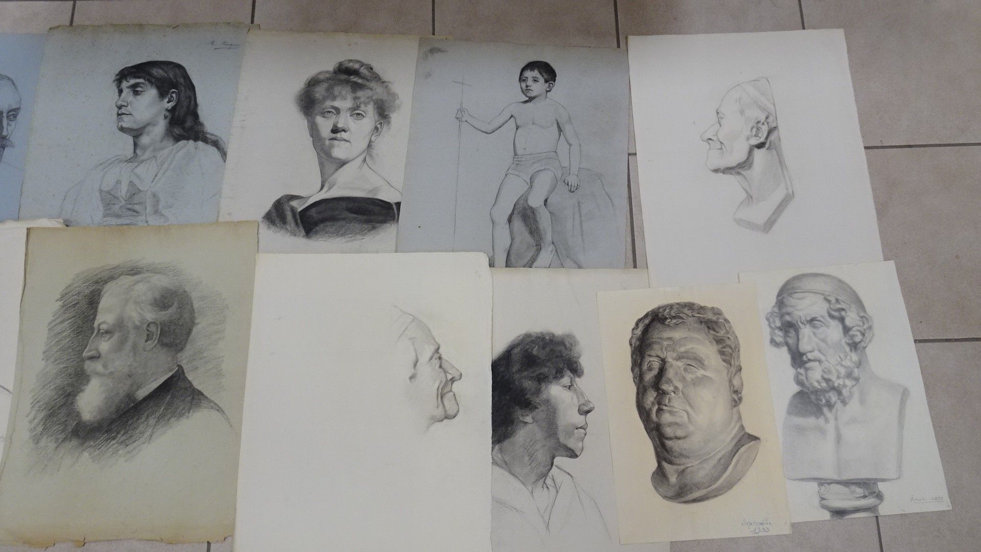 13 dessins académiques : Portraits. 62 x 48 cm environ