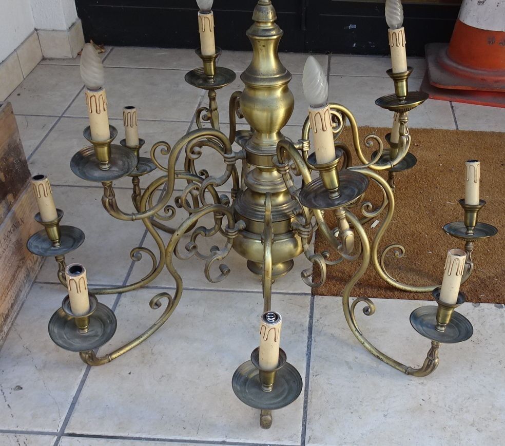 Lustre de style hollandais en laiton à 12 bras de lumière. XX°. Diam 90 cm et haut 72 cm