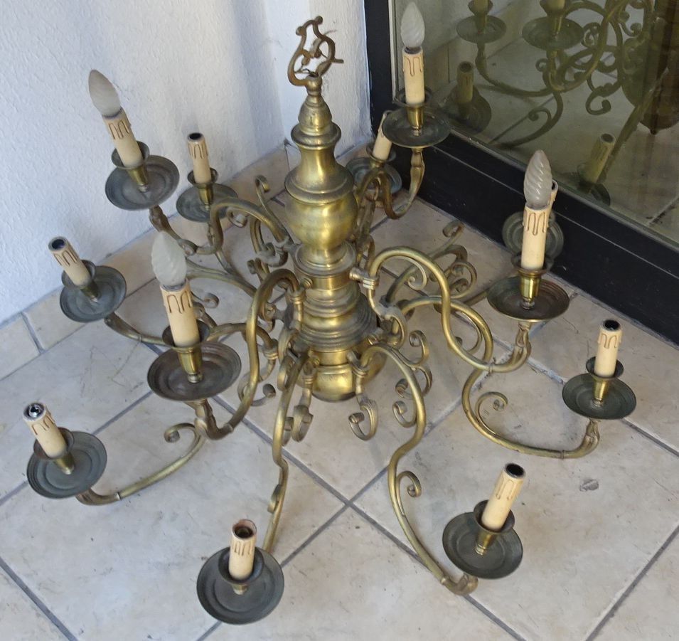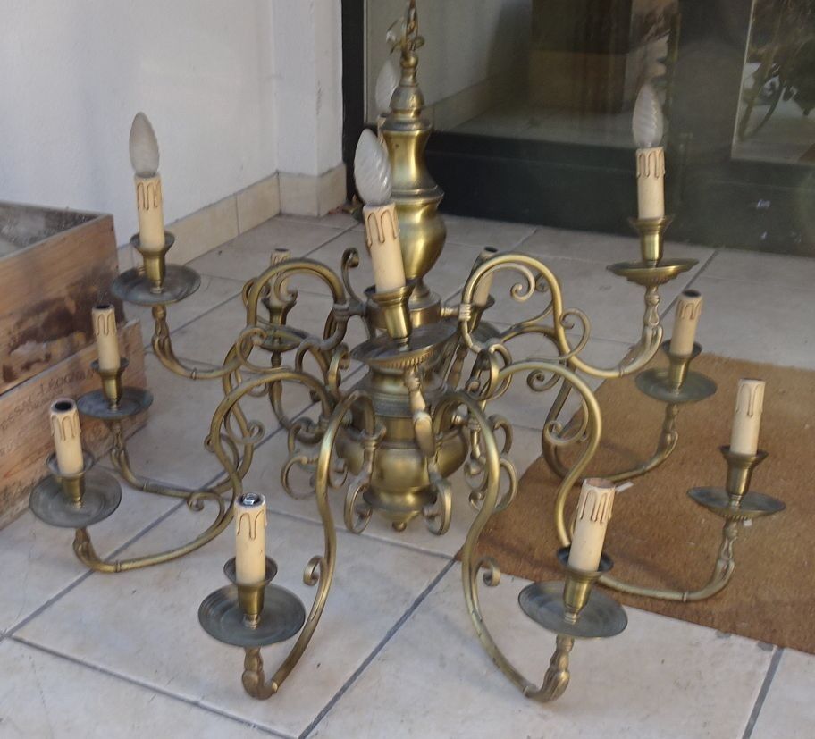 Lustre de style hollandais en laiton à 12 bras de lumière.