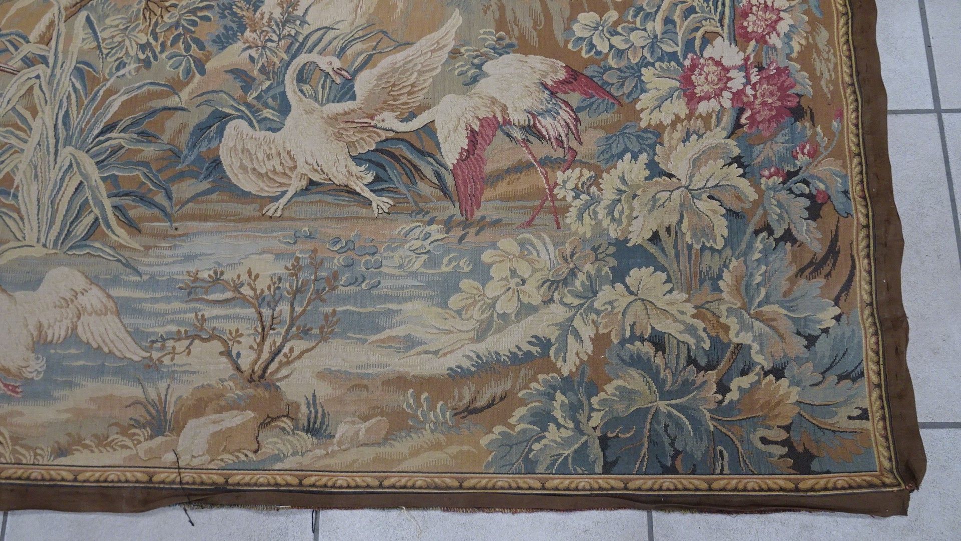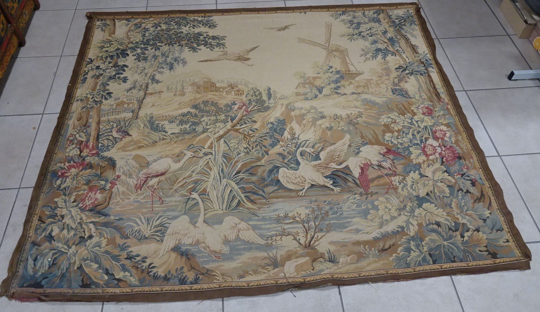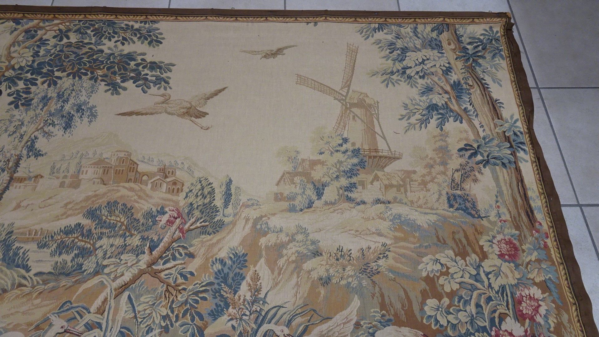 Tapisserie mécanique. Echassiers devant le moulin. 164 x 190 cm. XX°. (déchirures sur la bordure)