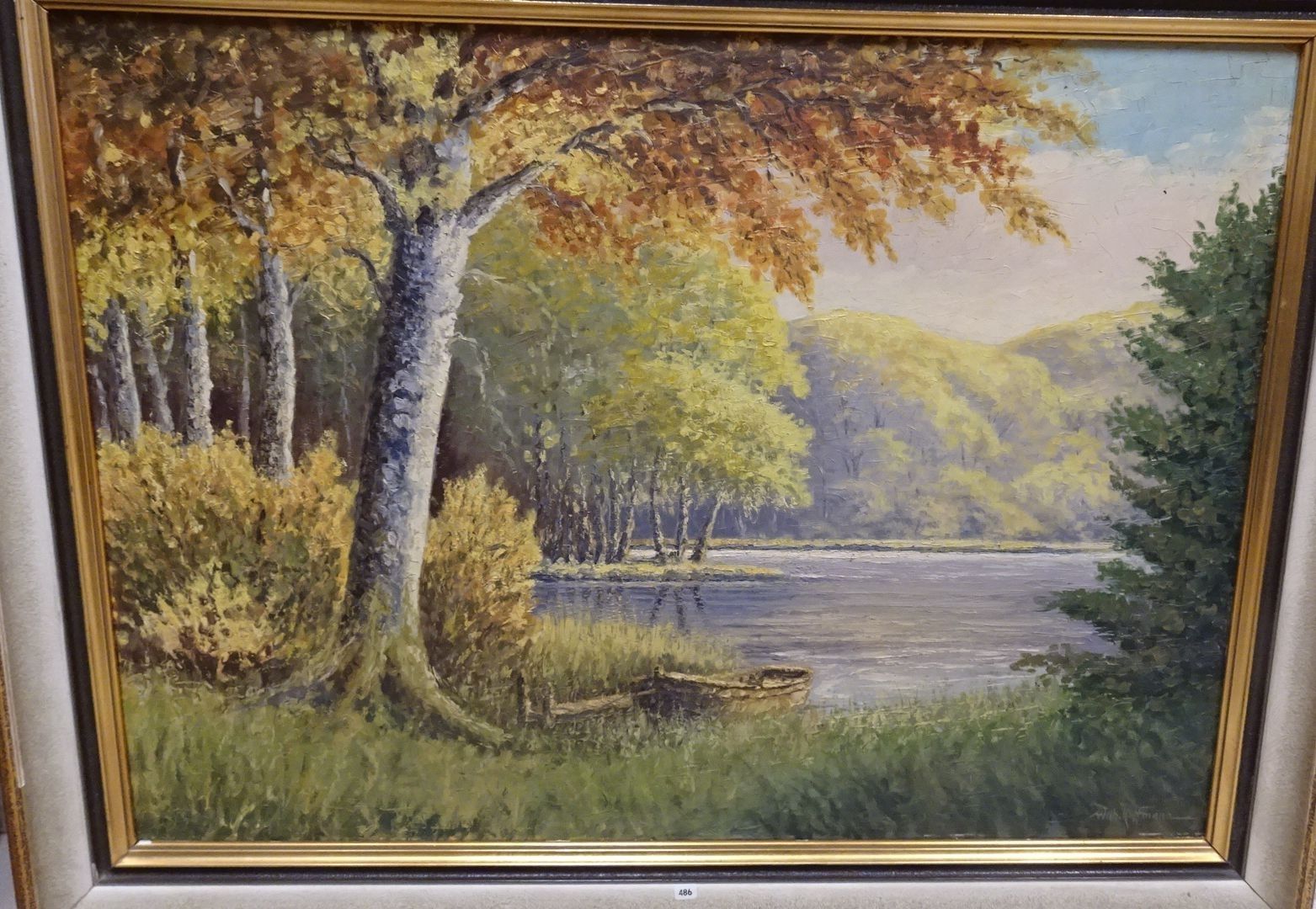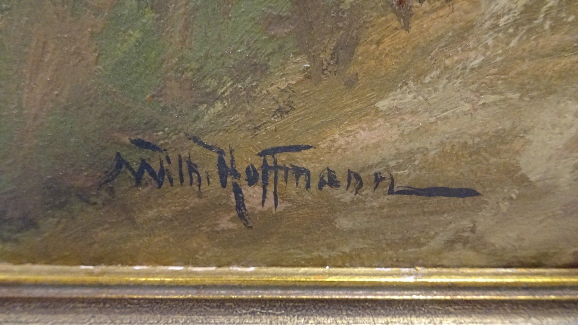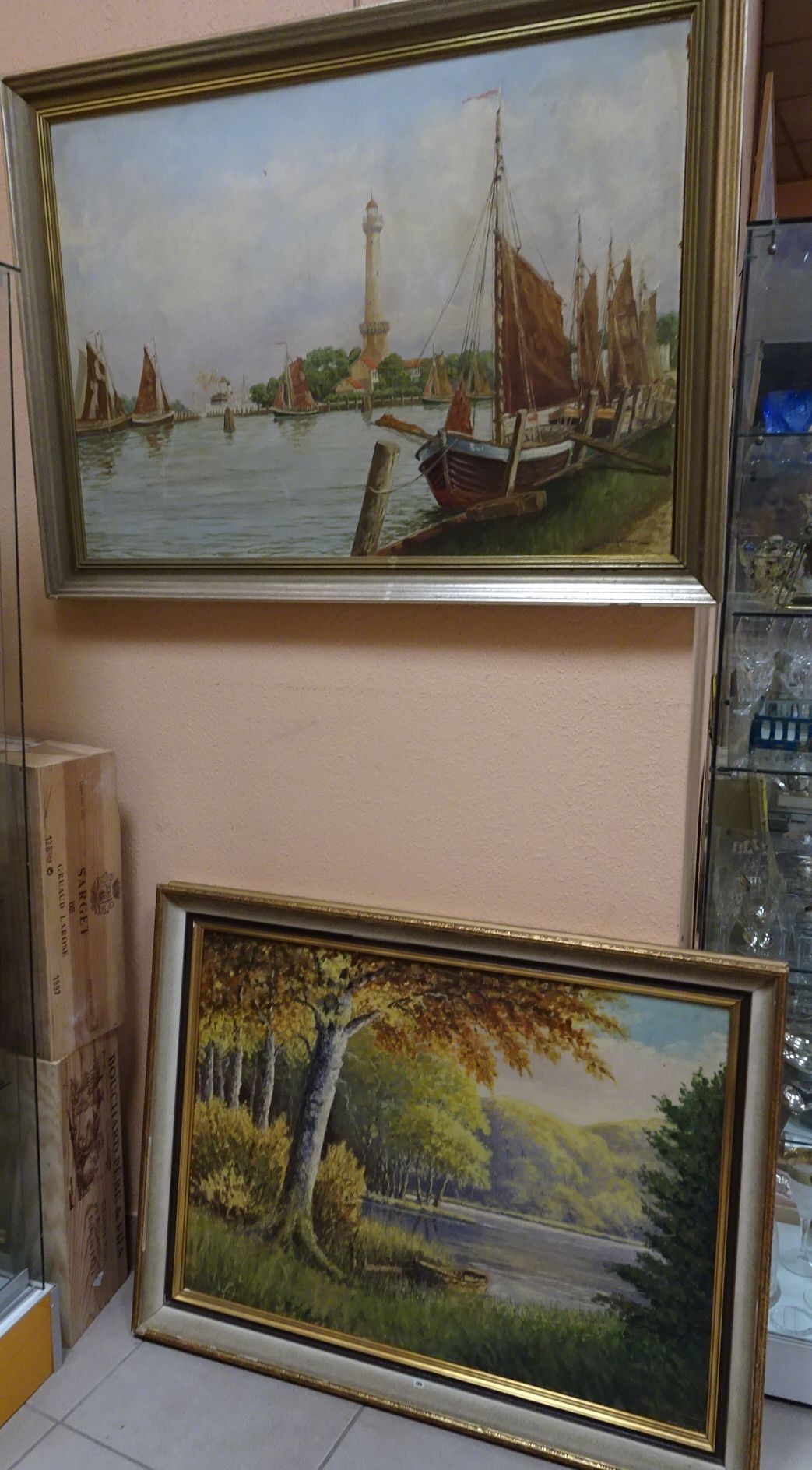 Wilhelm HOFFMANN. (1897-1986) Bateaux de pêche à l'entrée du port. Paysage lacustre. 2 Huiles sur isorel. Signée en bas à droite. 70 x 99 cm