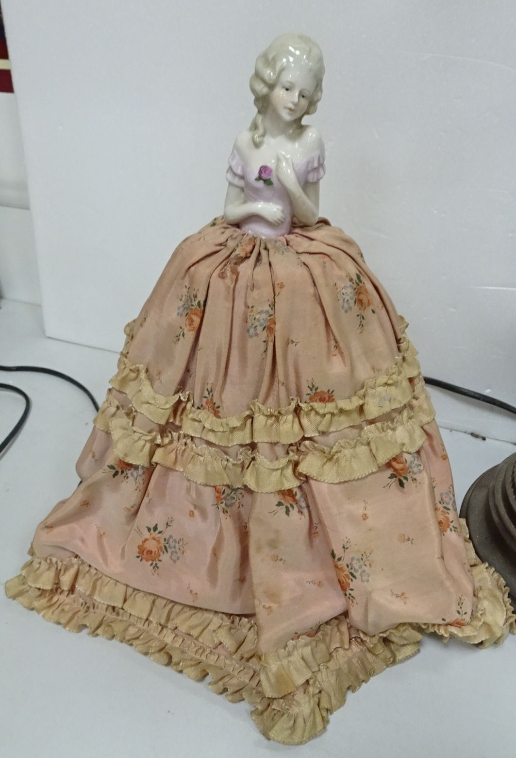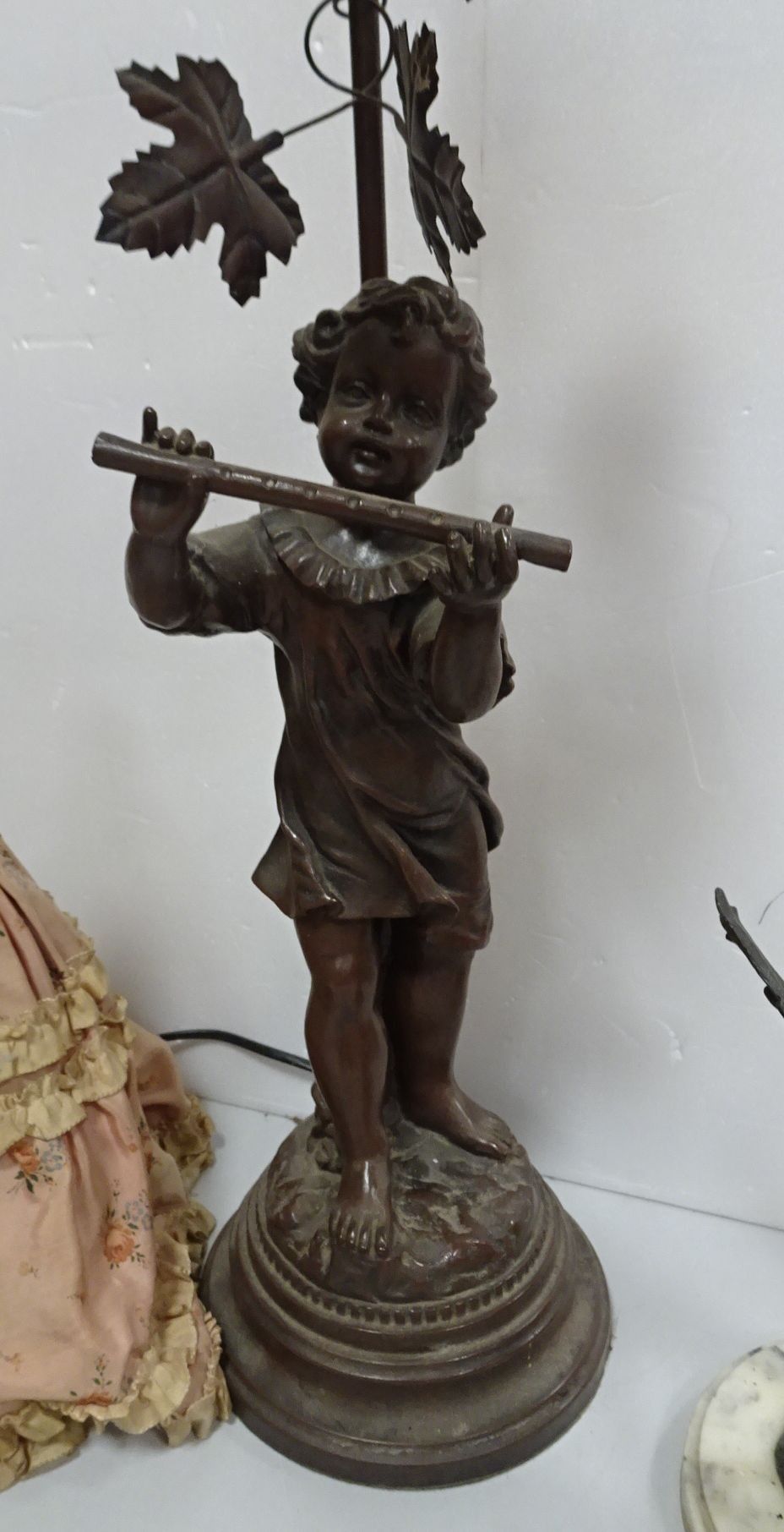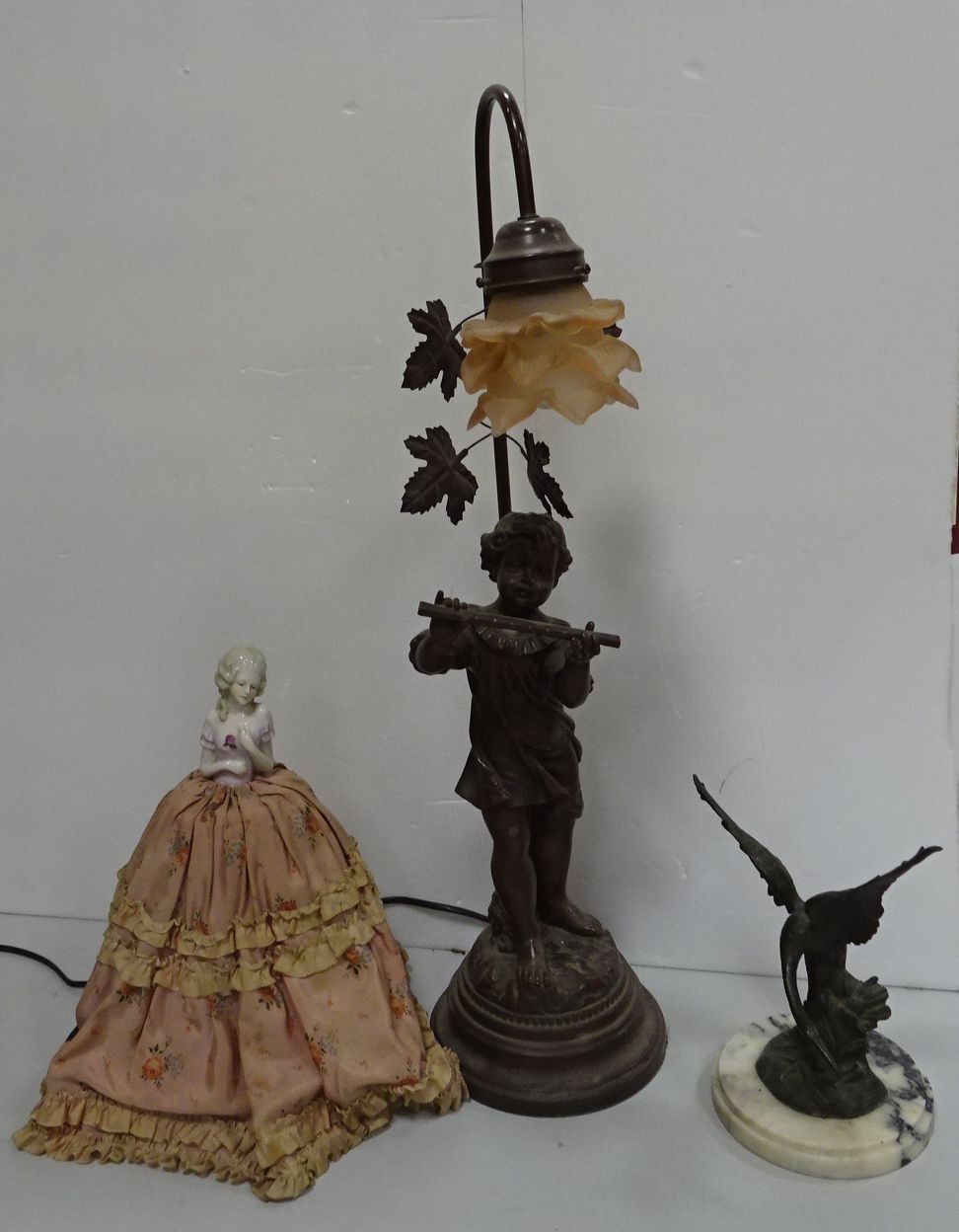 Sujet en bronze figurant un échassier (percé pour former un pied de lampe). Haut 21 cm + Lampe en résine à décor de musicien + Sujet en porcelaine, tissu et carton