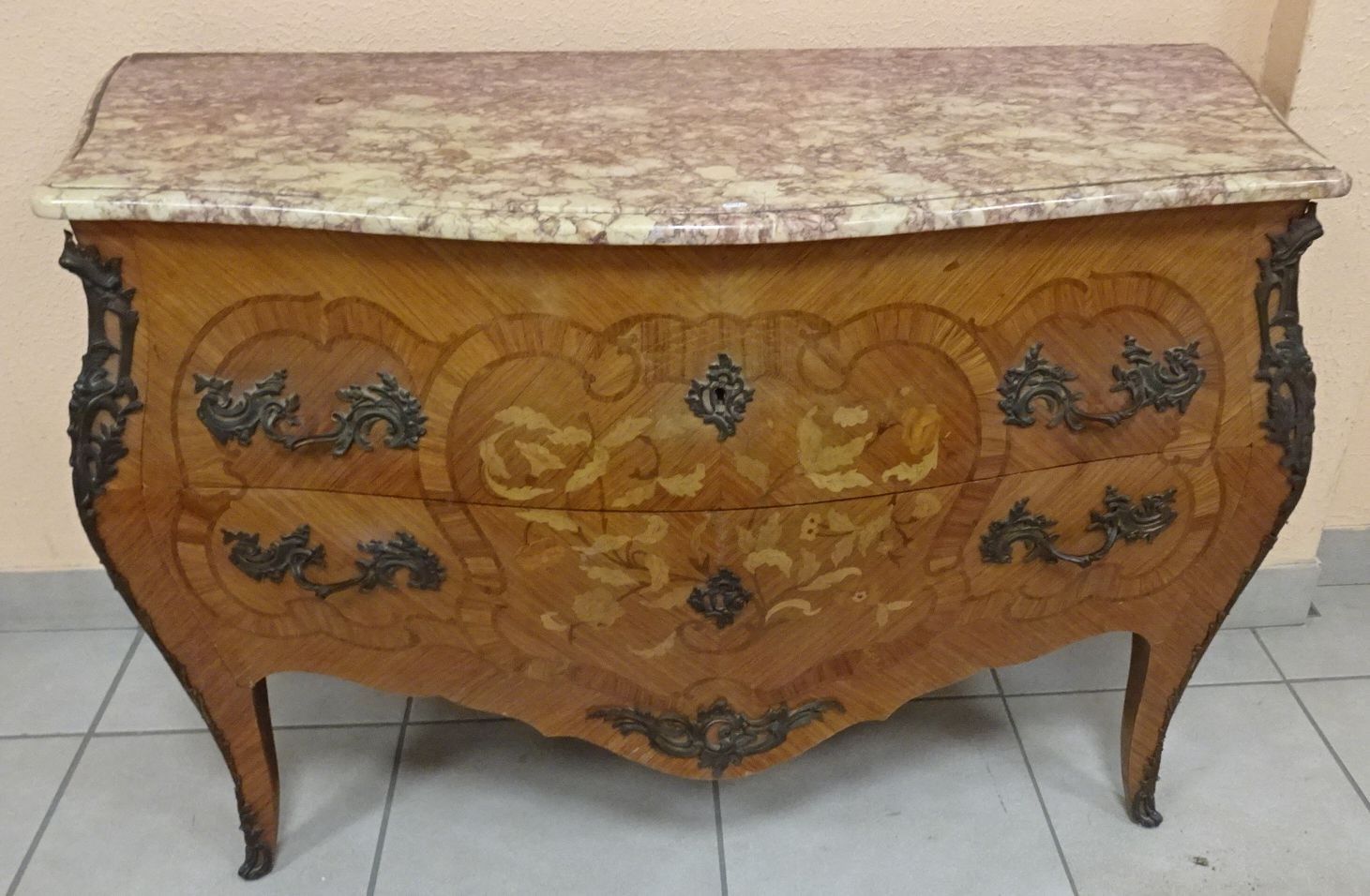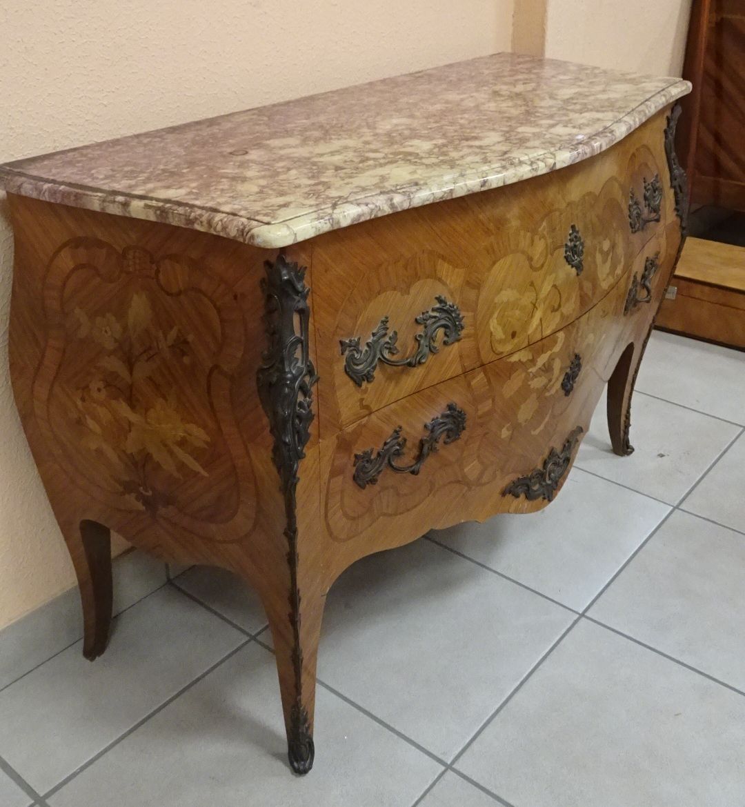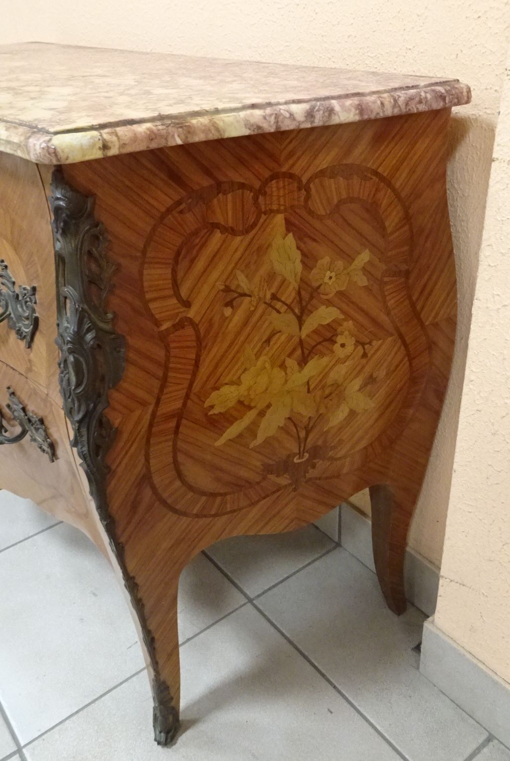 Commode sauteuse en bois marqueté de fleurs. Dessus de marbre griotte. Style Louis XV. XX°. 85 x 128 x 54 cm