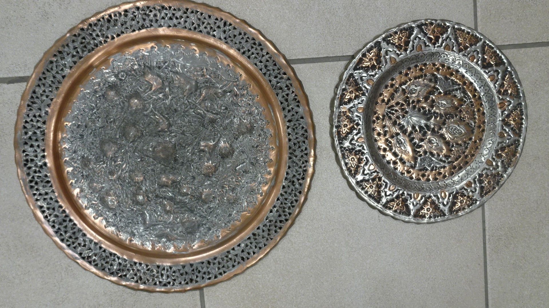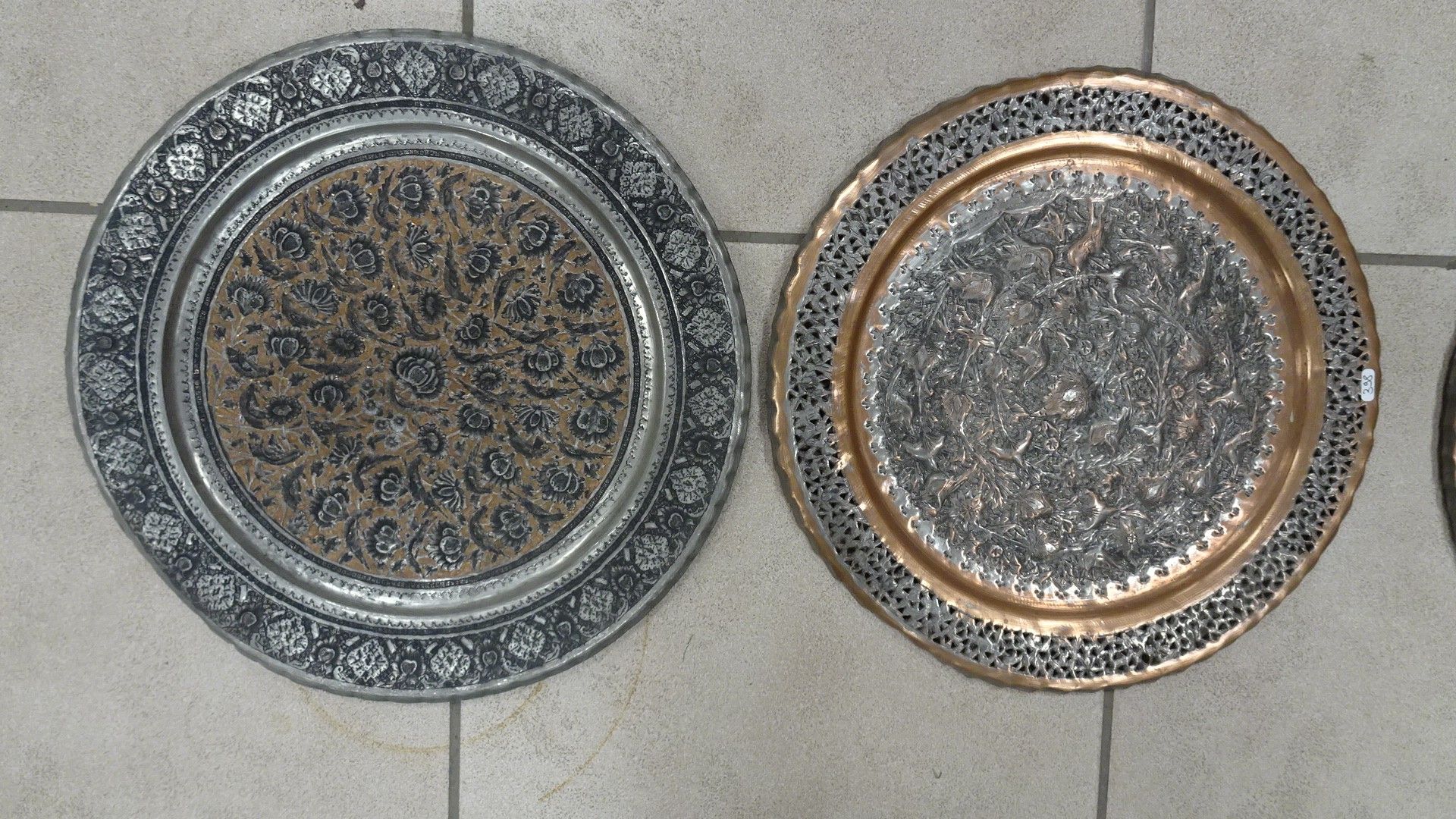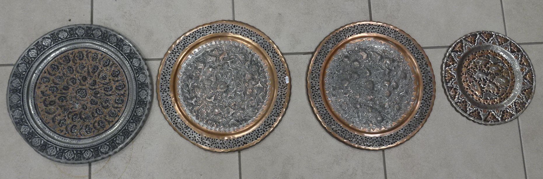 4 Plats en cuivre et métal ajouré. Travail iranien. Diam 40 cm env;