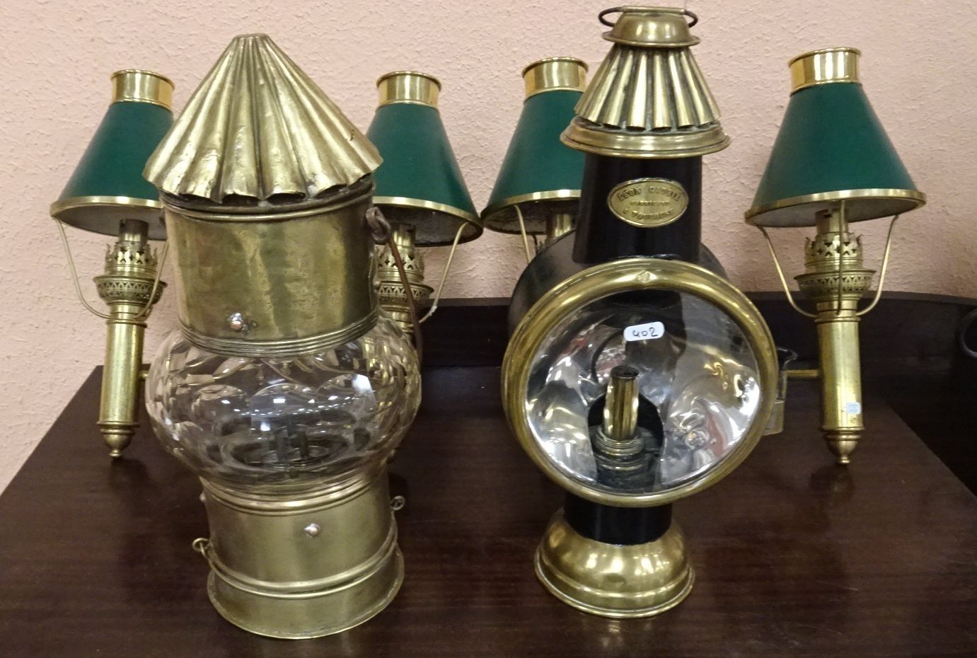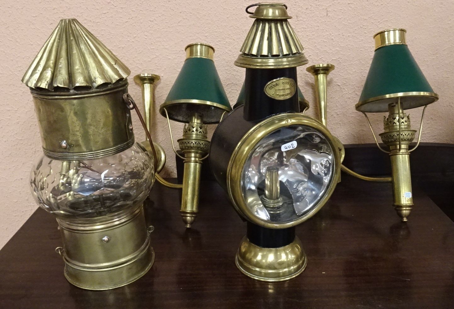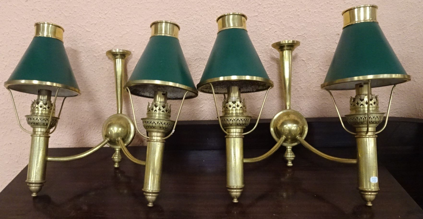 Paire d'appliques à 2 bras de lumière en laiton, abat-jour en tôle verte. XX°. Haut 28 cm + 2 Lampes tempête en laiton, métal et cristal. Une marquée Léon Cathié