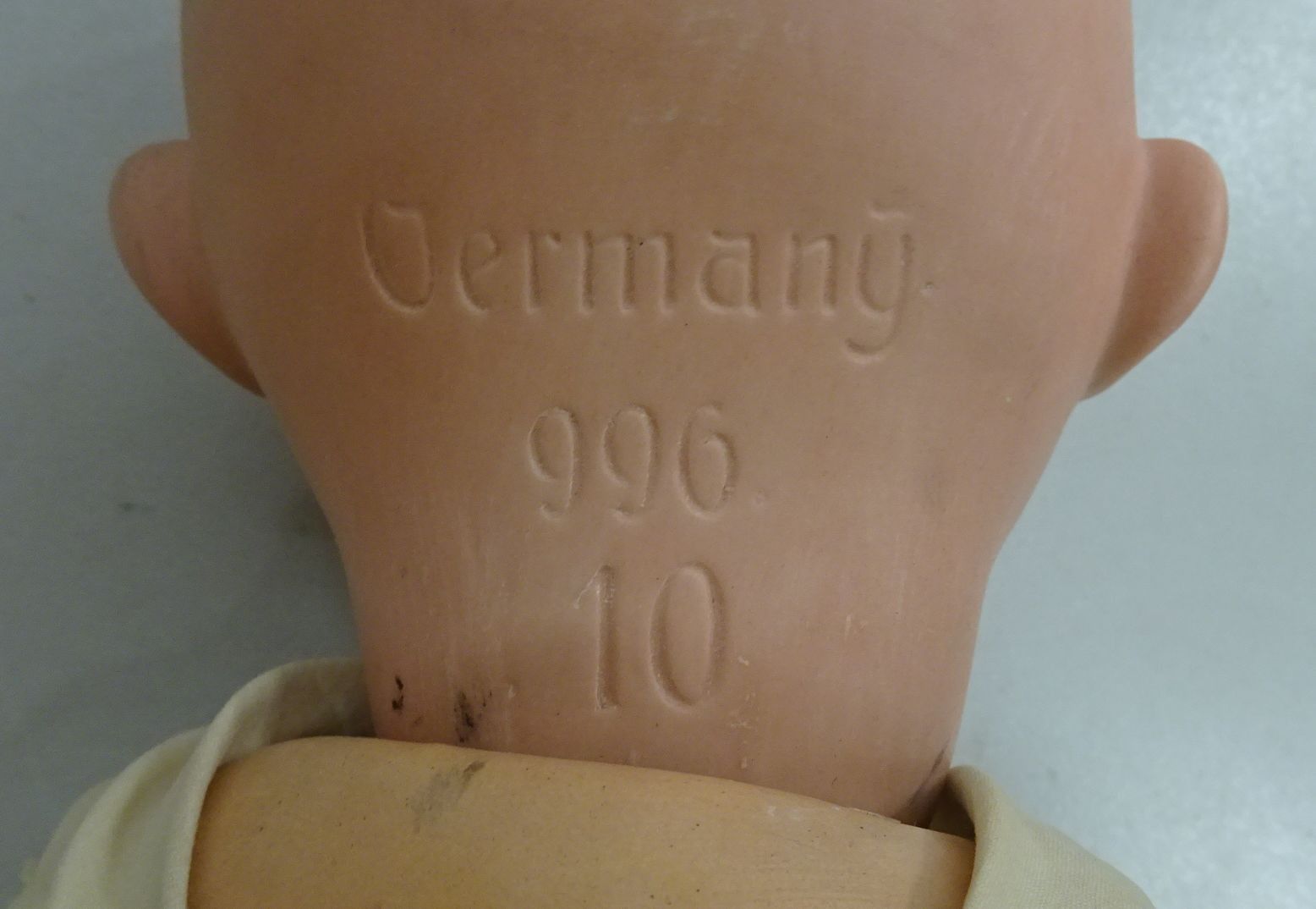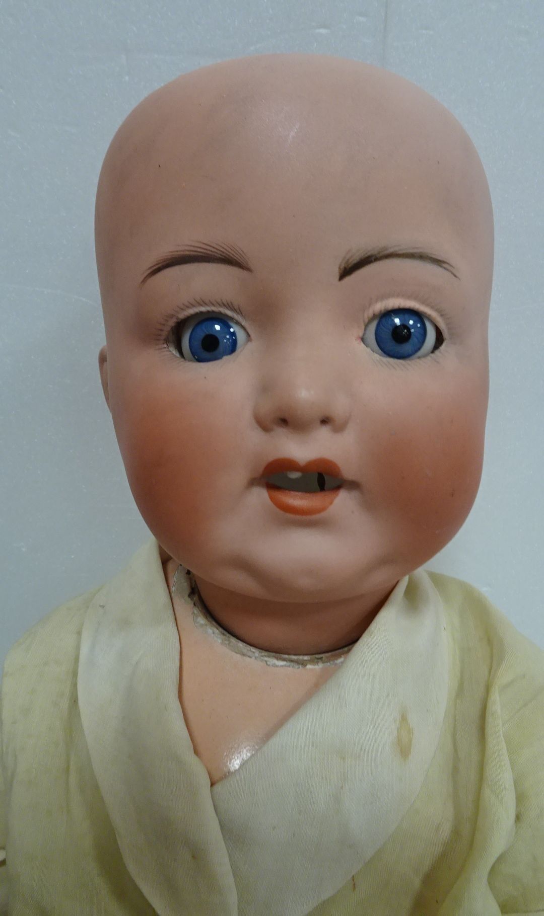 Poupon tête porcelaine Marquée GERMANY. 996/10. Yeux mobiles, bouche ouverte avec une dent. Haut 52 cm