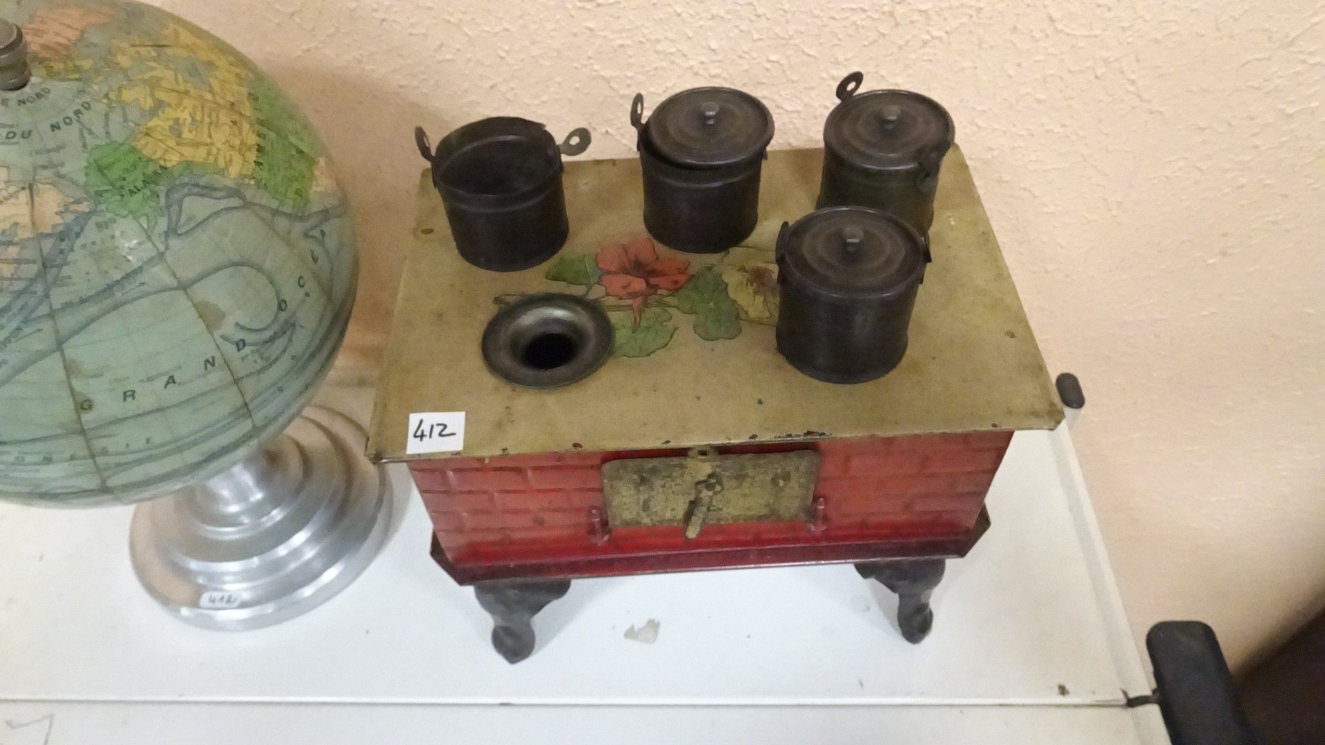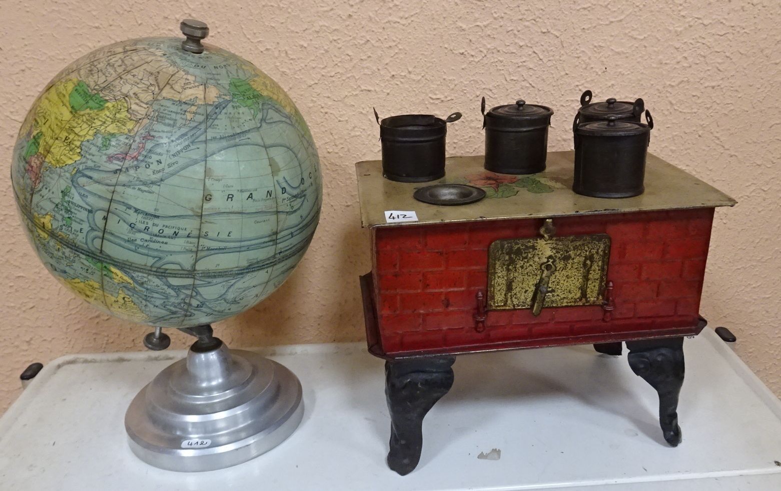 Globe terrestre, pied aluminium. Richard. Paris Haut 30 cm + Potager de poupée en tôle peinte. 19 x 23 x 16 cm (manque)