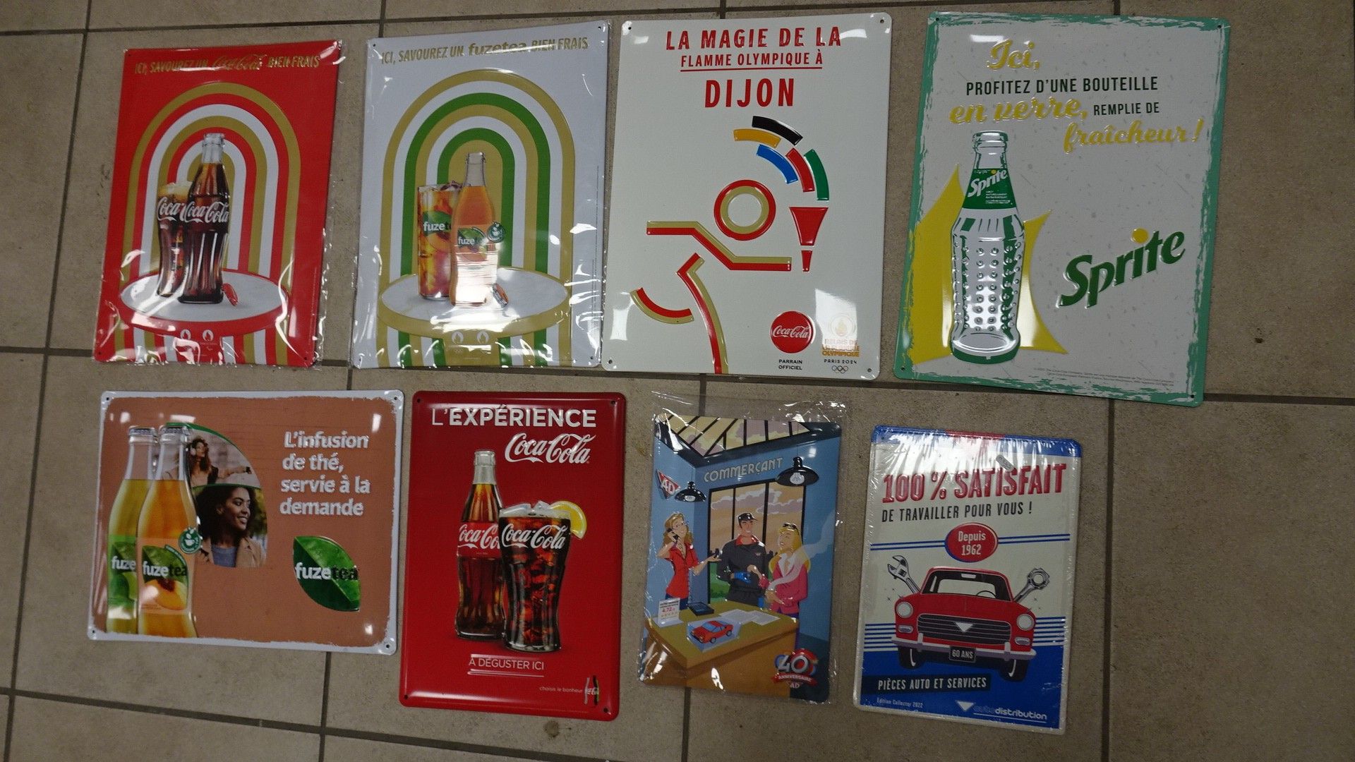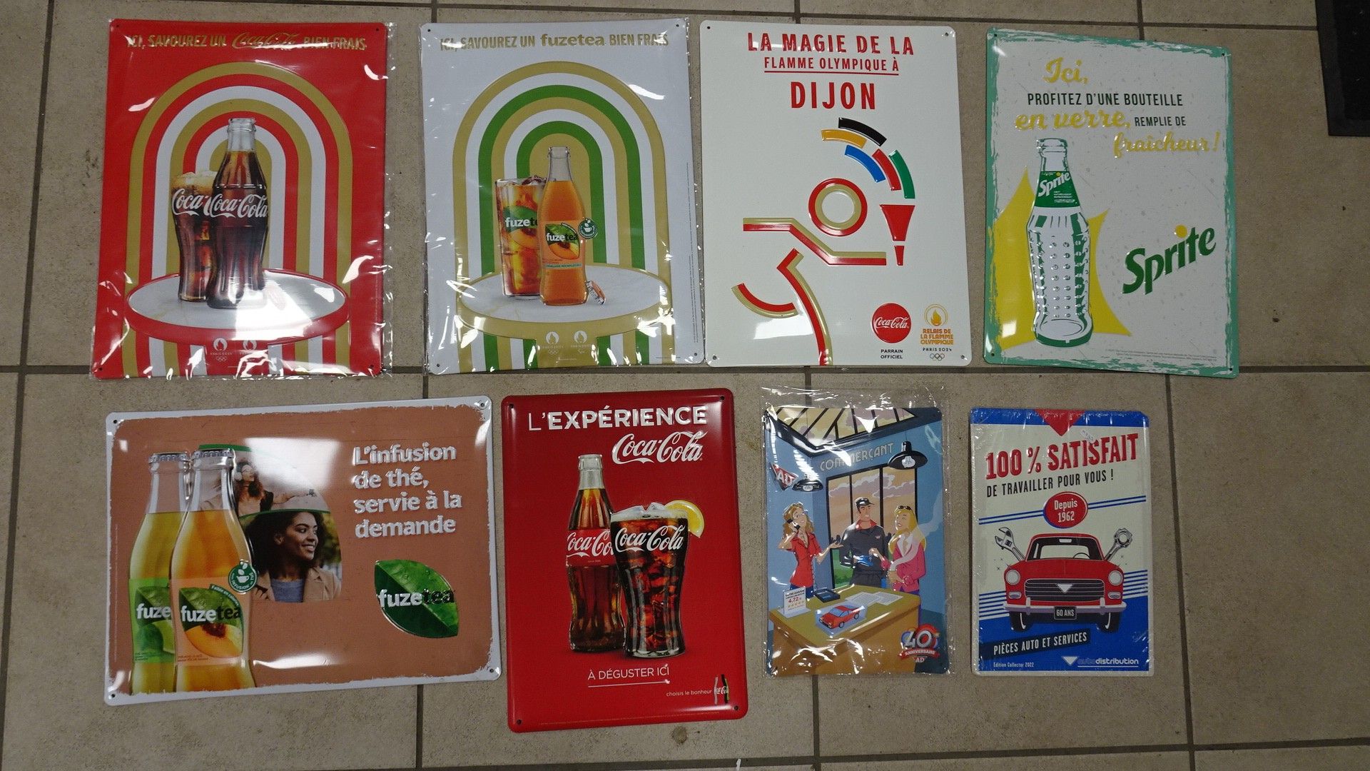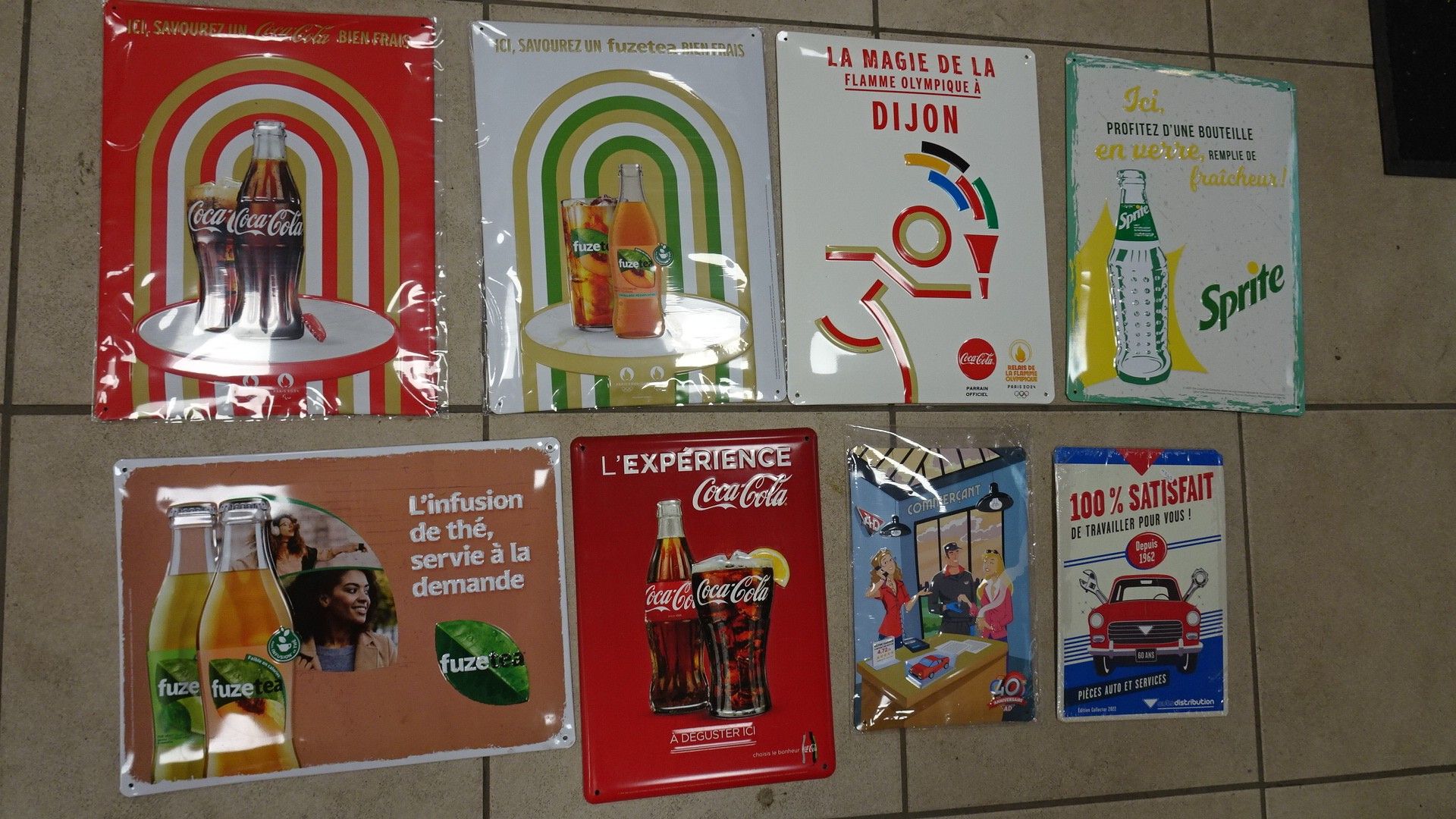 8 reproductions de Plaques en tôle : Coca-cola, Fuz Tea, Sprite. 36 x 26 cm