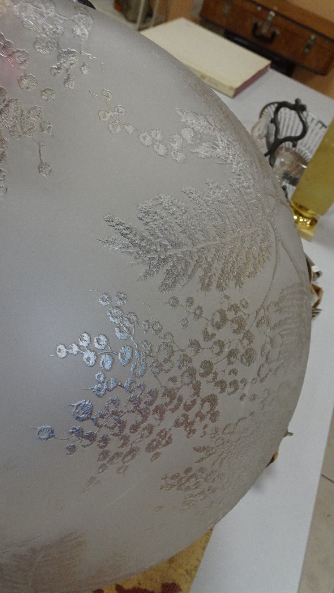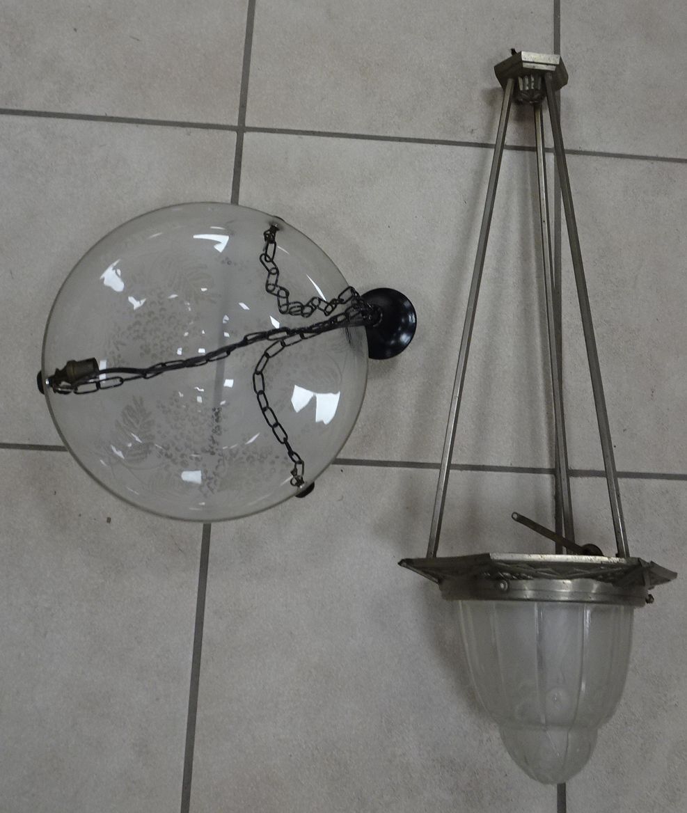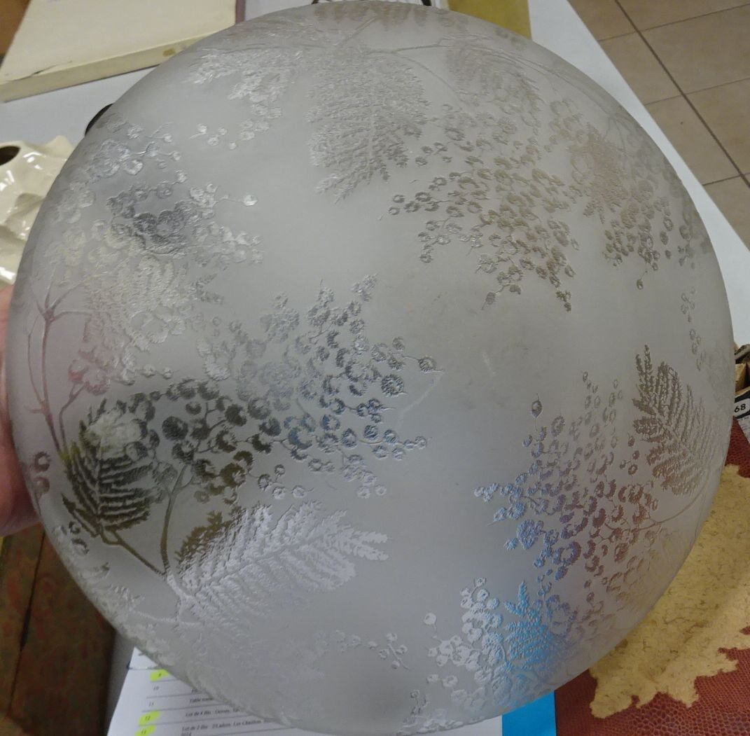 Suspension en verre givré à décor de fougères. Signé DEVEAU. Diam 34,5 cm + Lustre en verre moulé à décor de fleurs et métal. Haut 83 cm