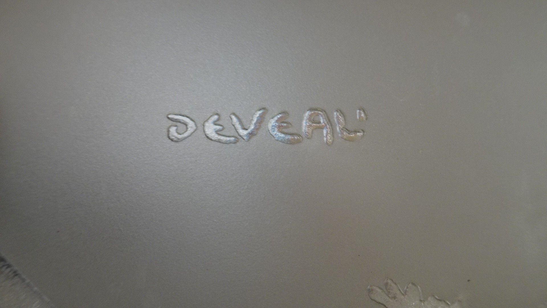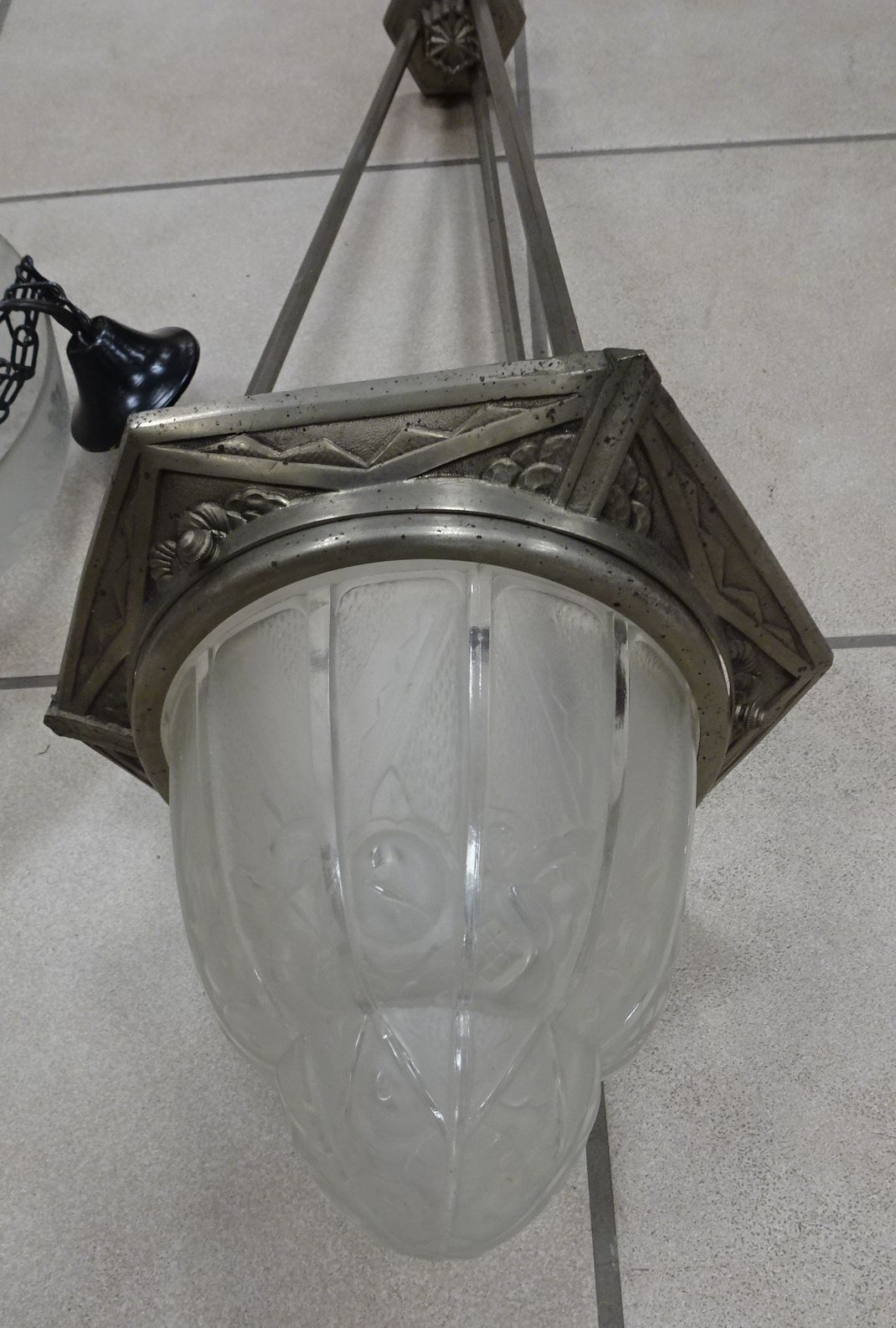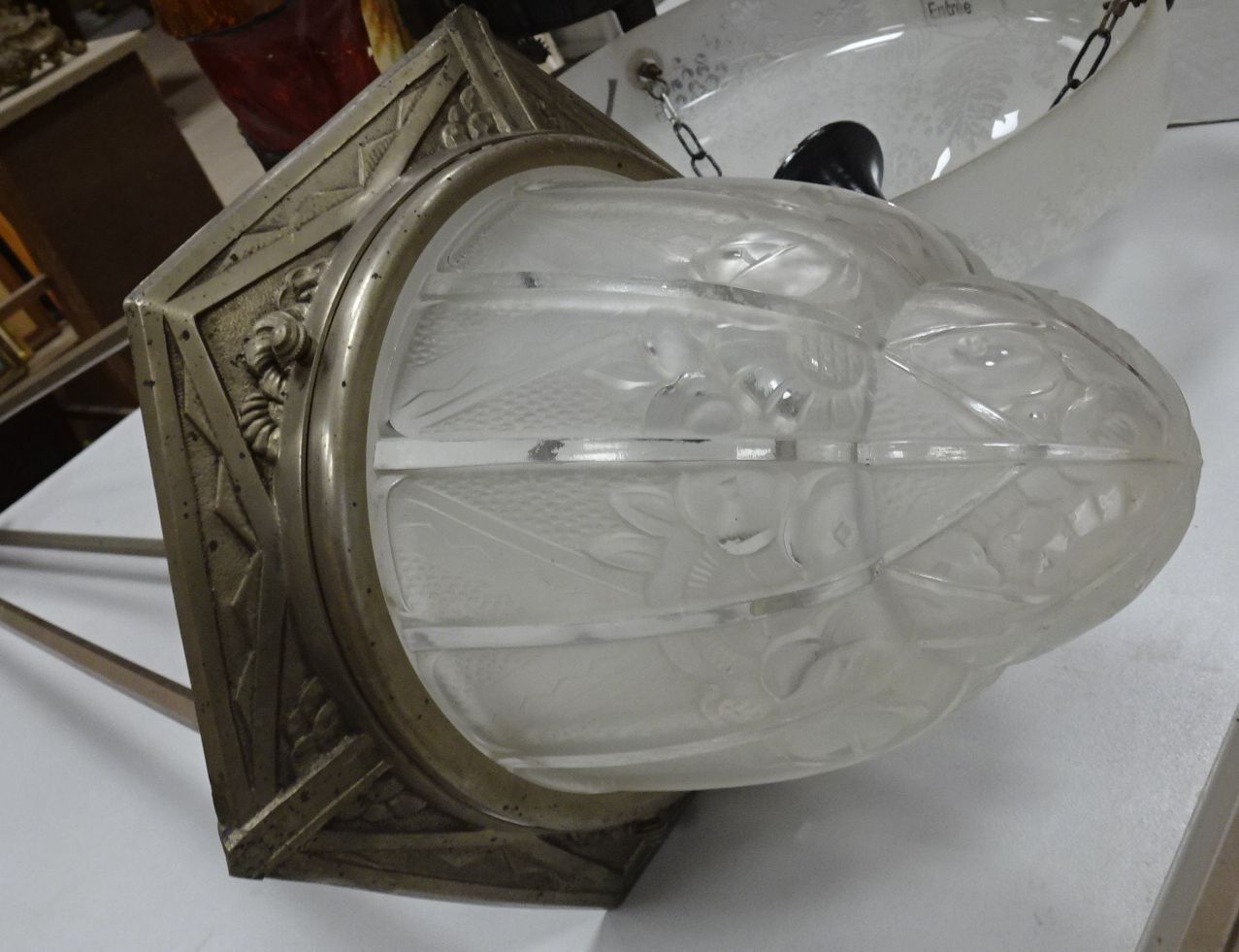 Suspension en verre givré à décor de fougères. Signé DEVEAU. Diam 34,5 cm + Lustre en verre moulé à décor de fleurs et métal. Haut 83 cm
