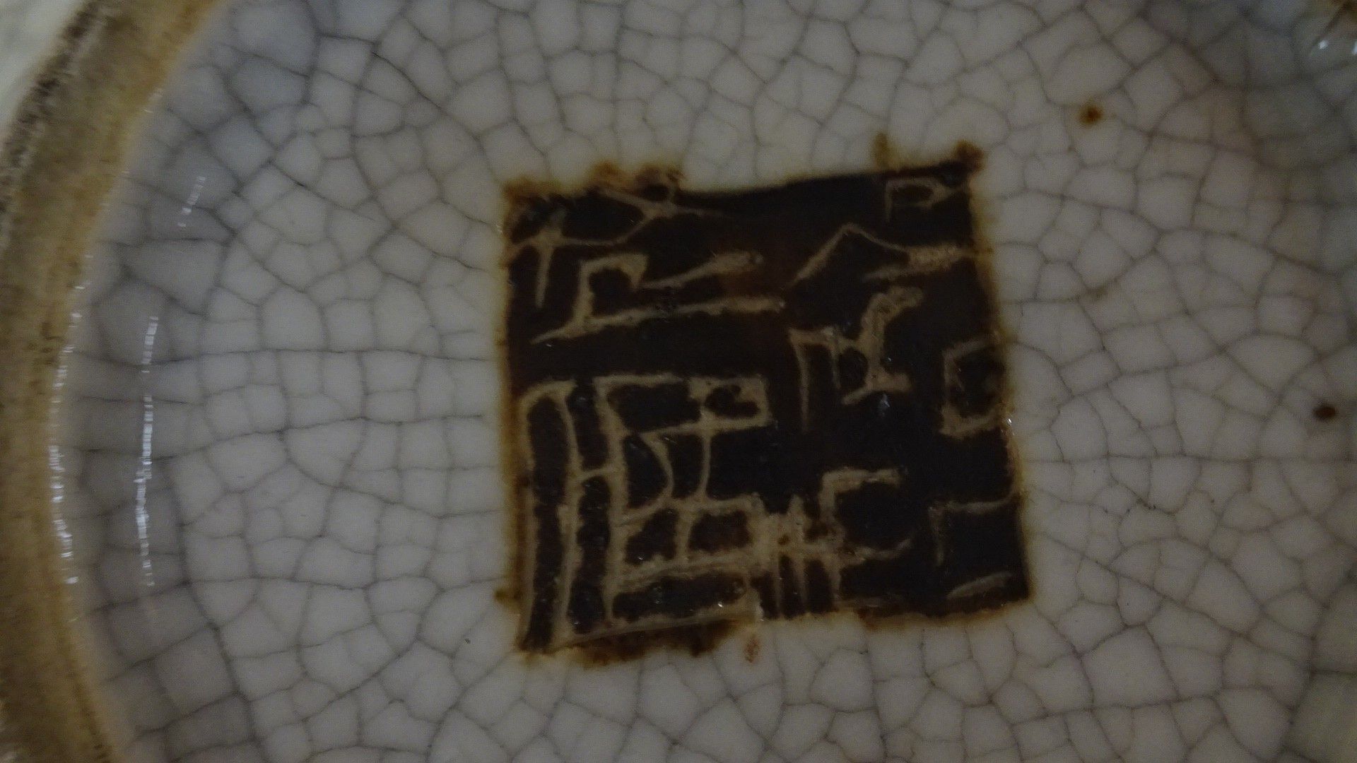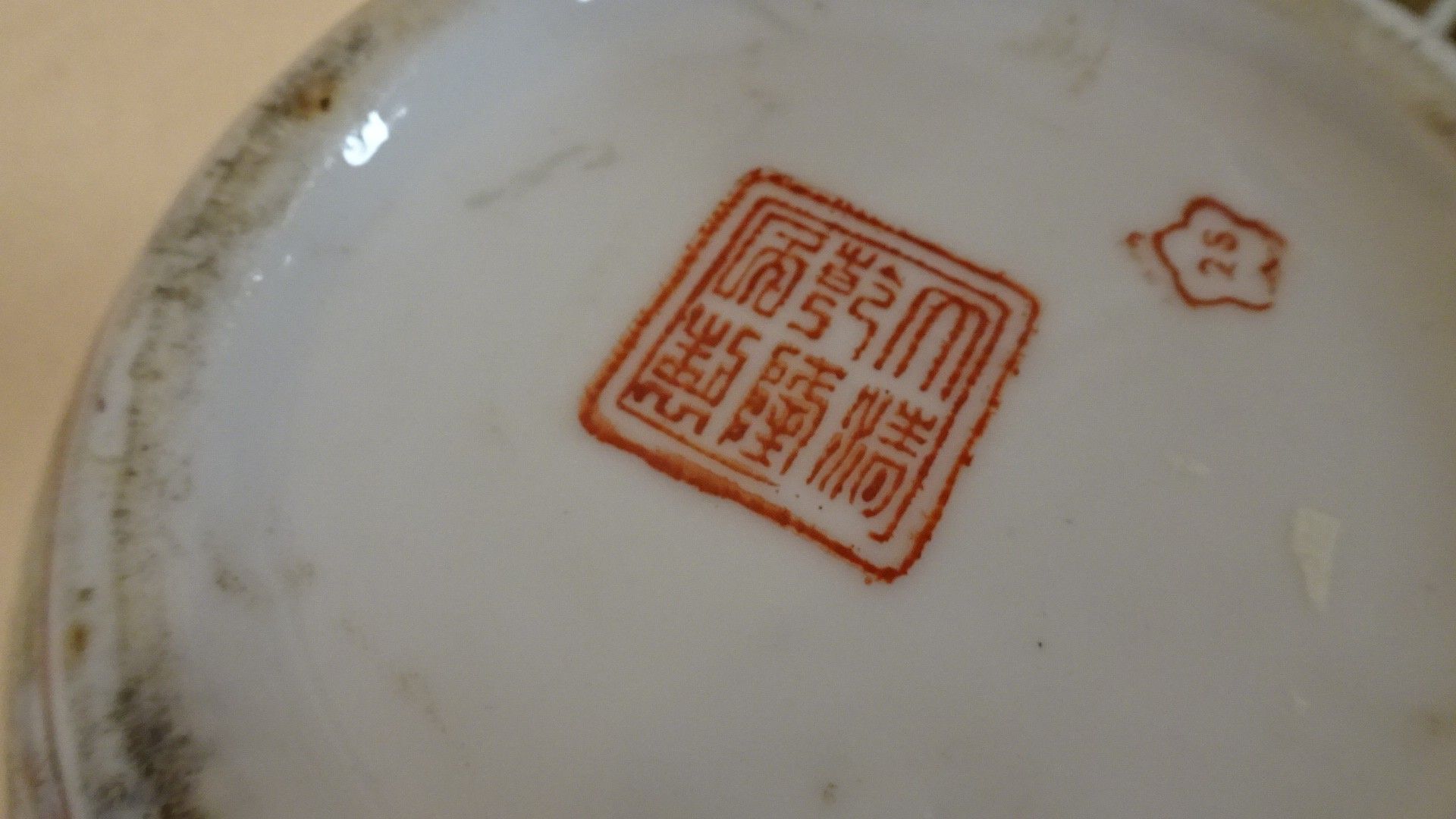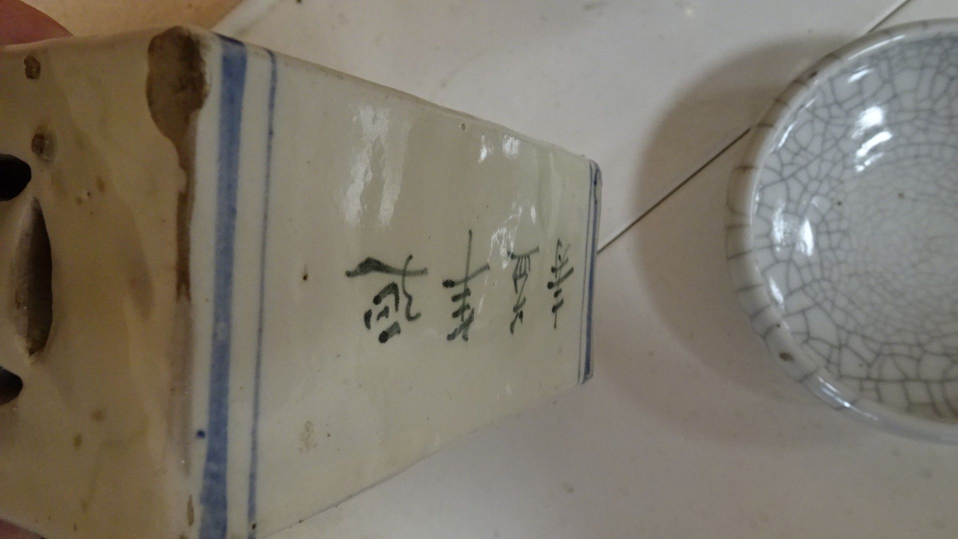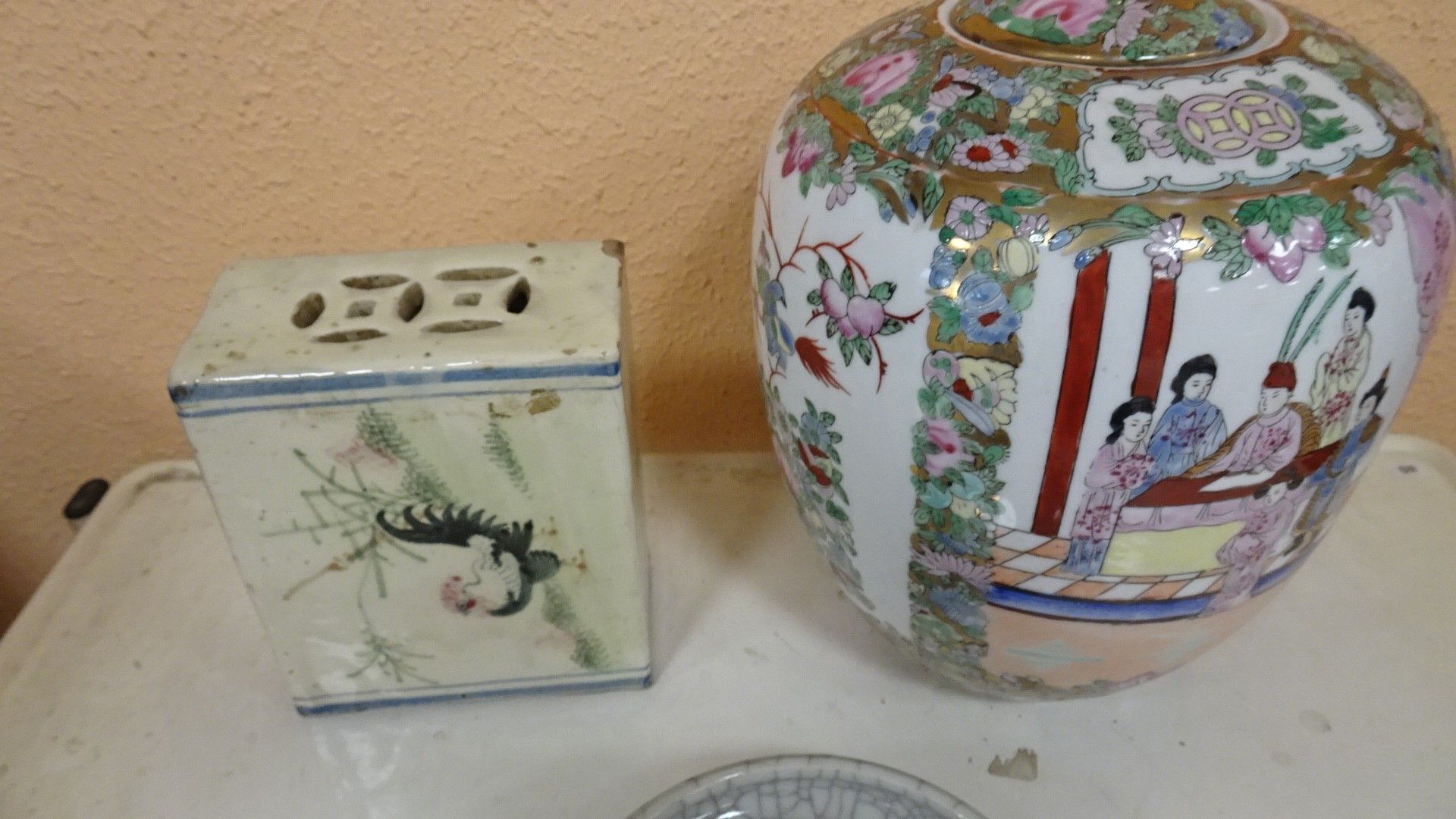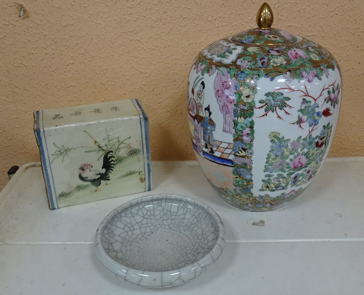 Pot couvert en porcelaine polychrome. Haut 27 cm, Coussin à opium (acc.) et vide-poche en céramique craquelée. Travail asiatique. XX°