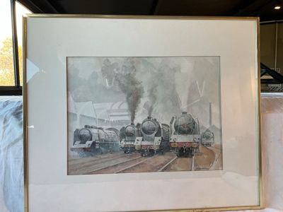 Une aquarelle sur papier représentant un dépôt de locomotive…