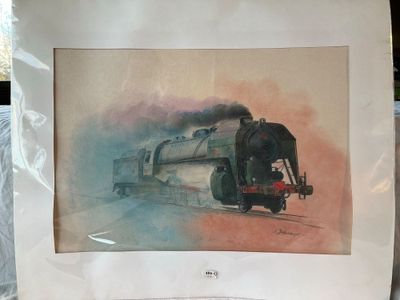 Une aquarelle sur papier représentant une locomotive à vapeu…