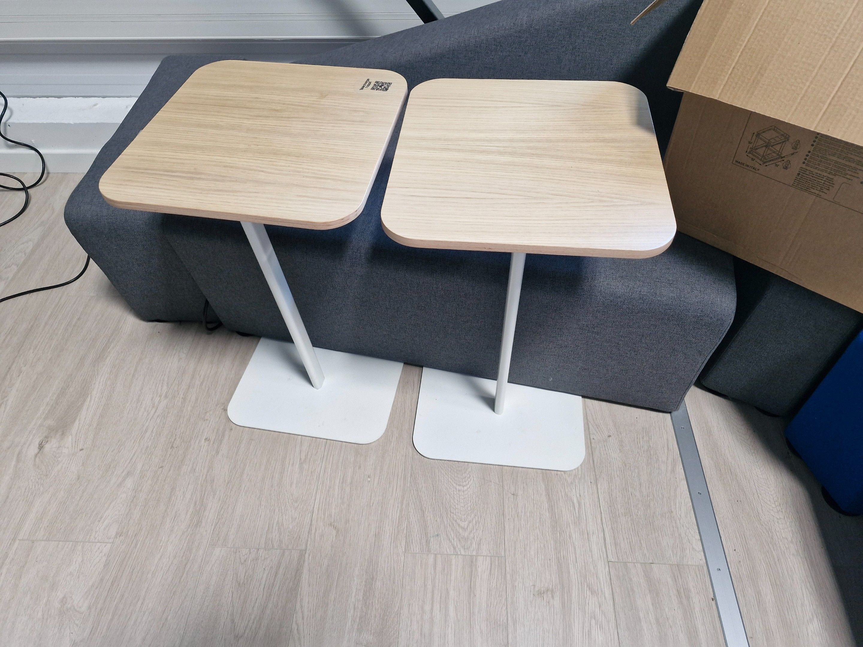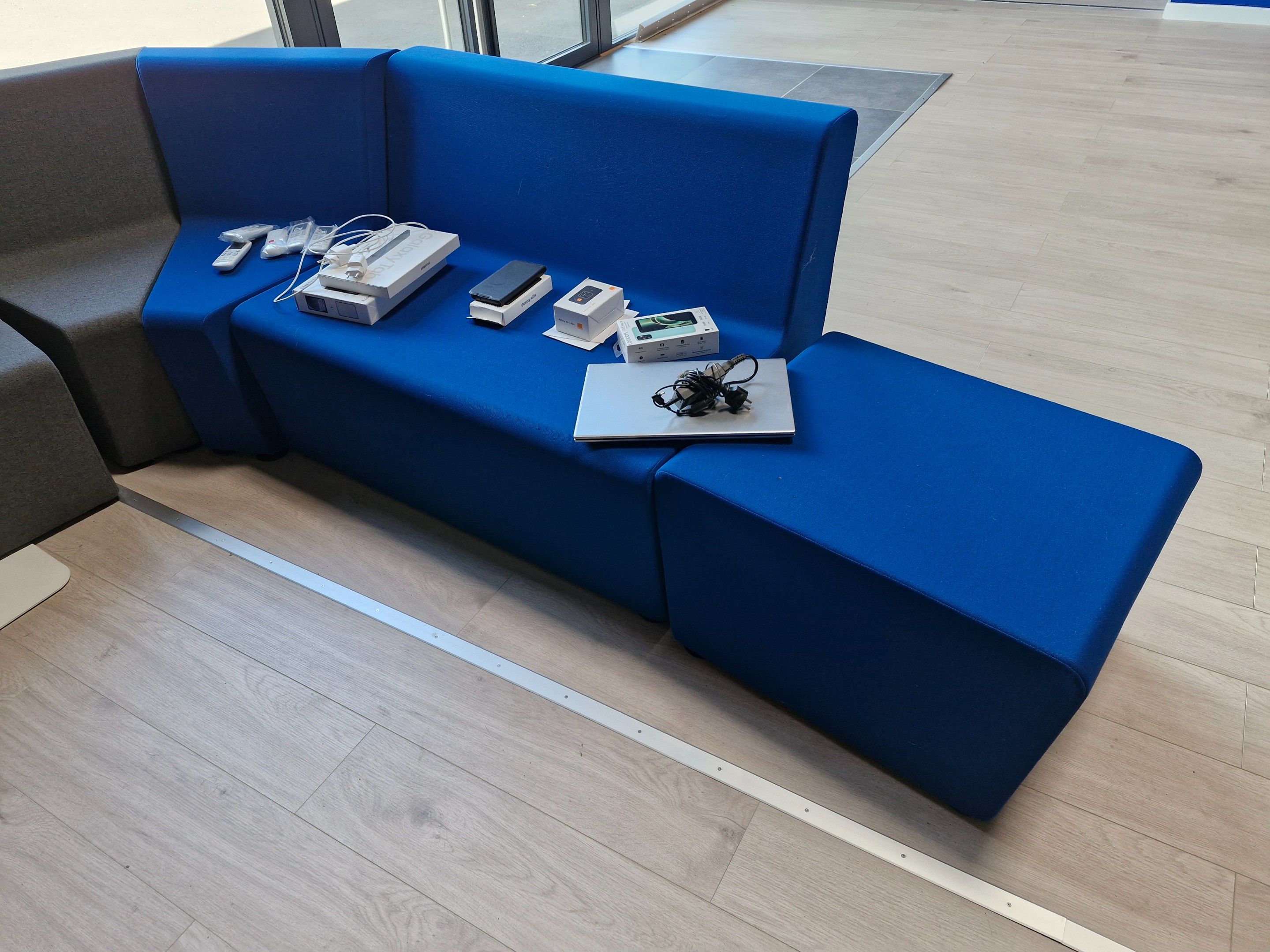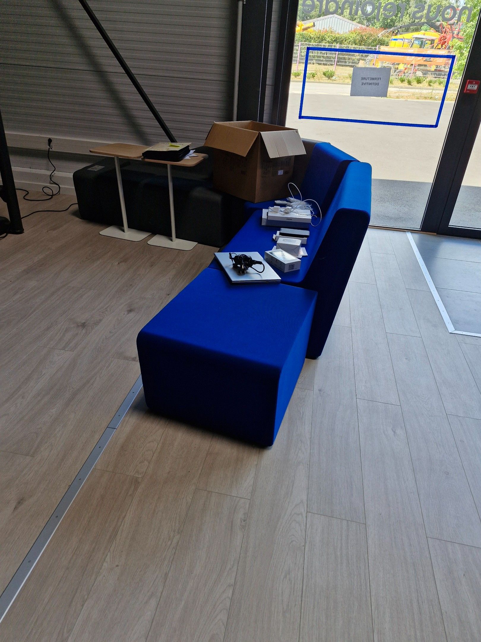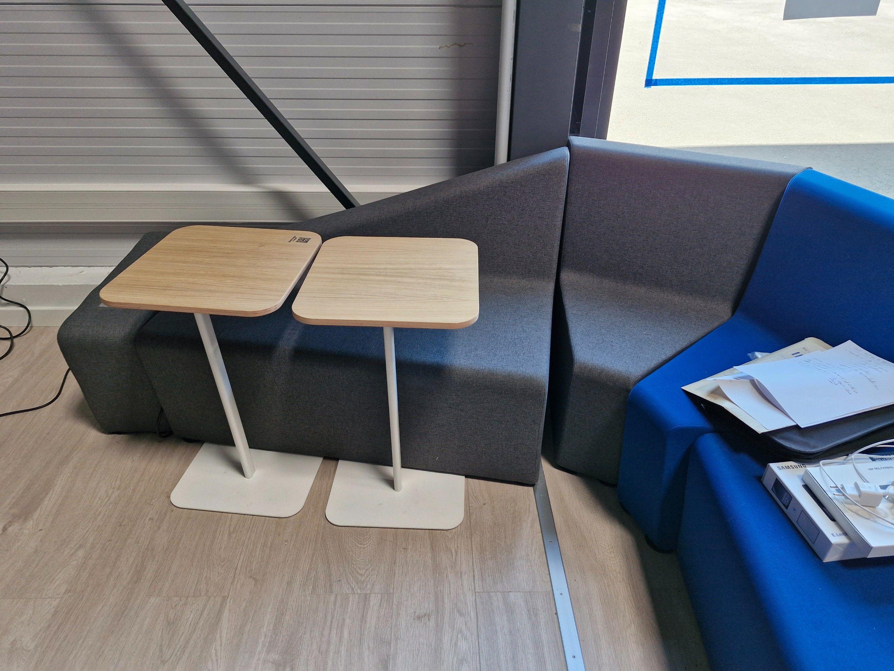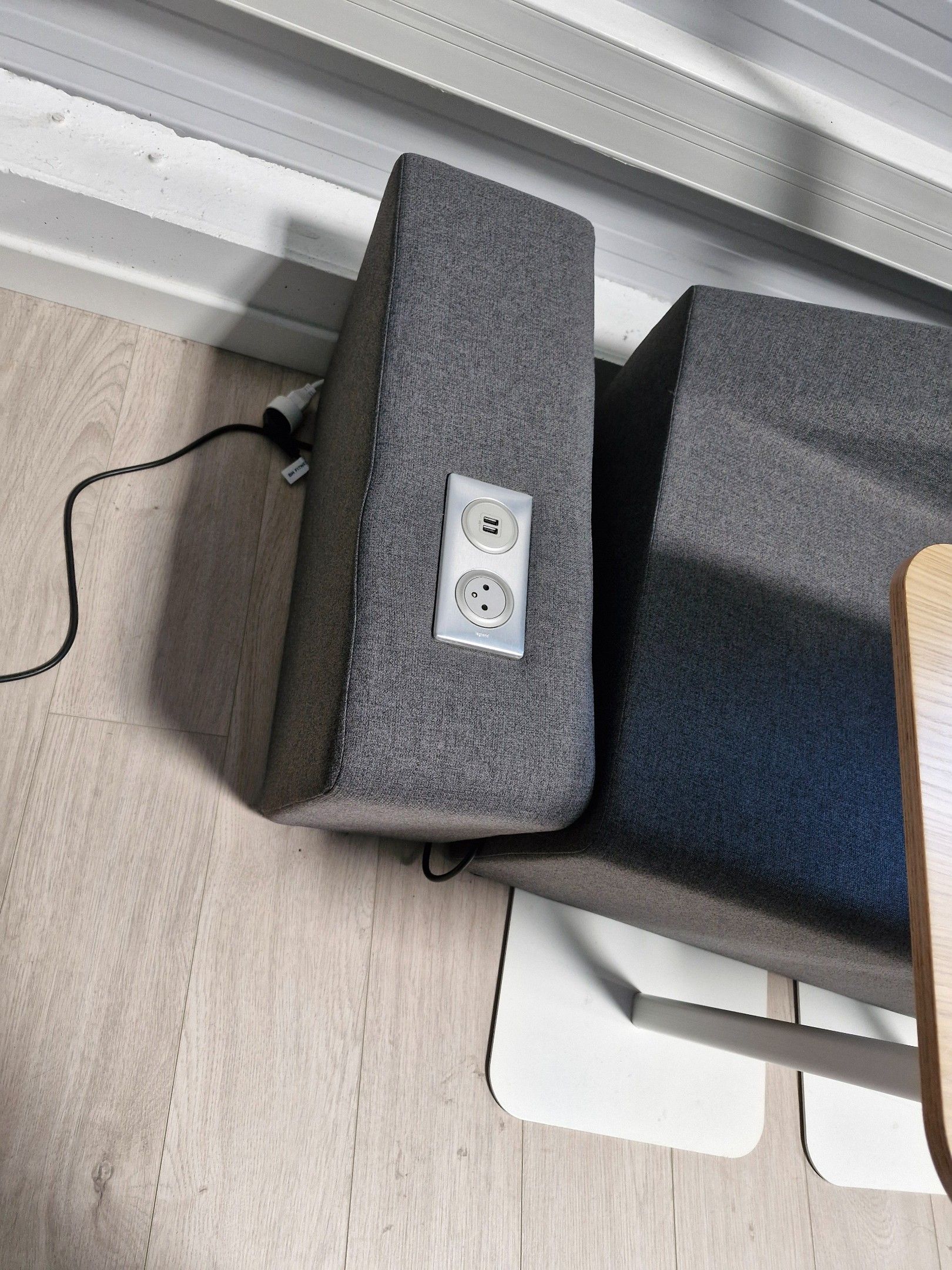 Canapé en tissu gris et bleu avec retour gris avec prises. On y joint deux tables en mélaminé pieds métal blanc