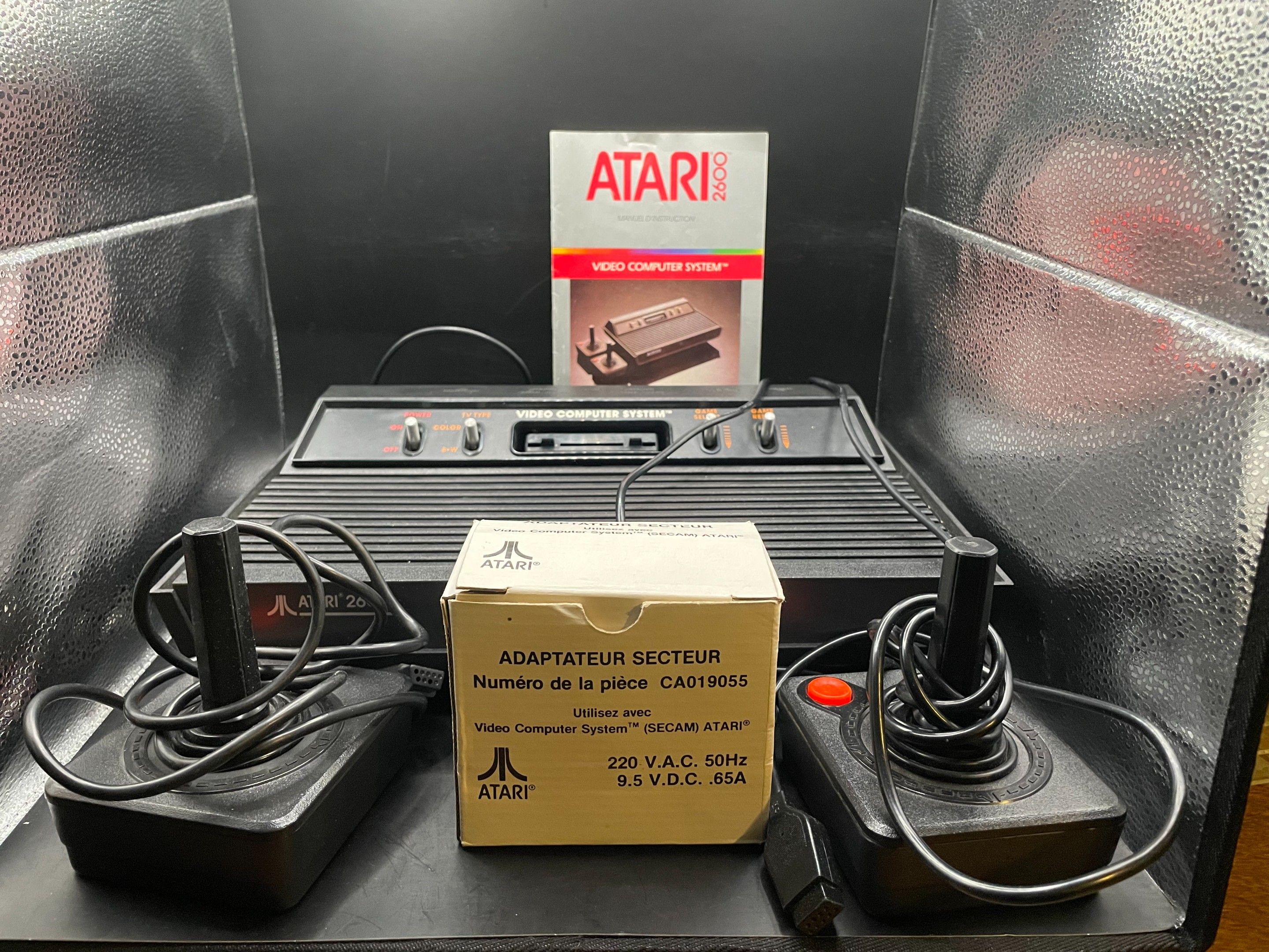 Console Atari 2600 dans sa boite d'origine (câbles, notice et deux manettes comprises)
