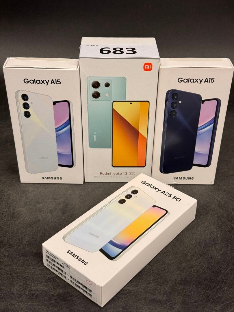 4 TELEPHONES PORTABLES : REDMI NOTE 13 / SAMSUNG GALAXY A25 & A15 (avec scellés) EXPEDITION POSSIBLE (ce lot chez vous en France métropolitaine pour 27,45€) Lot issu de colis non réclamés : état de fonctionnement non garanti, pouvant être bloqué)