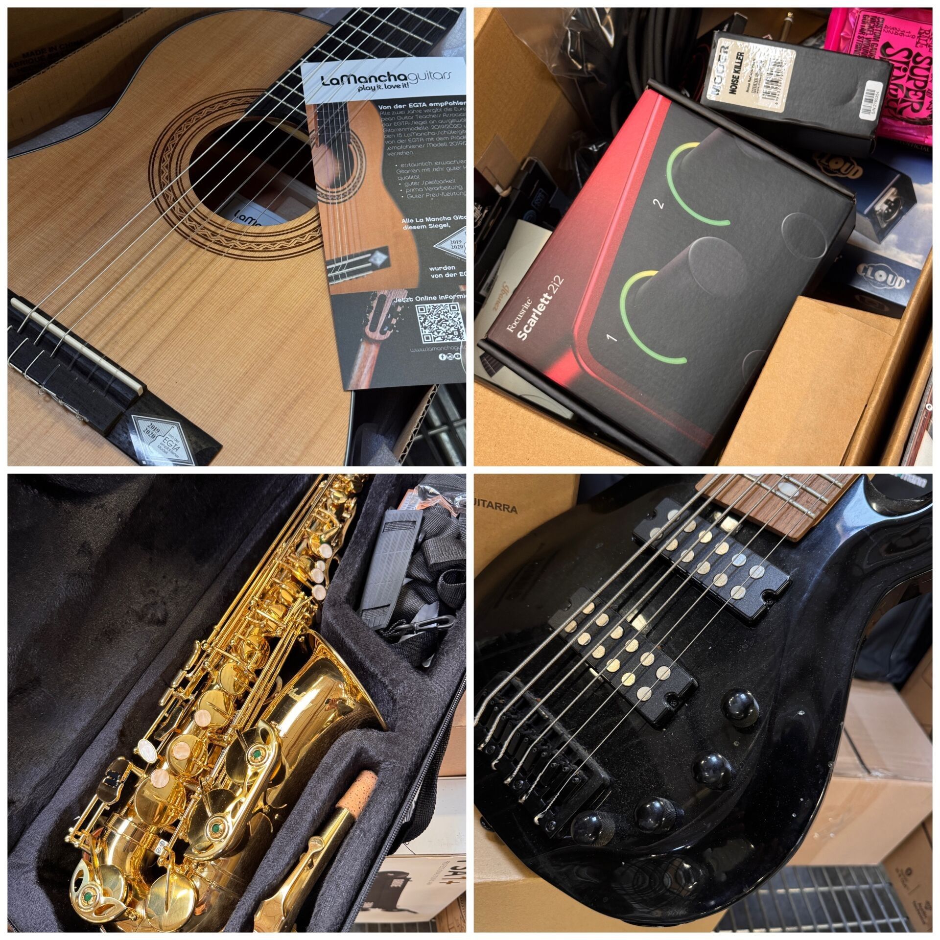 FORT ENSEMBLE DE MATERIEL DE MUSIQUE DONT GUITARE, CLAVIER, HOUSSE, MICRO, CD / YAMAHA, LA MANCHA, FOCURSITE, MUSLADY (expédition sur devis) Lot issu de colis non réclamés : état de fonctionnement non garanti.