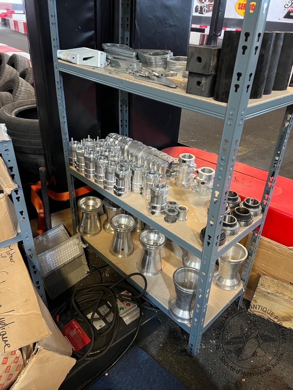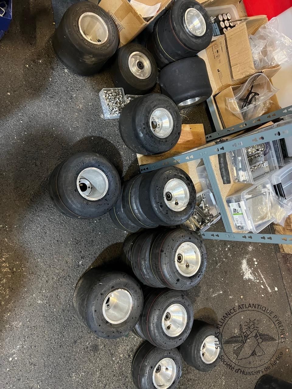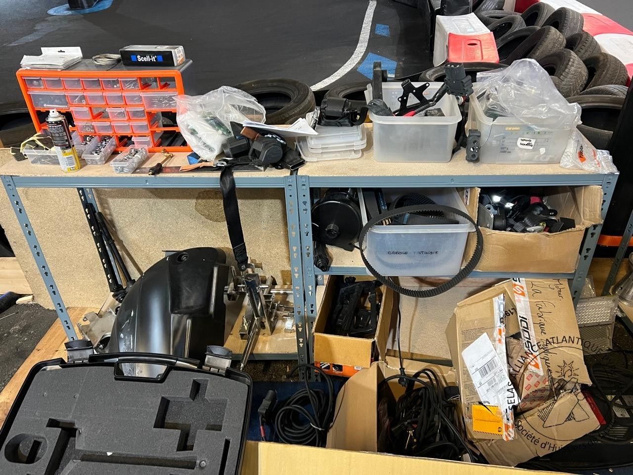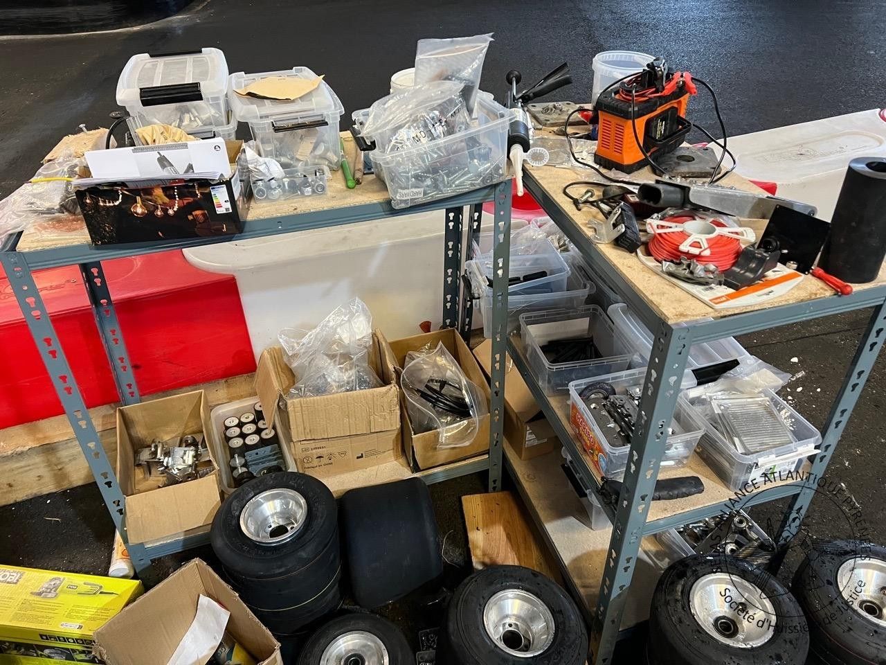 Un lot de pièces détachées de kart avec divers outils dont appareil de géométrie, pneus neufs, jantes moyeux et étagère