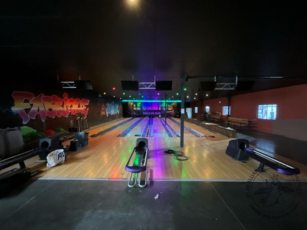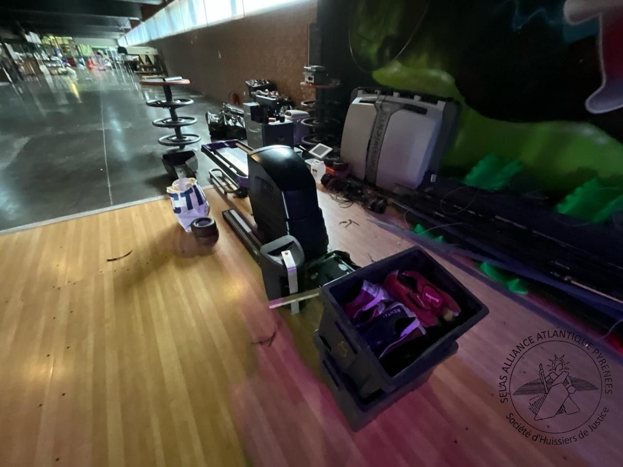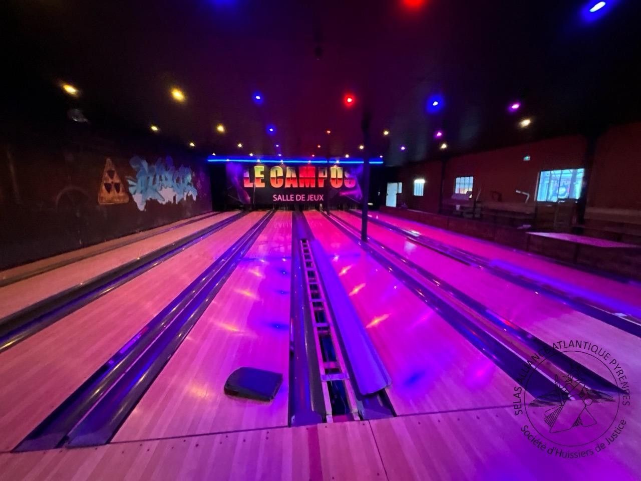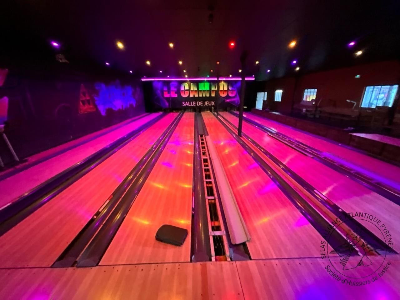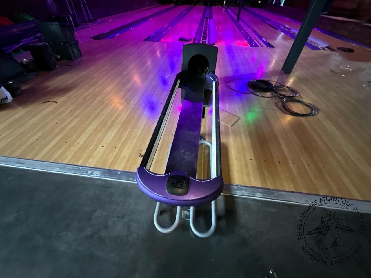 Structure de bowling composée de 6 pistes, 3 distributeurs de boules, bancs en bois, lot de chaussures, lot de boules, petit mobilier.