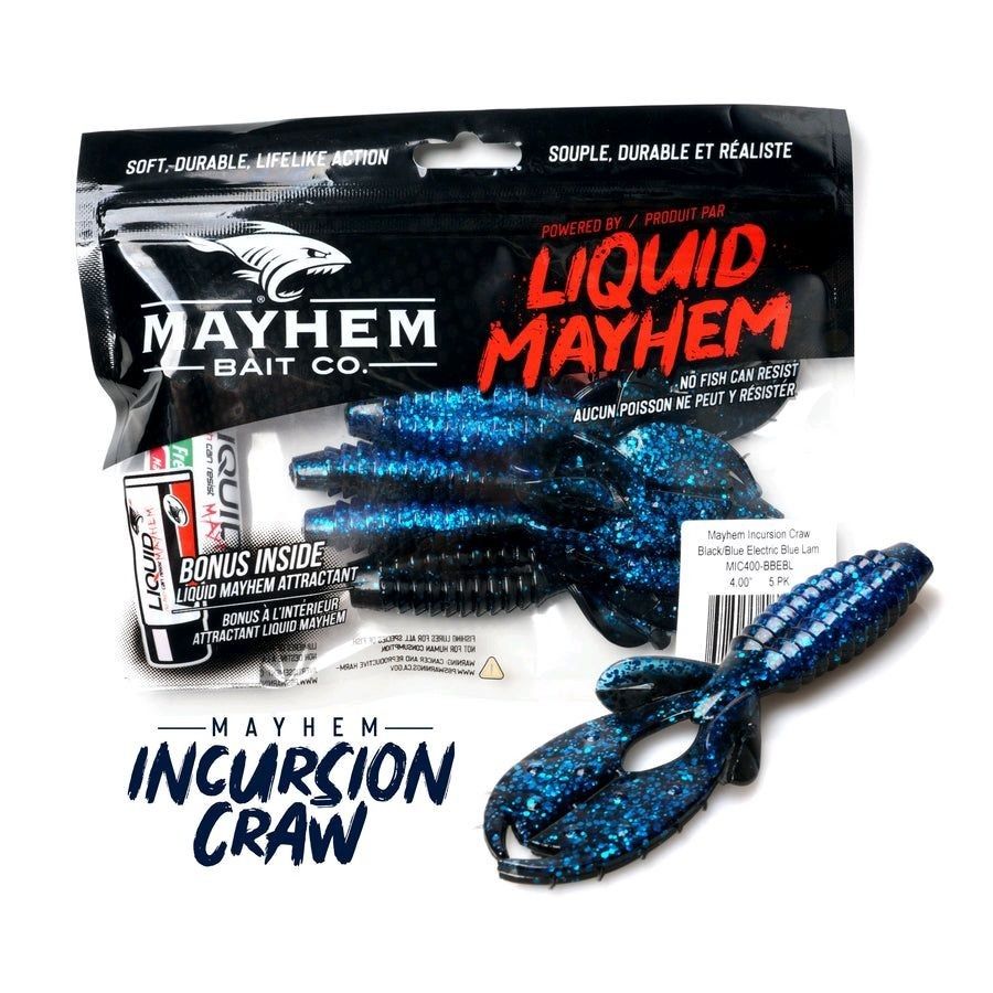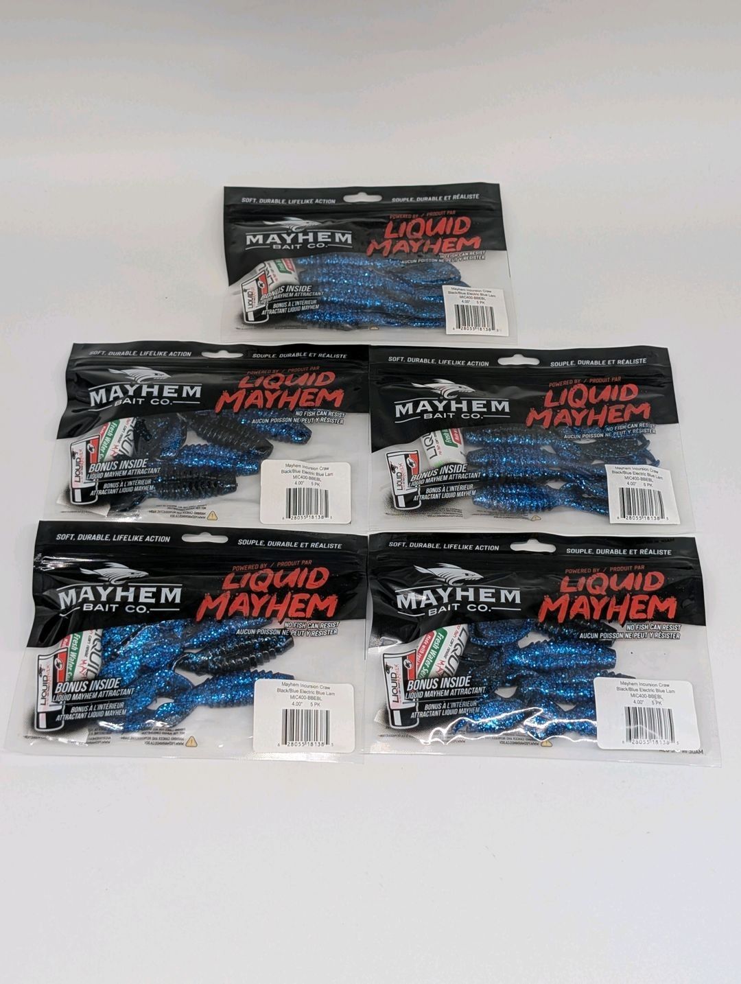 Lot de 15 pochettes de 5 leurres de pêche Mayhem Incursion Craw Black/Blue Electric Blue Lam 4", vendu avec attractant - NEUF - TVA RÉCUPÉRABLE - TVA Récupérable - Ce lot chez vous partout en France métropolitaine à partir de 12,24 € - Ce lot chez vous partout en Europe à partir de 18,00 €