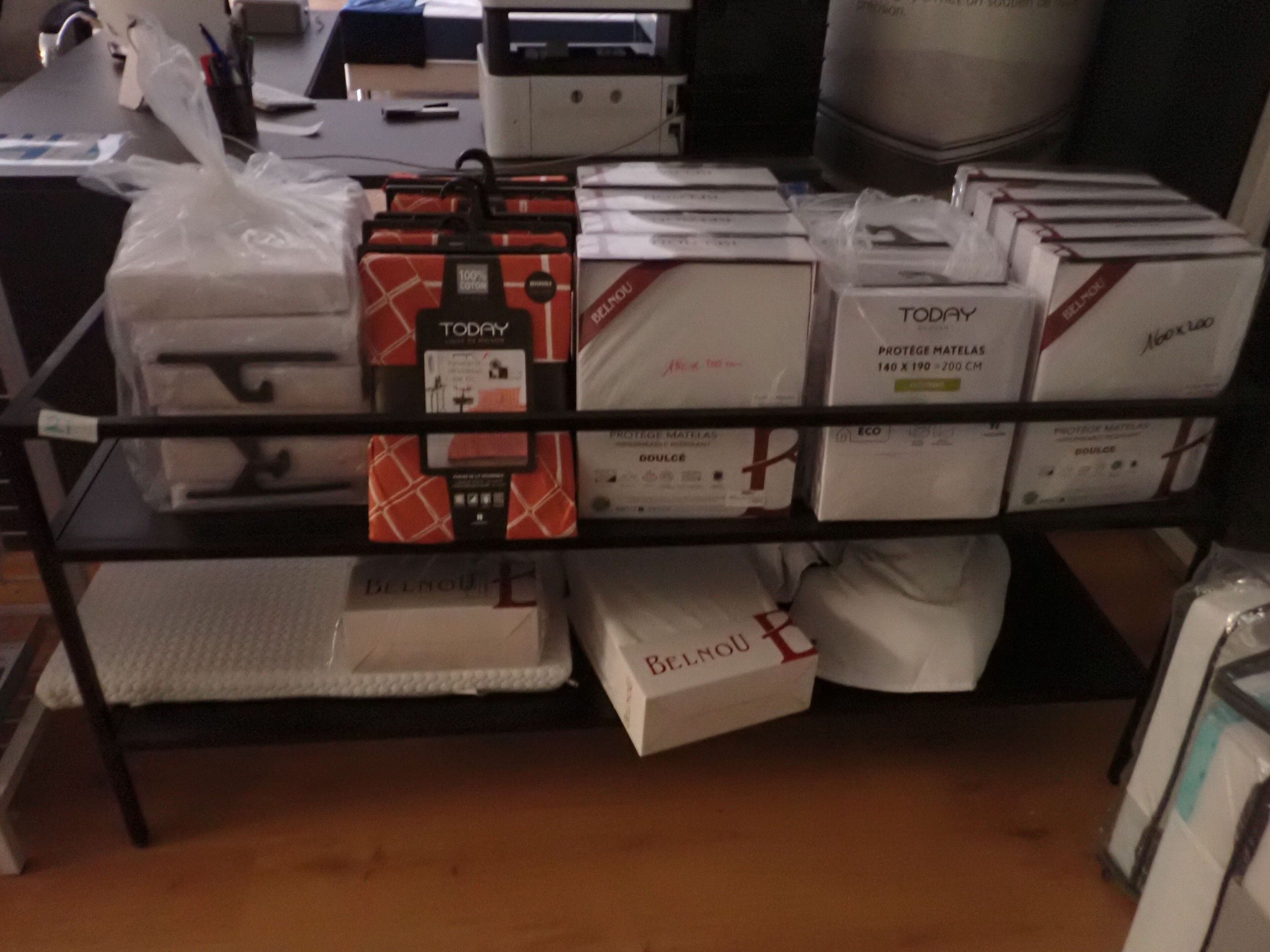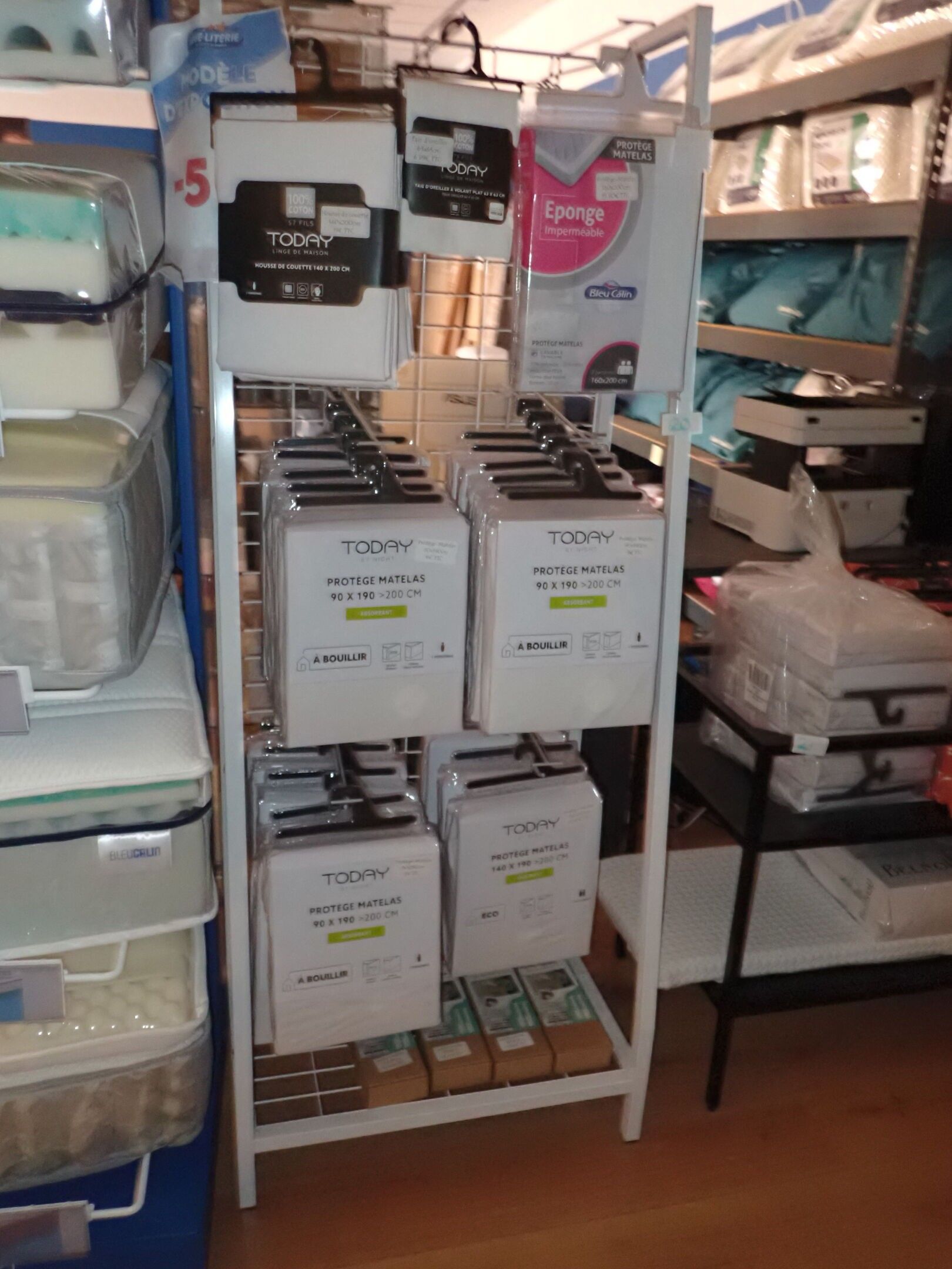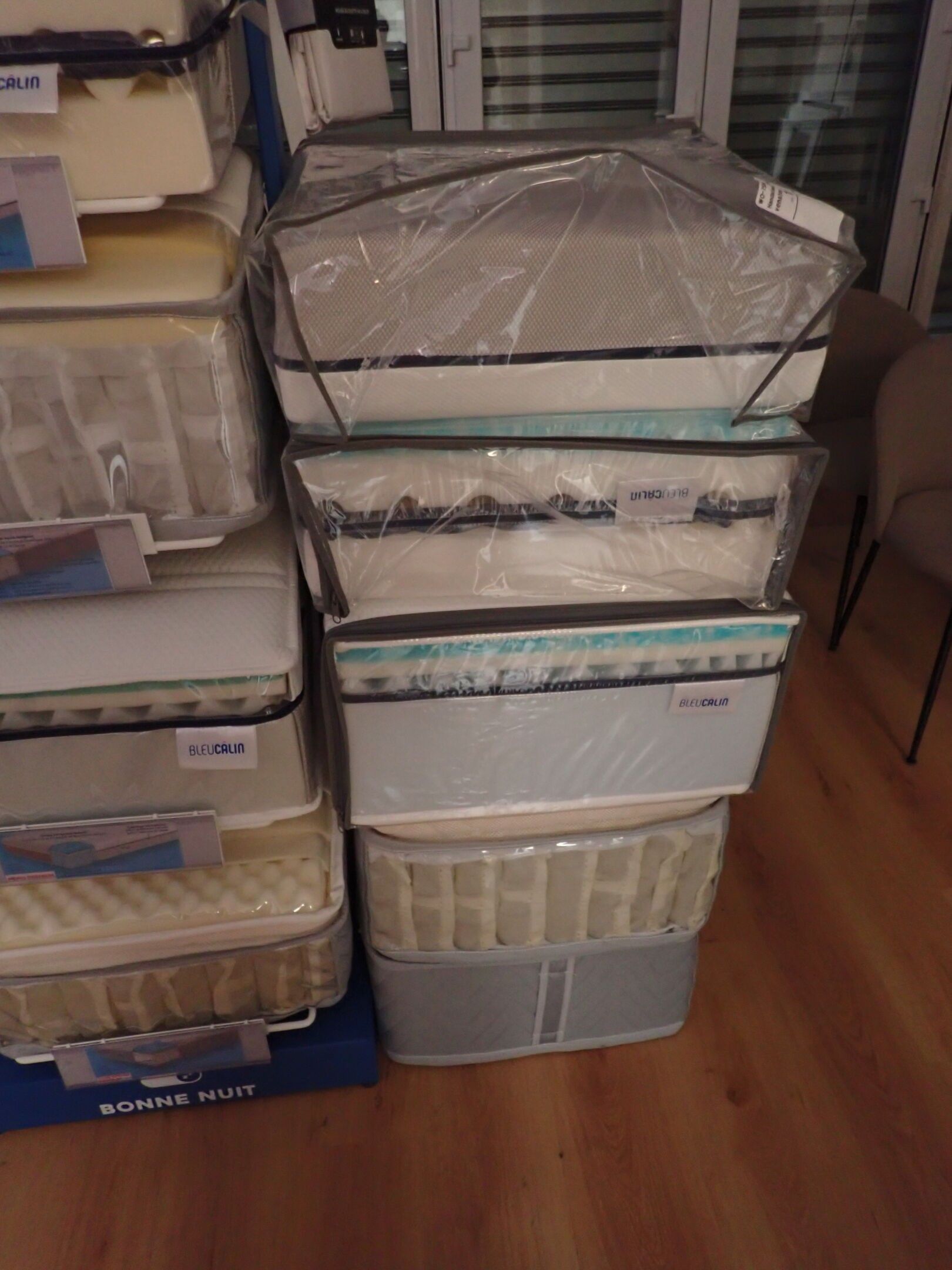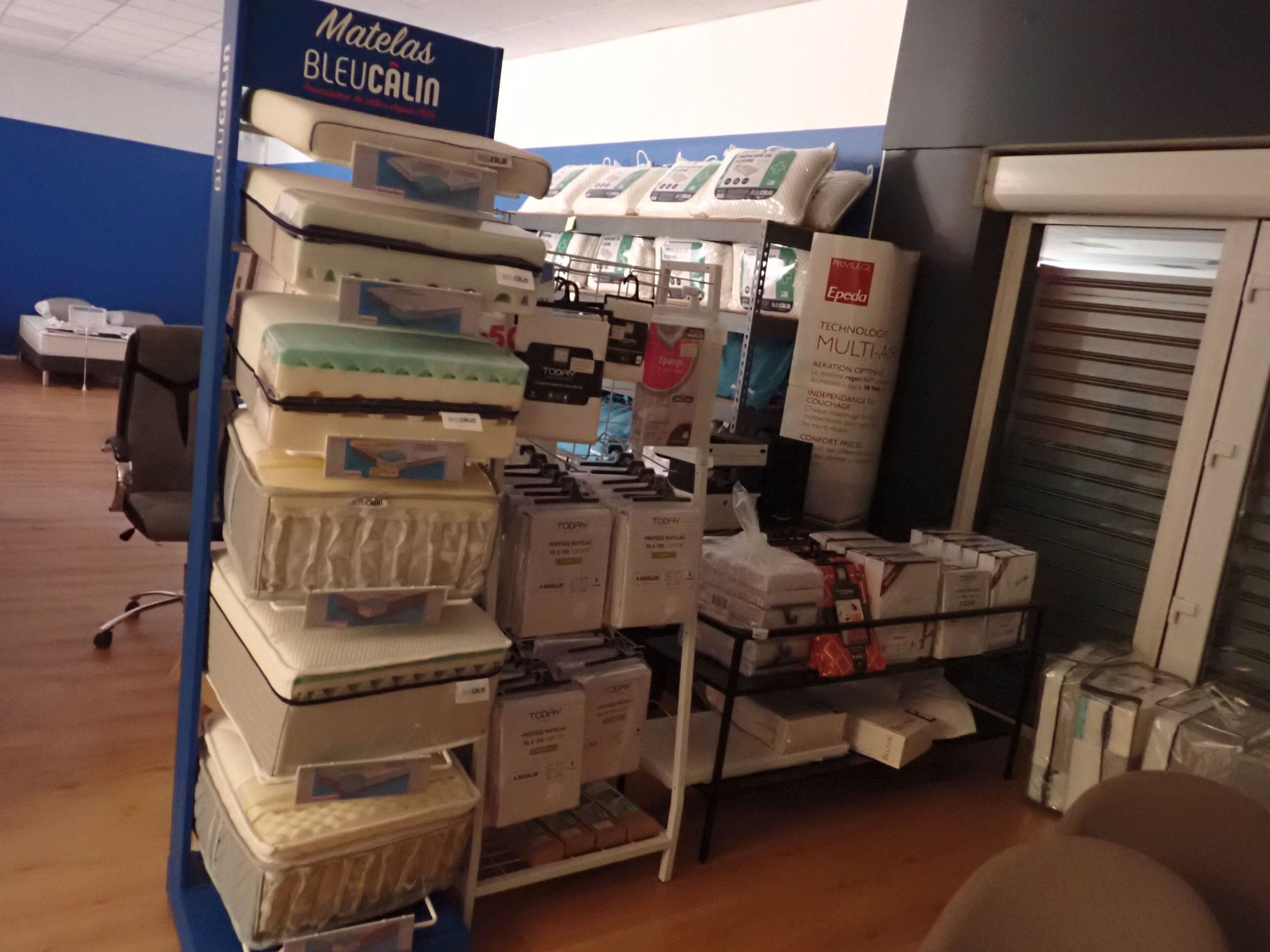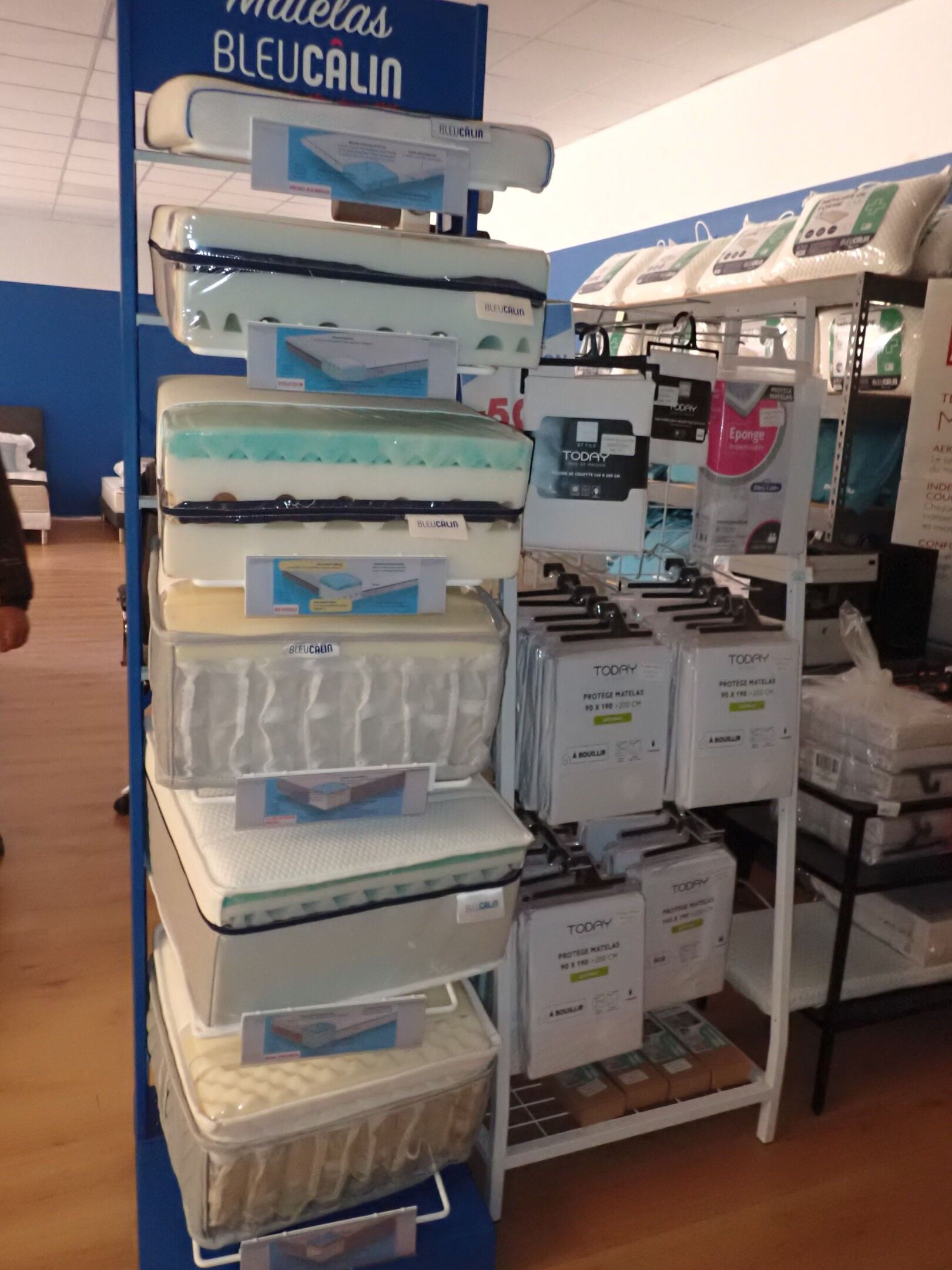 Lot présentoirs divers : vitrine 4 faces mobile 5 niveaux 38x38xh178, 1 présentoir métal bleu BLEUCALIN pour matelas 6 niveaux 57x54xh210, présentoir métal blanc grillagé 66x42xh172, bac soldeur avec échantillons matelas, vendus vides, Lot judiciaire, Mise à prix 50