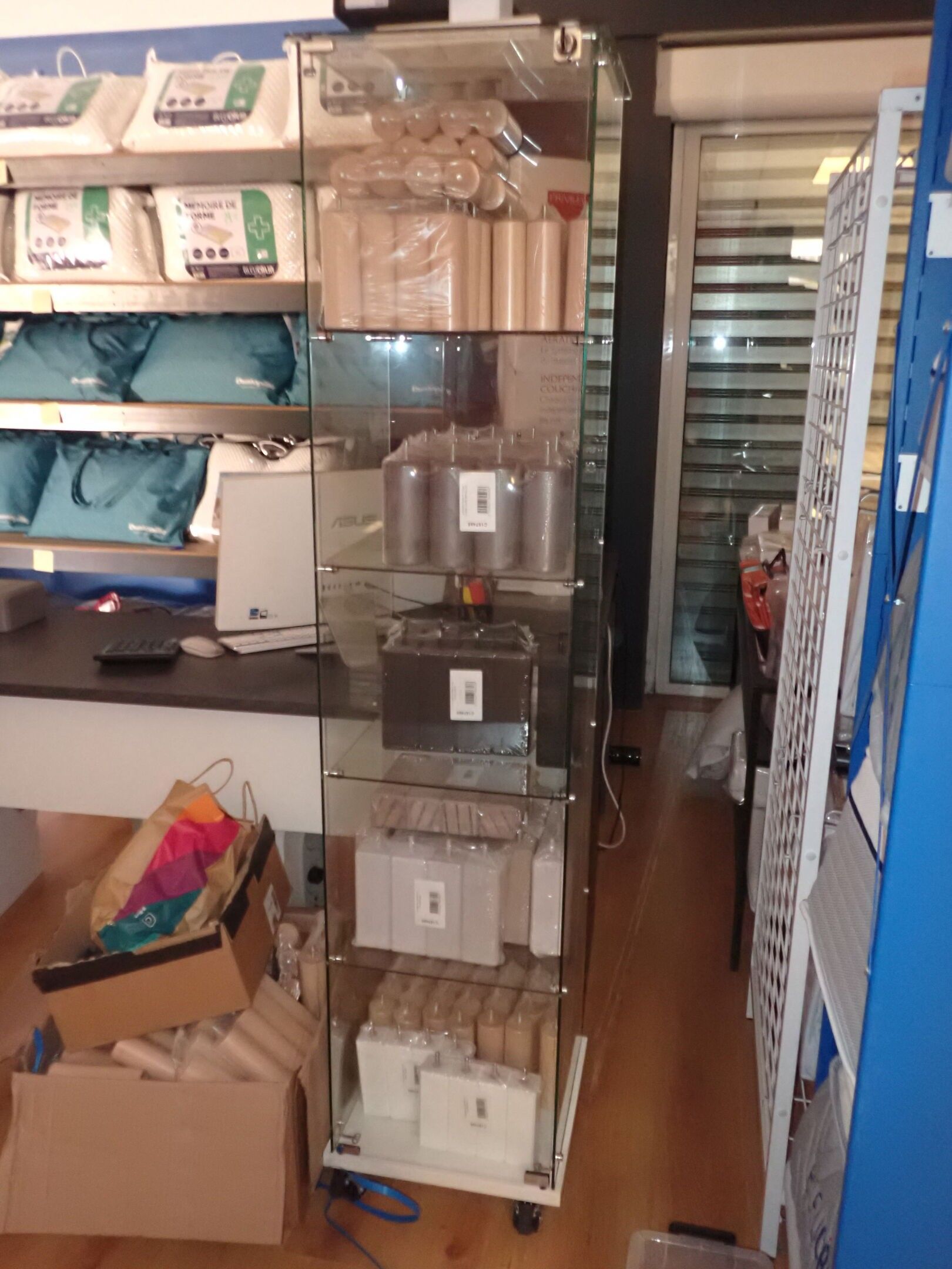 Lot présentoirs divers : vitrine 4 faces mobile 5 niveaux 38…