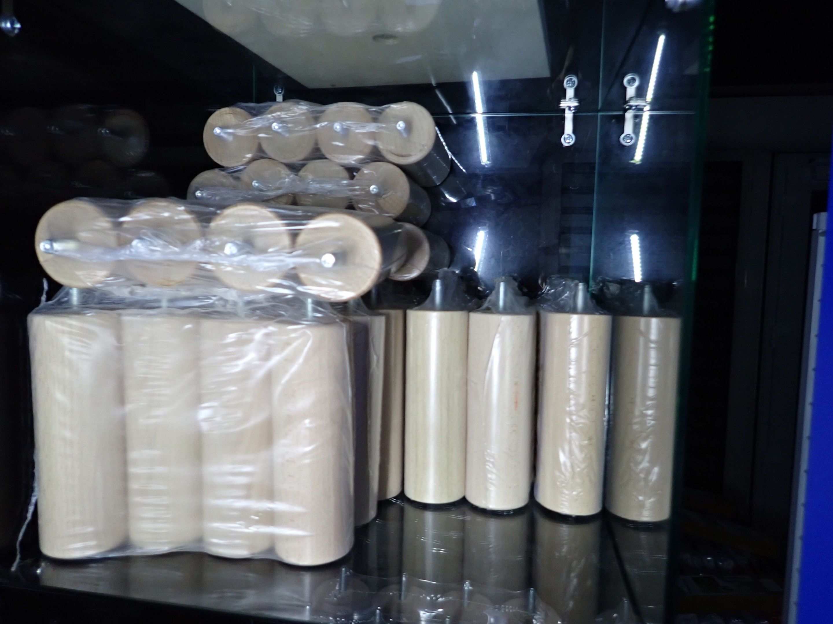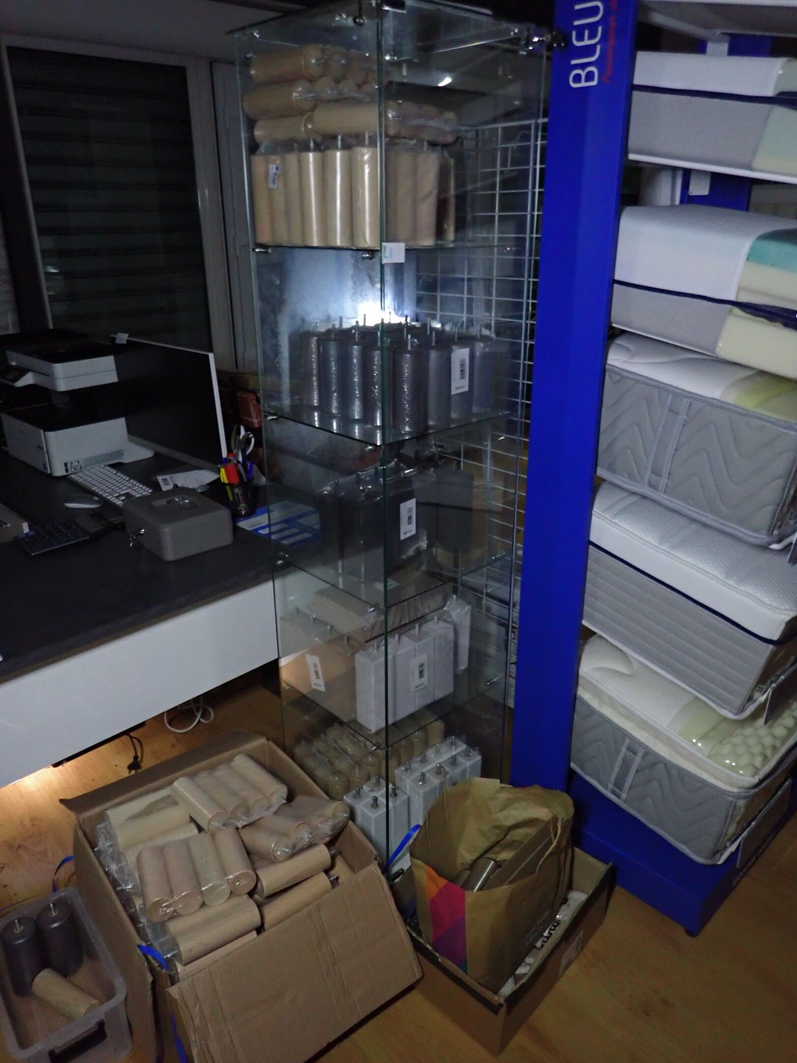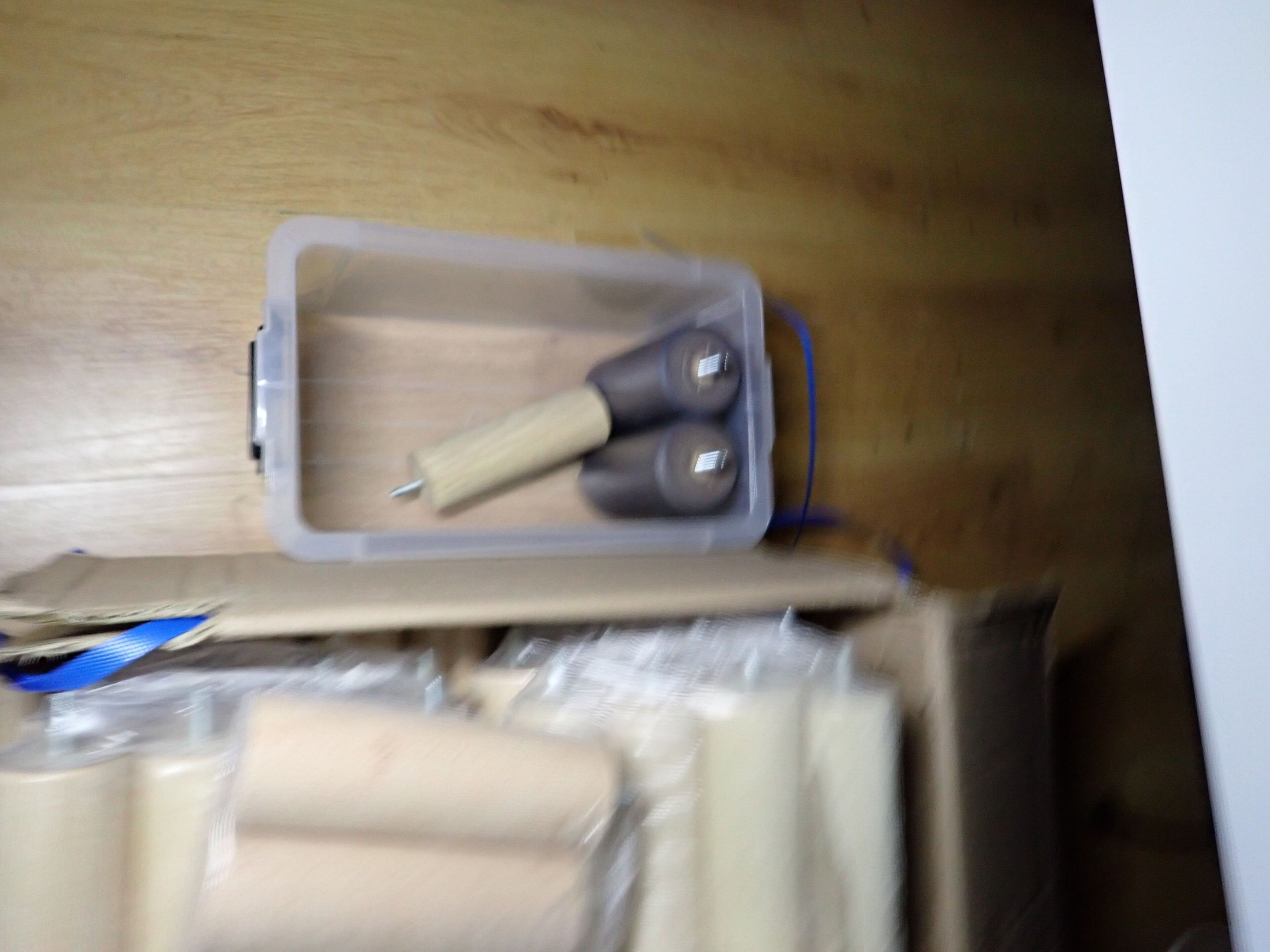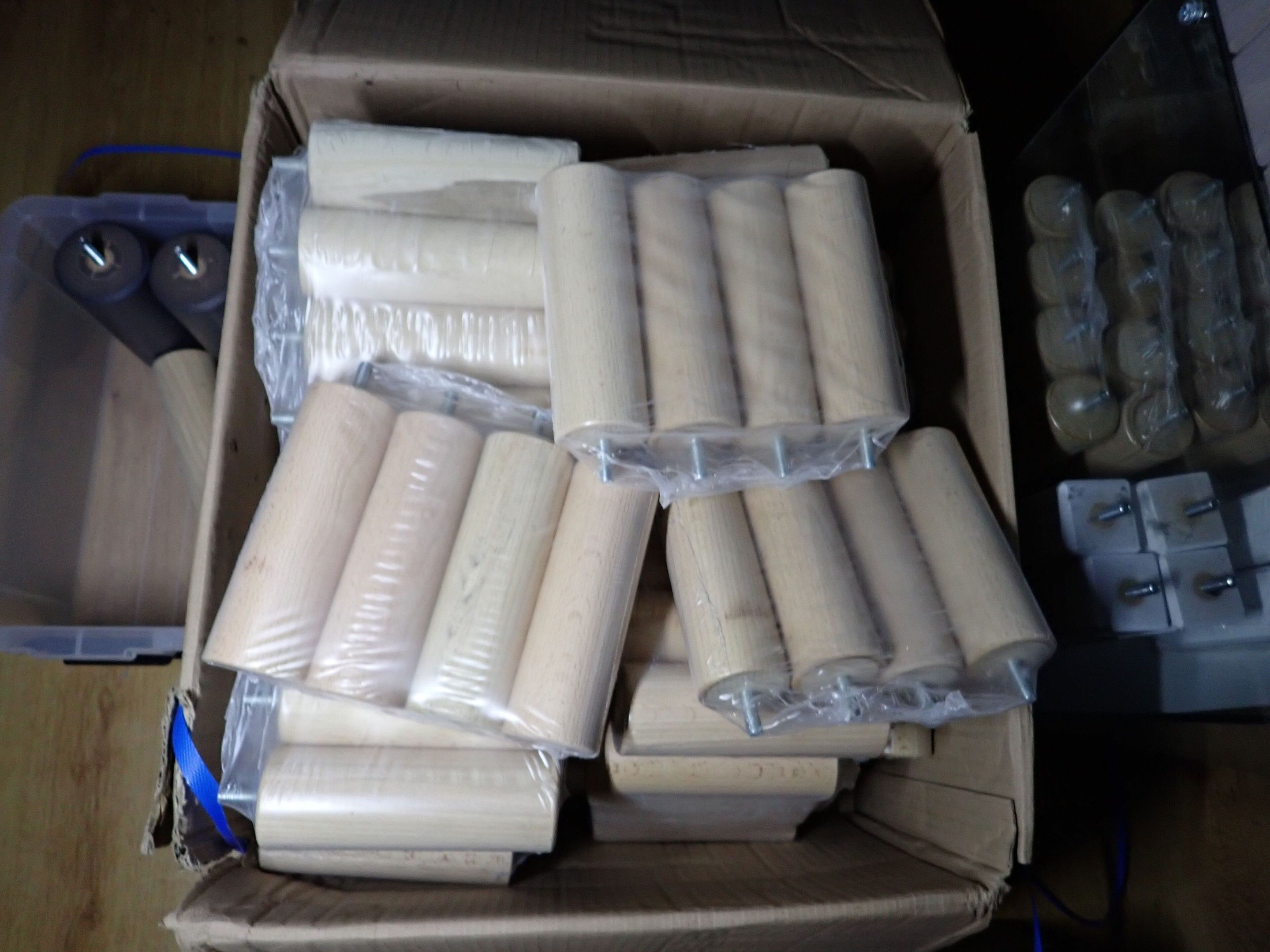 Environ 230 pieds de lits ronds, carré, gris, bois clair, vendus sans la vitrine, lot judiciaire, Mise à prix 60