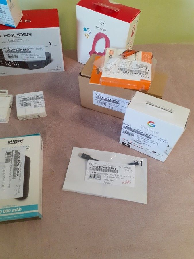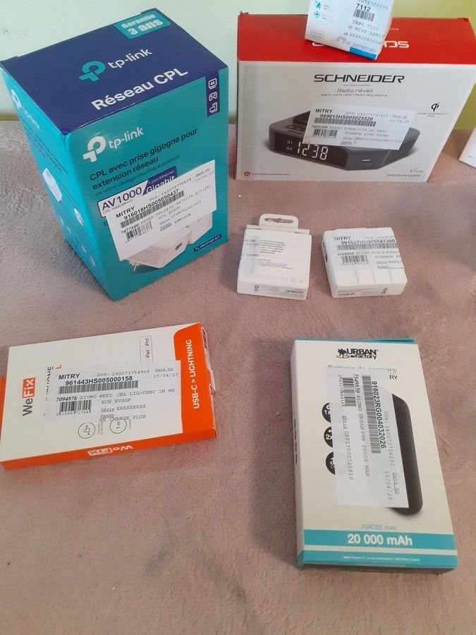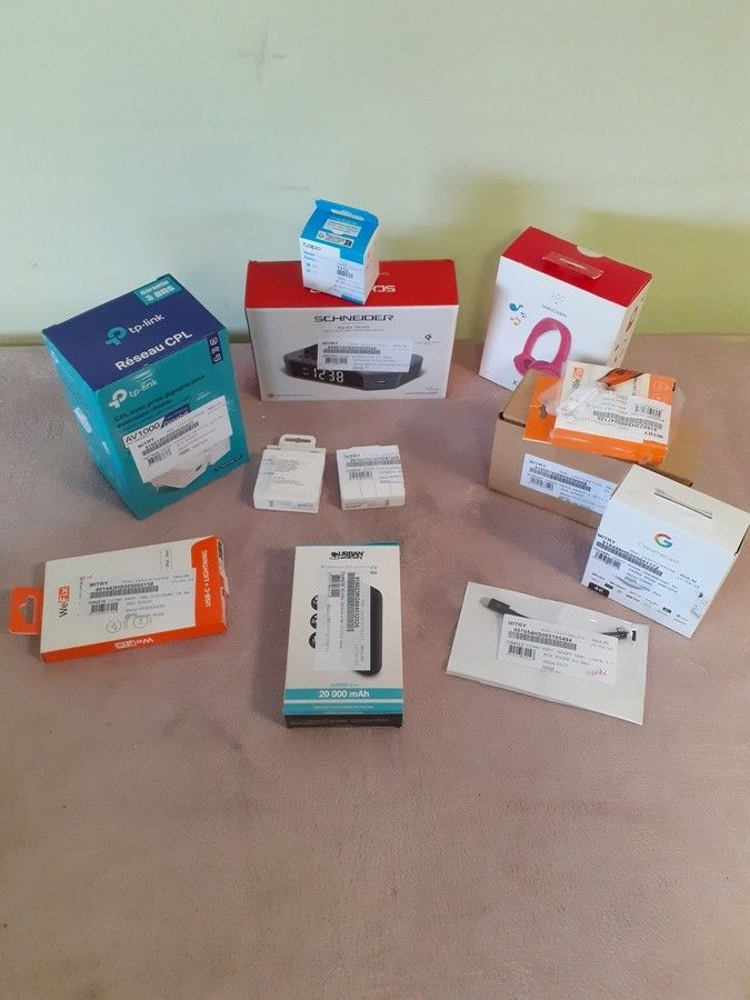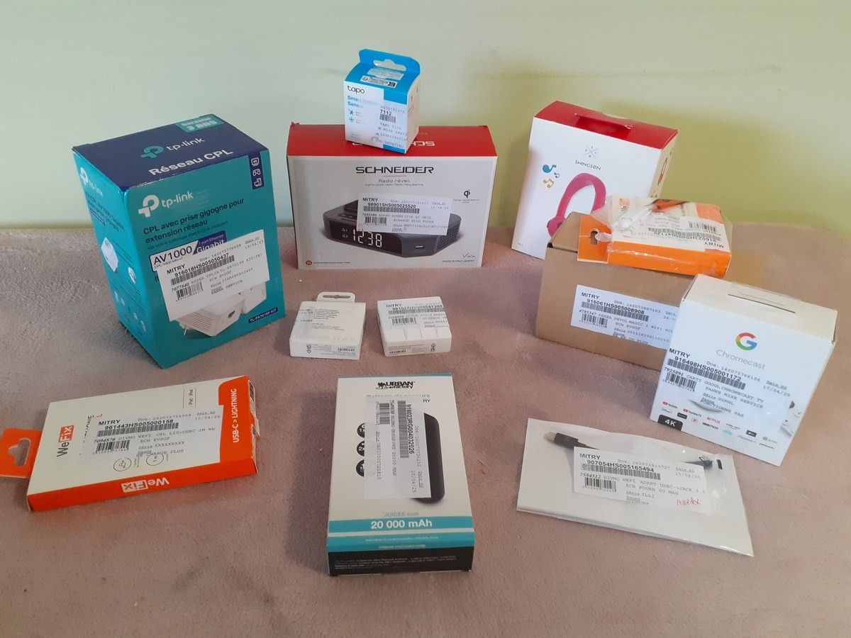 - 1 Chromecast, 2 écouteurs Apple, 1 câble iPhone USB-C, 1 câble coudé USB vers Lightning, 1 batterie de secours, 1 kit CPL AV1000 Gigabit avec prise gigone, 1 détecteur de mouvement, 1 radio réveil, 1 casque rose et 1 casque gaming bluethoo
