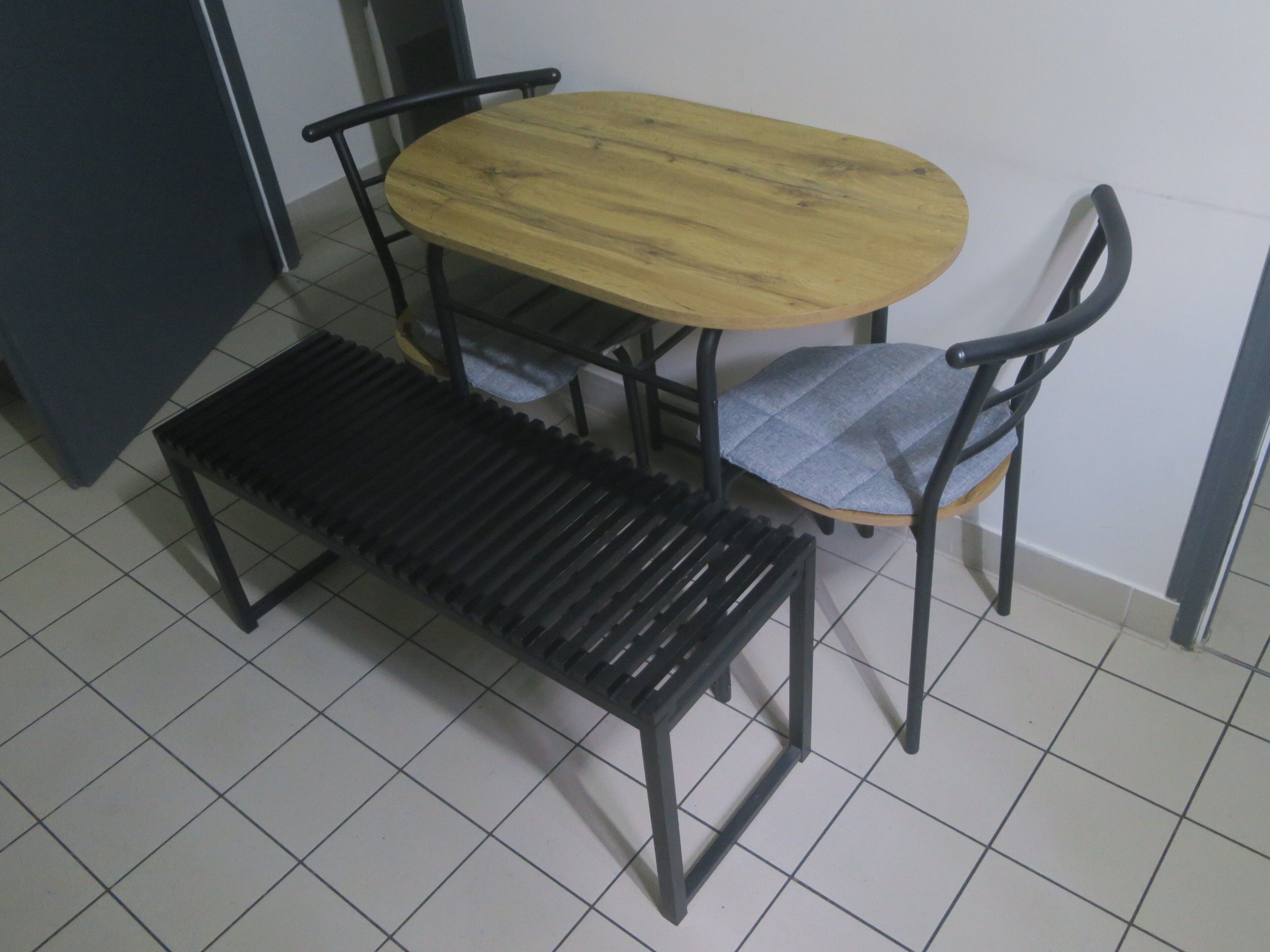 Banc alu marron, table ovale, 2 chaises Lot judiciaire Mise …