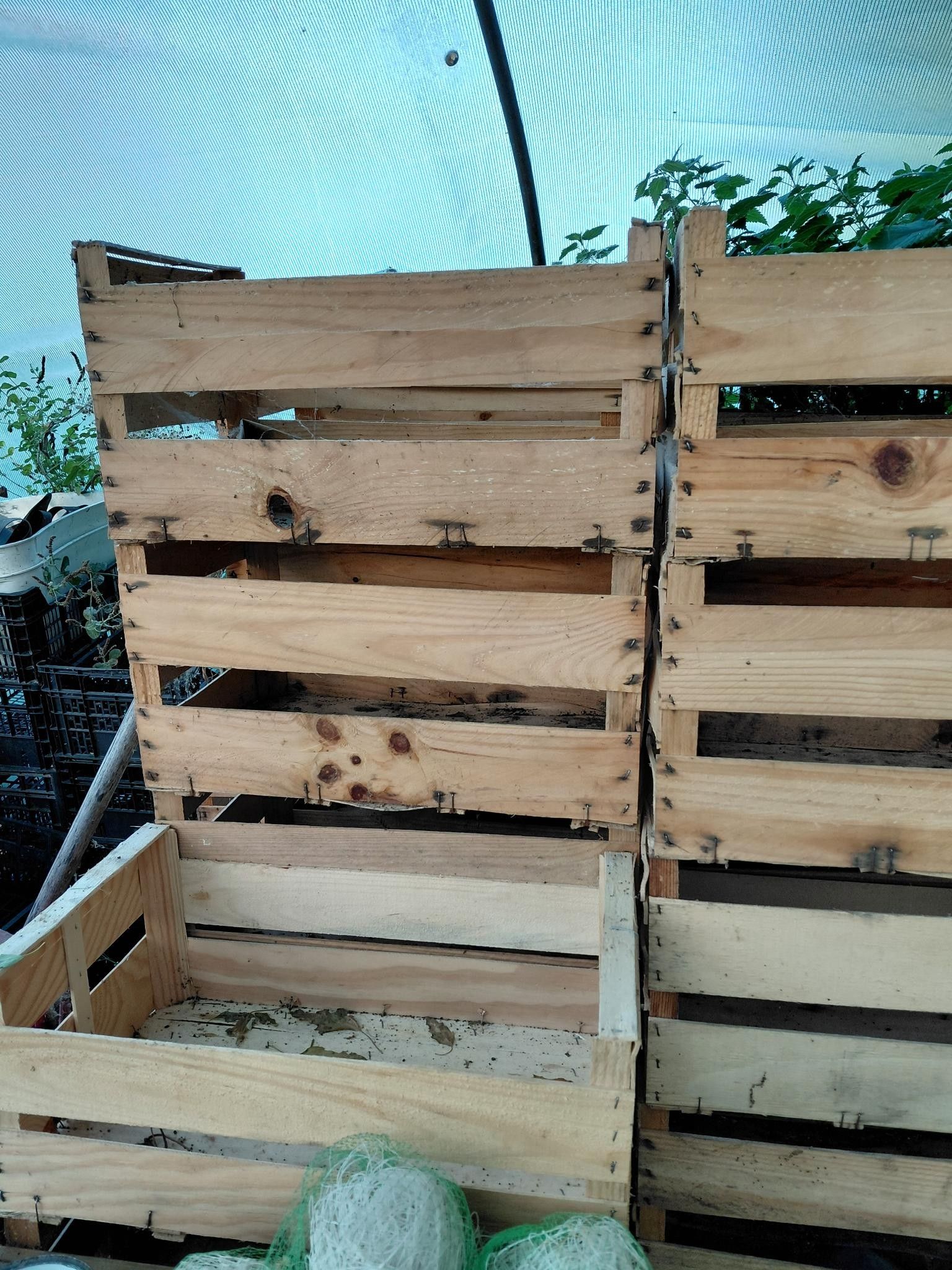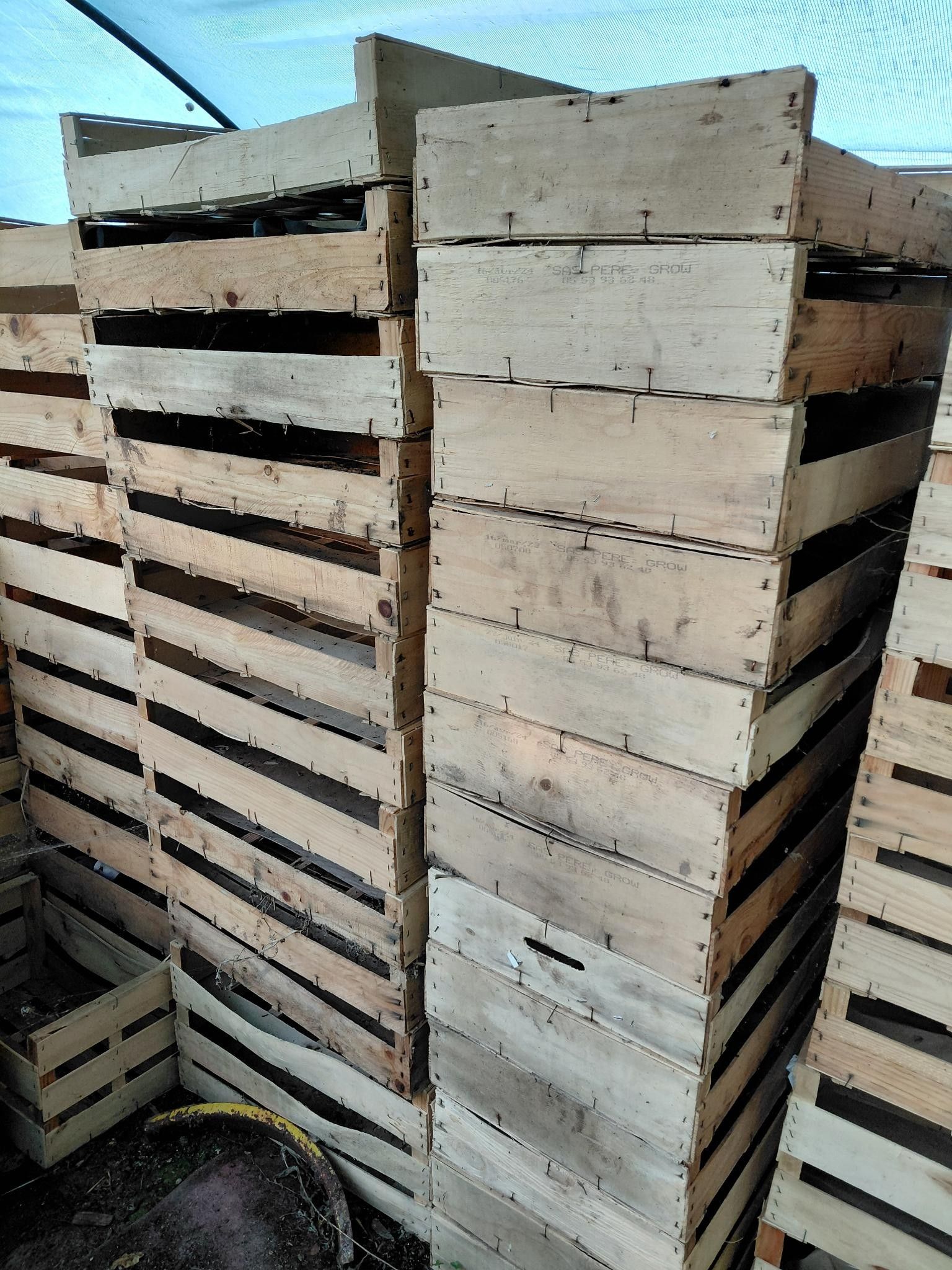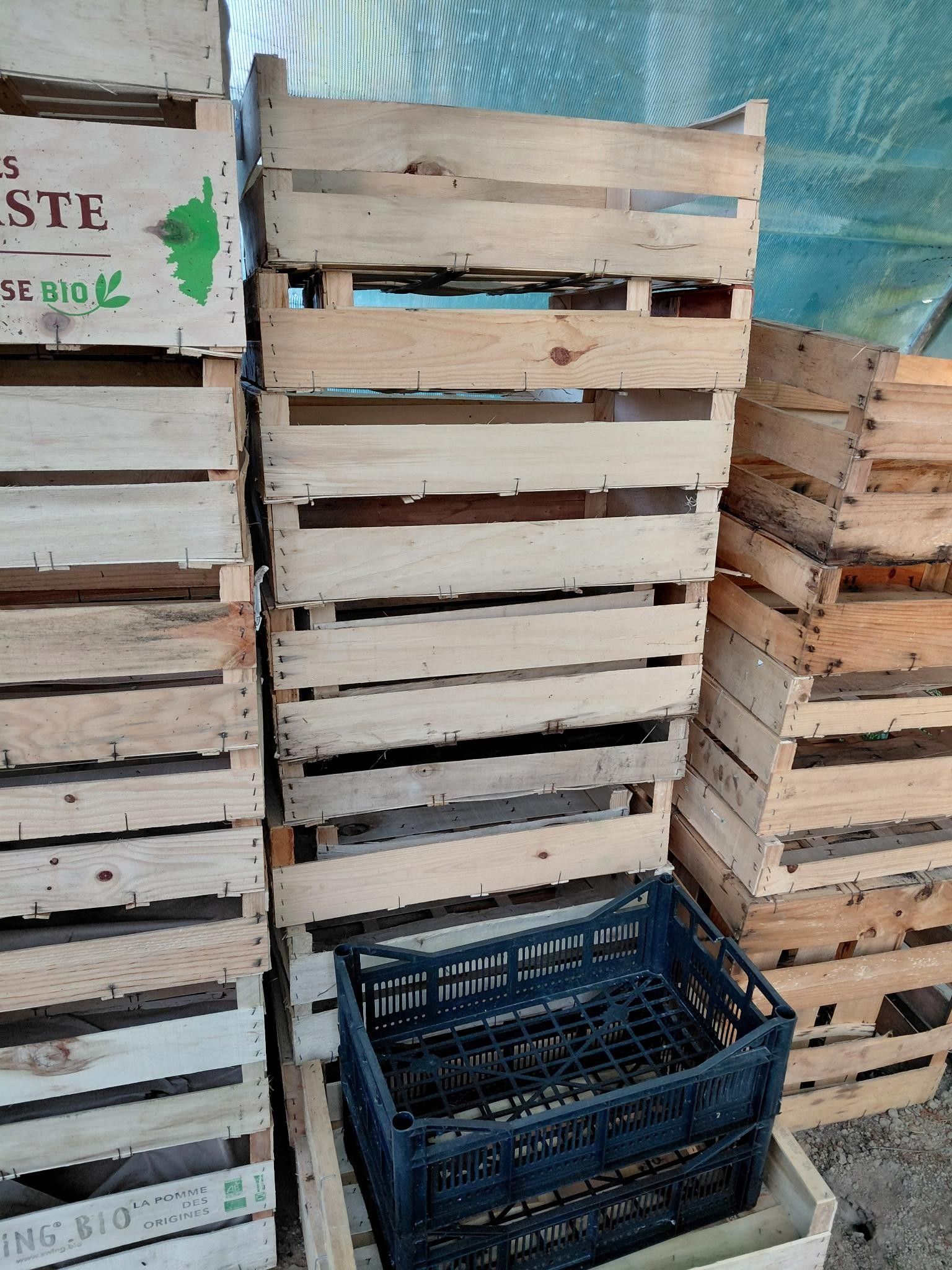 Lot de cagettes bois et plastiques, lot de tréteaux bois