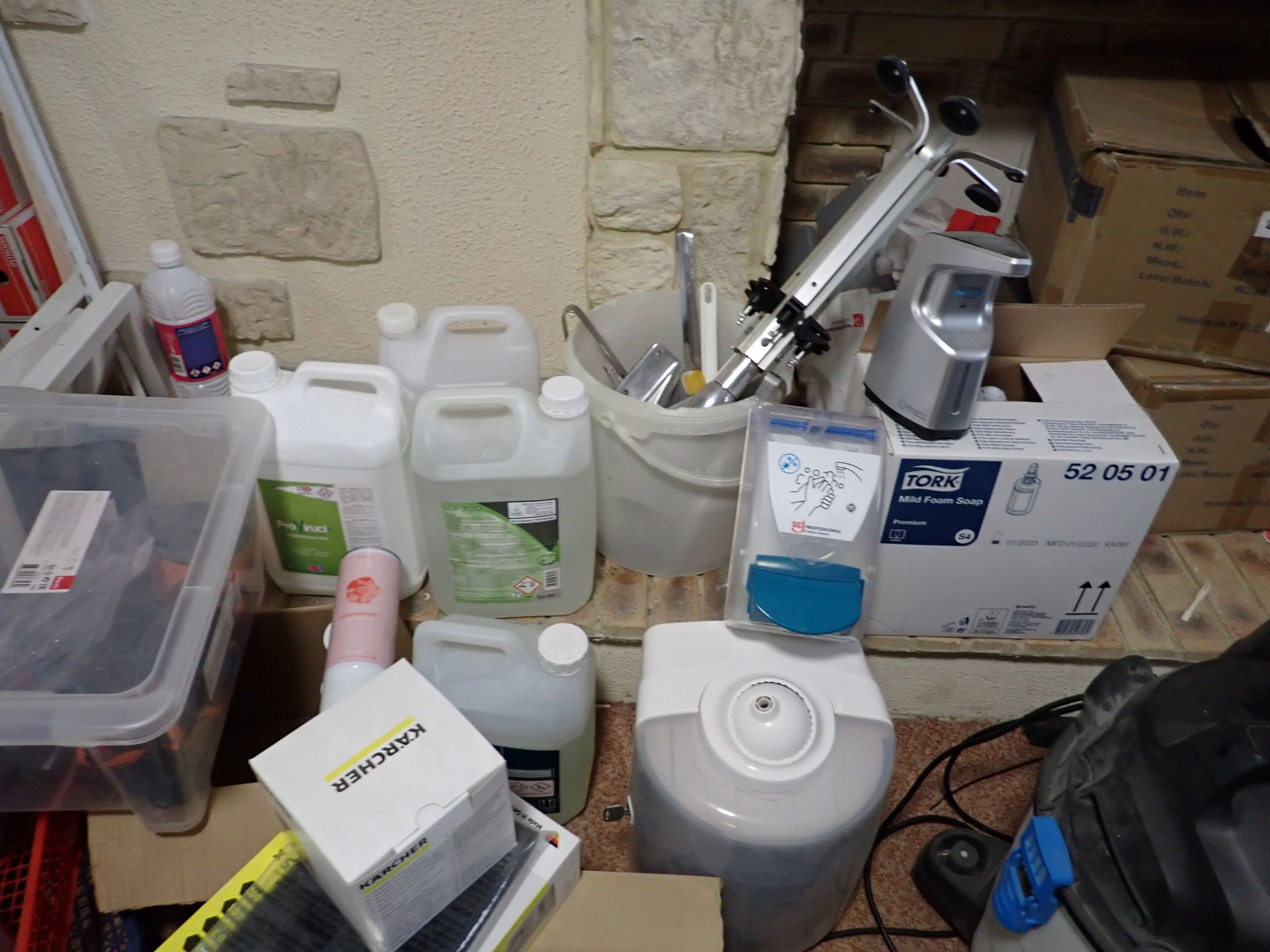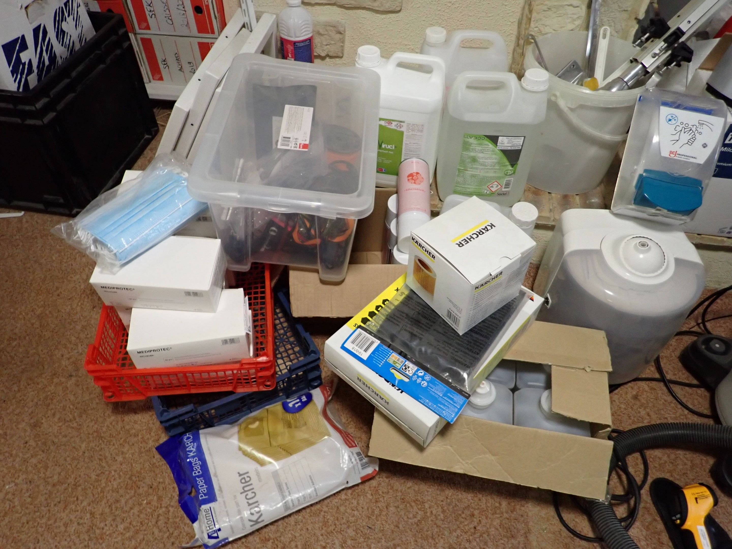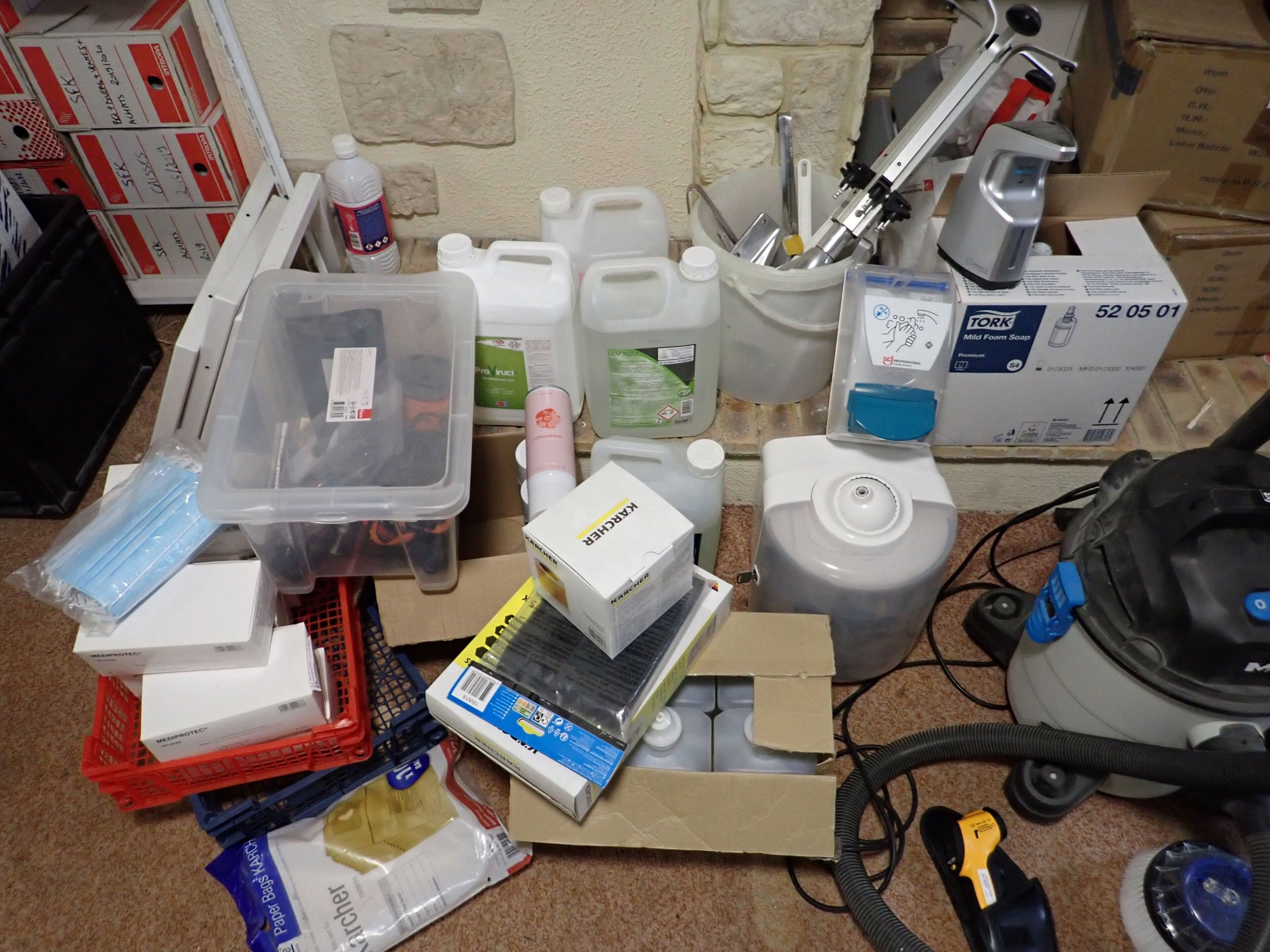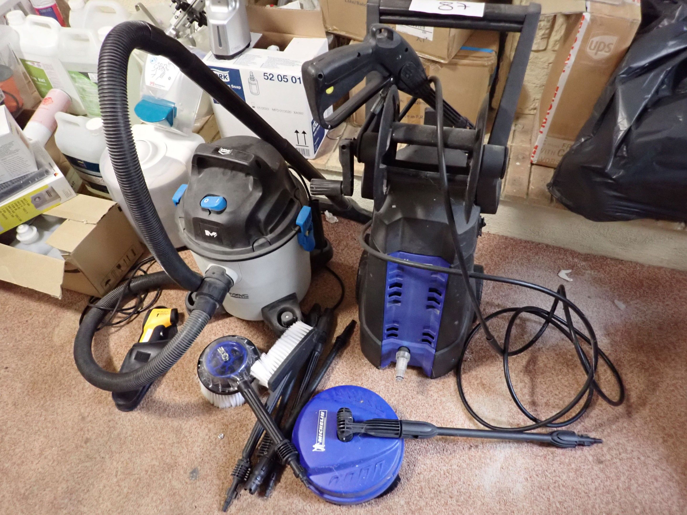 Laveur haute pression MICHELIN bleu et noir, aspirateur MAC, distributeur de savon, distributeur de papier, distributeur de gel hydroalcoolique, 8 boites de masques, savons et produits de nettoyage divers, Lot judiciaire, Mise à prix 40