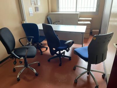 deux bureaux avec retour, trois chaises fixes, deux fauteuil…