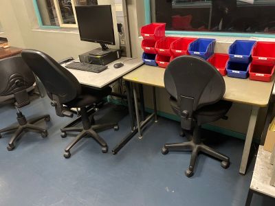 trois bureaux droits et une chaise sur roulettes, un ordinat…