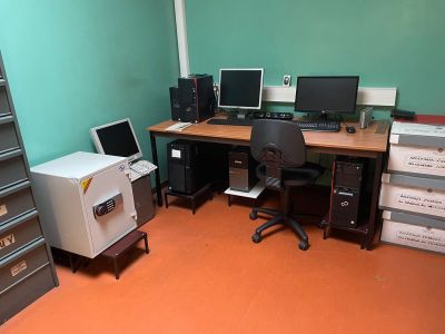 un bureau, une table informatique, quatre petites tables don…