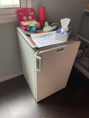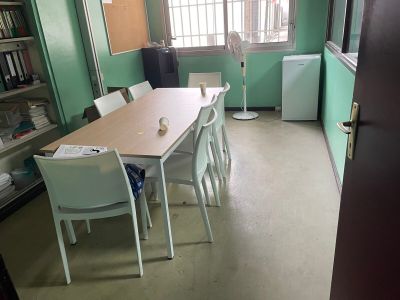 une table, huit chaises, un ventilateur et un réfrigérateur …