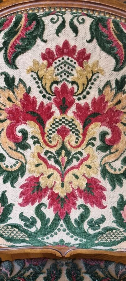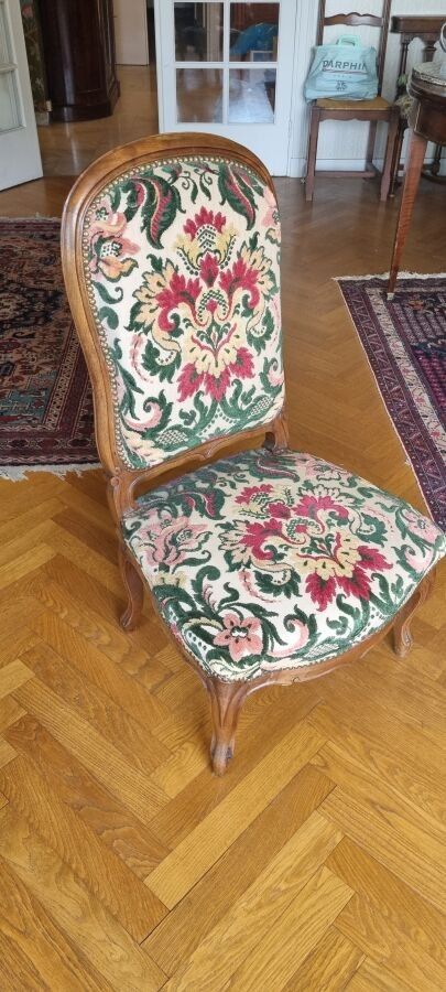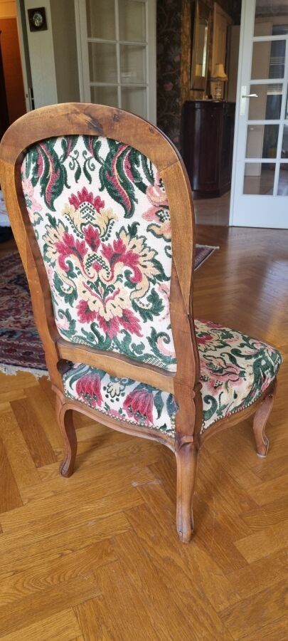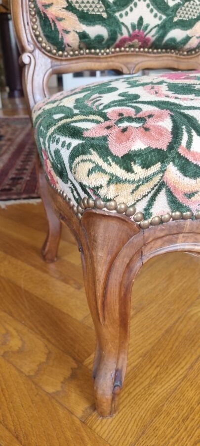 Chauffeuse en bois mouluré à dossier droit et garnie d'un tissu à décor floral polychrome. Style Louis XV