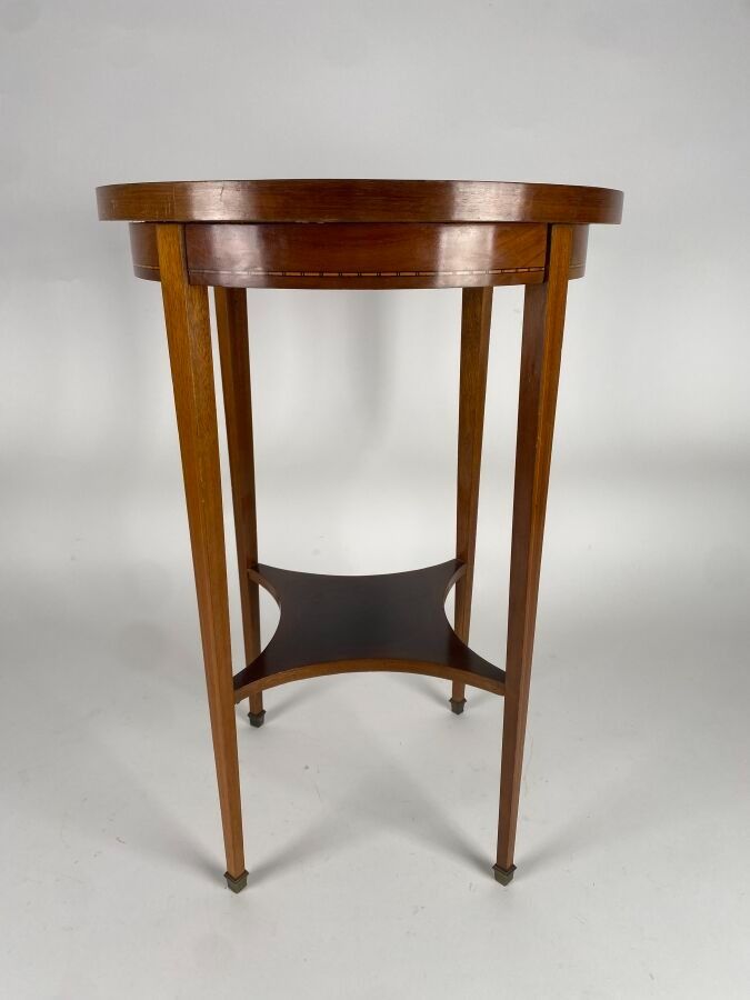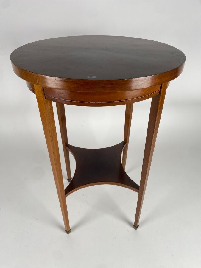 Guéridon en bois de placage à décor de marqueterie de filets bicolores en ceinture. Il est à plateau rayonnant et repose sur quatre pieds fuselés terminés par des sabots et reliés par une tablette d'entrejambe.