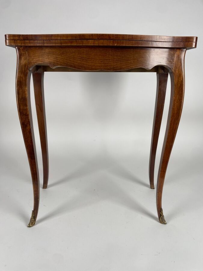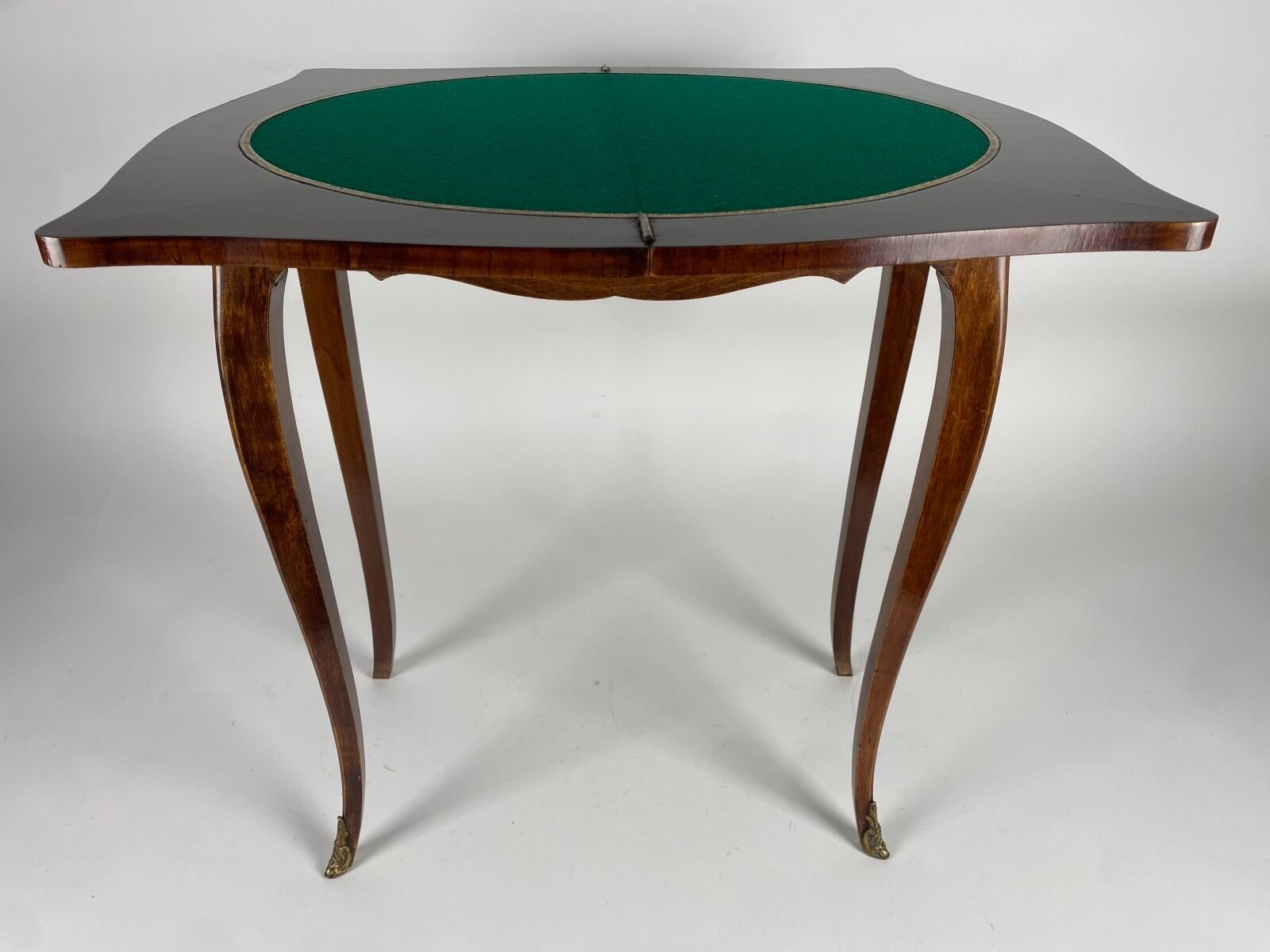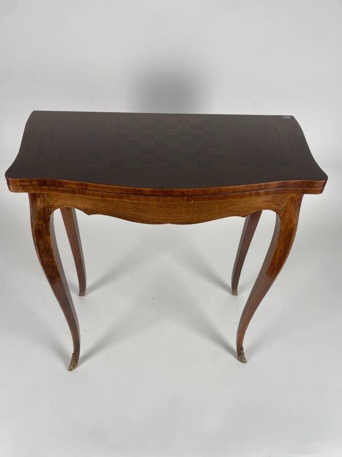 Table à jeu en bois de placage à décor de marqueterie de damiers découvrant un jeu de tric-tac, plateau mouvementé ouvrant garni de feutre vert. Les pieds antérieurs terminés par des décors en bonze. Style Louis XV.