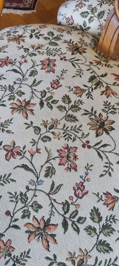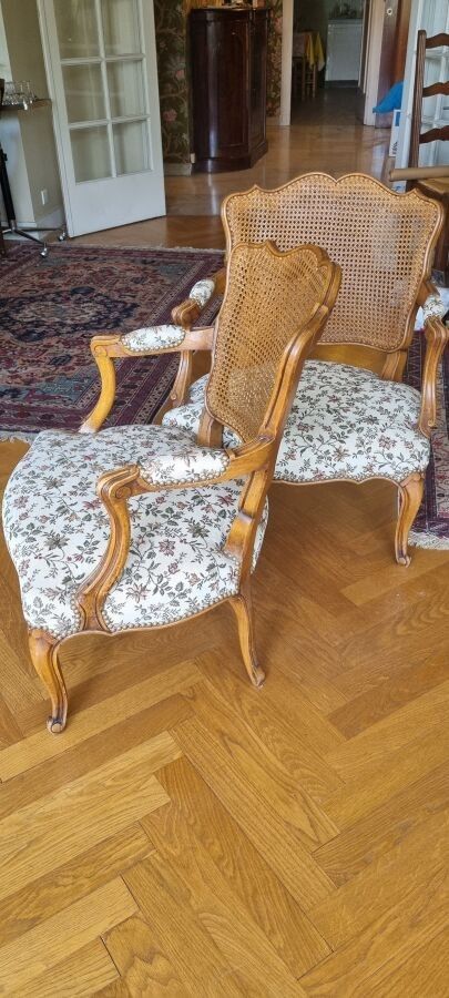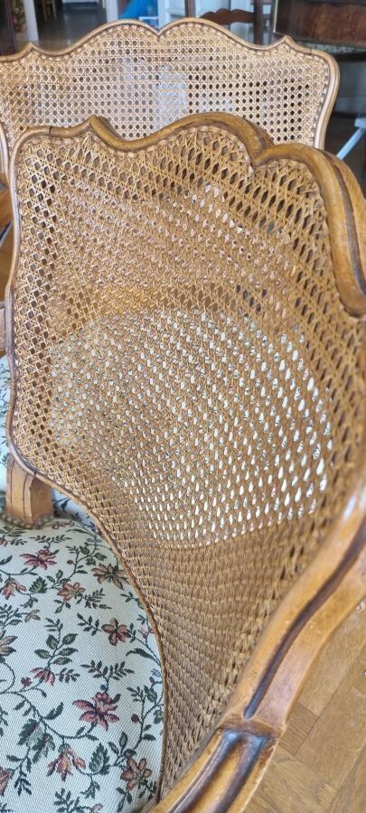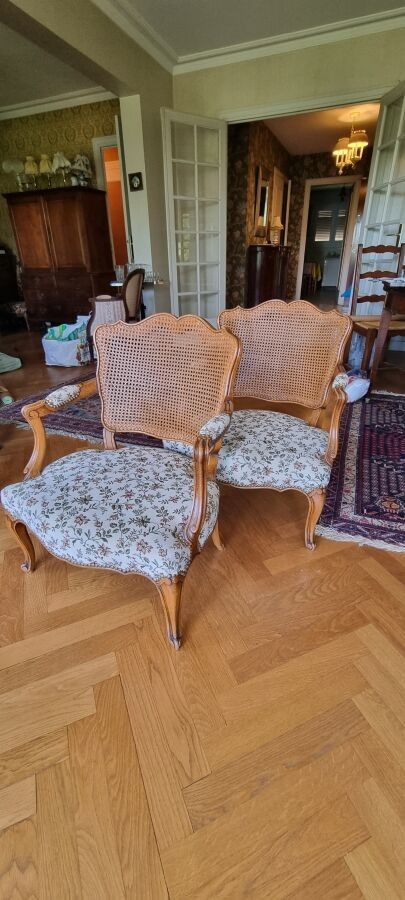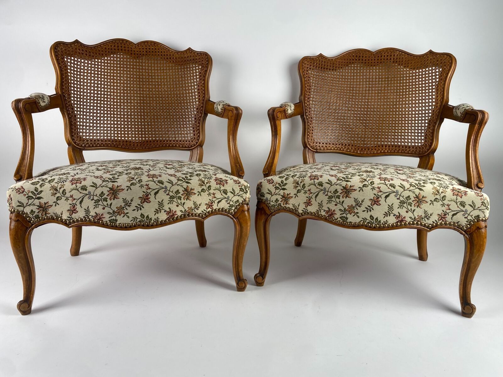 Paire de fauteuils cabriolet en bois mouluré à dossier mouvementé canné et assise recouverte d'un tissu à décor floral.