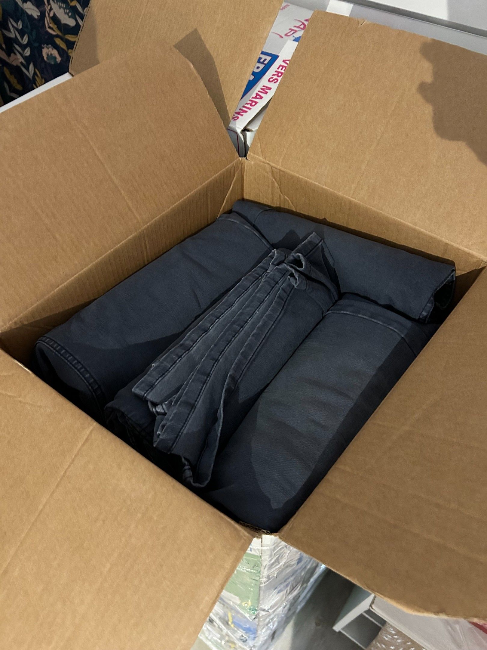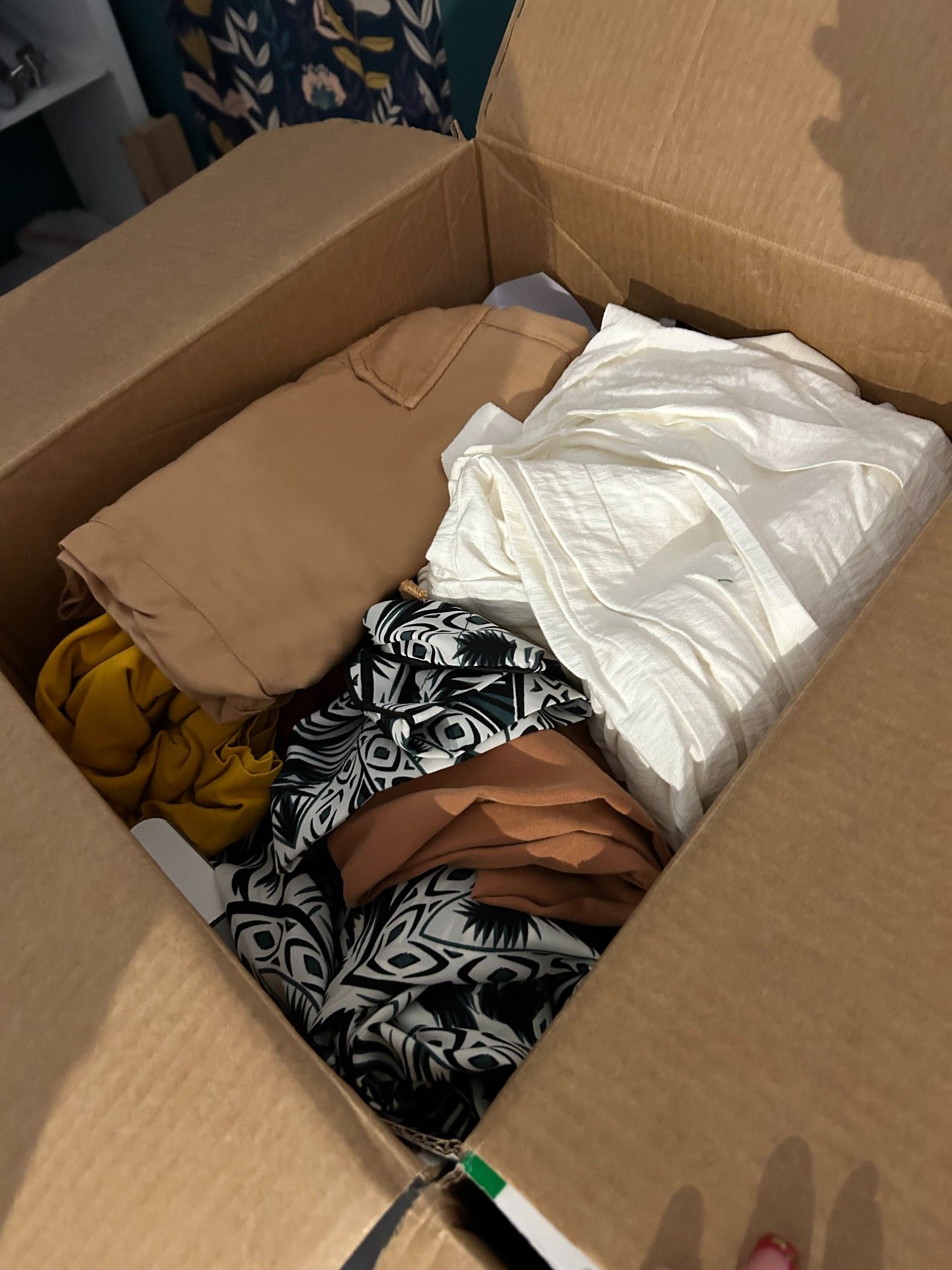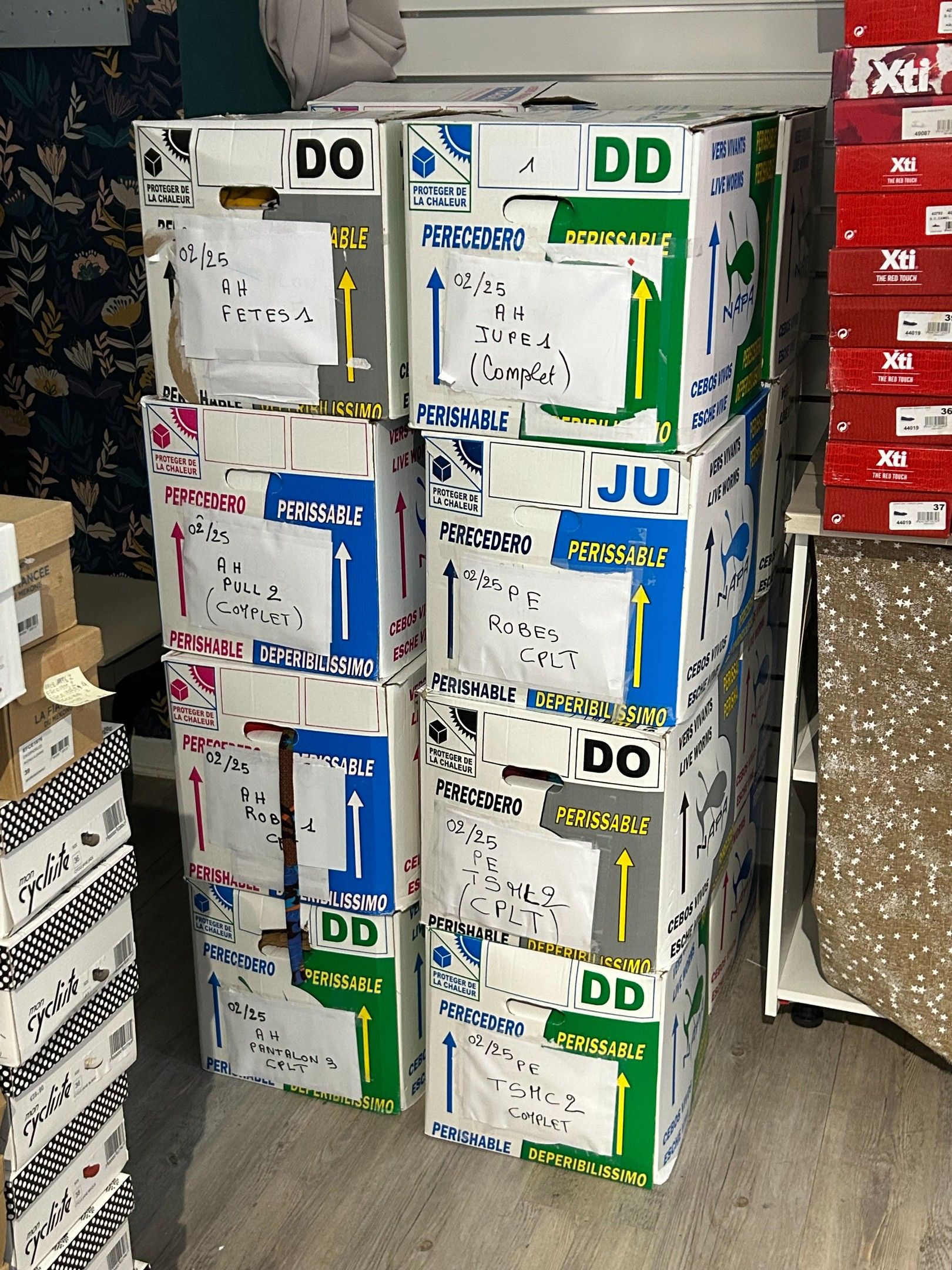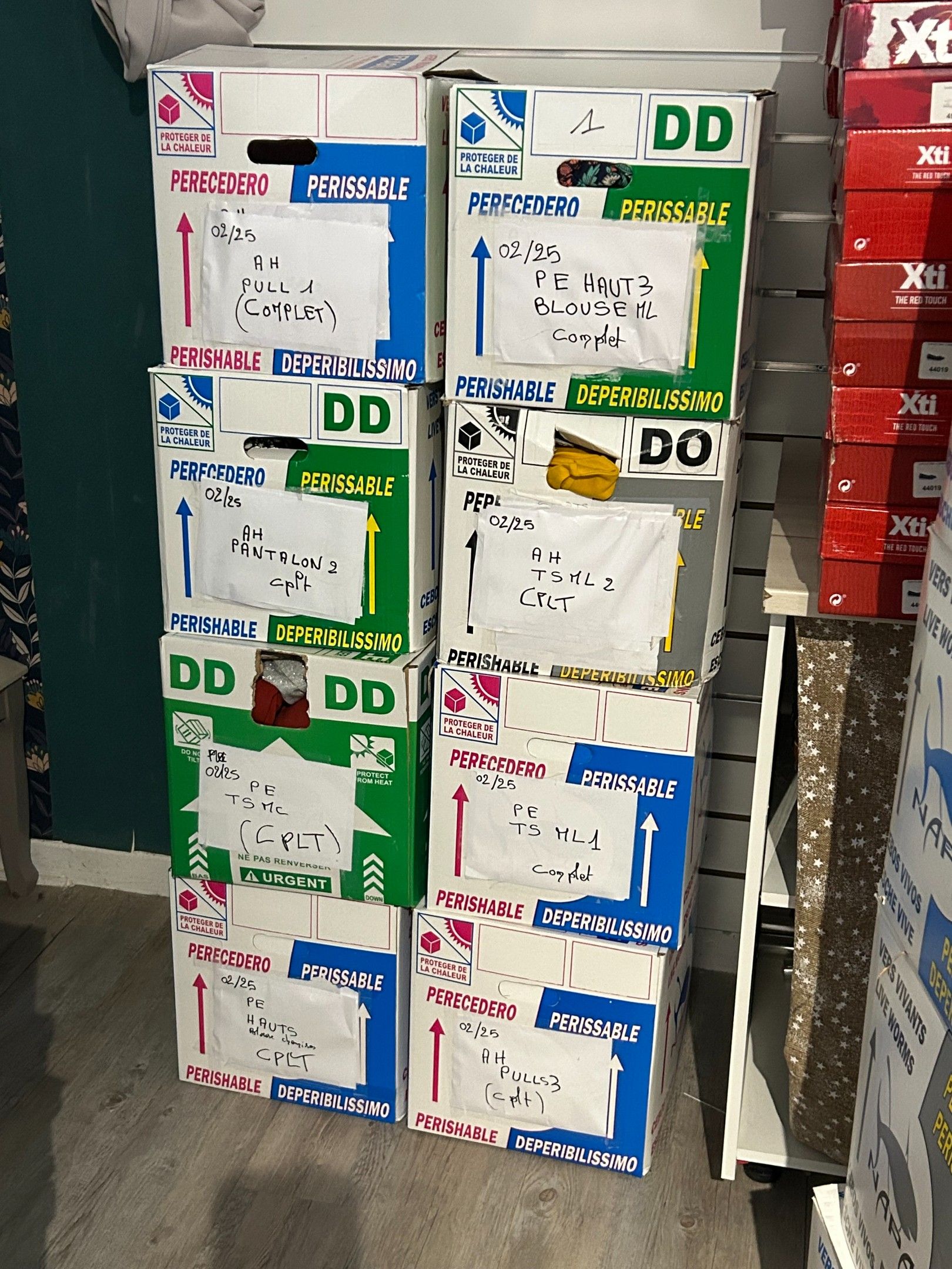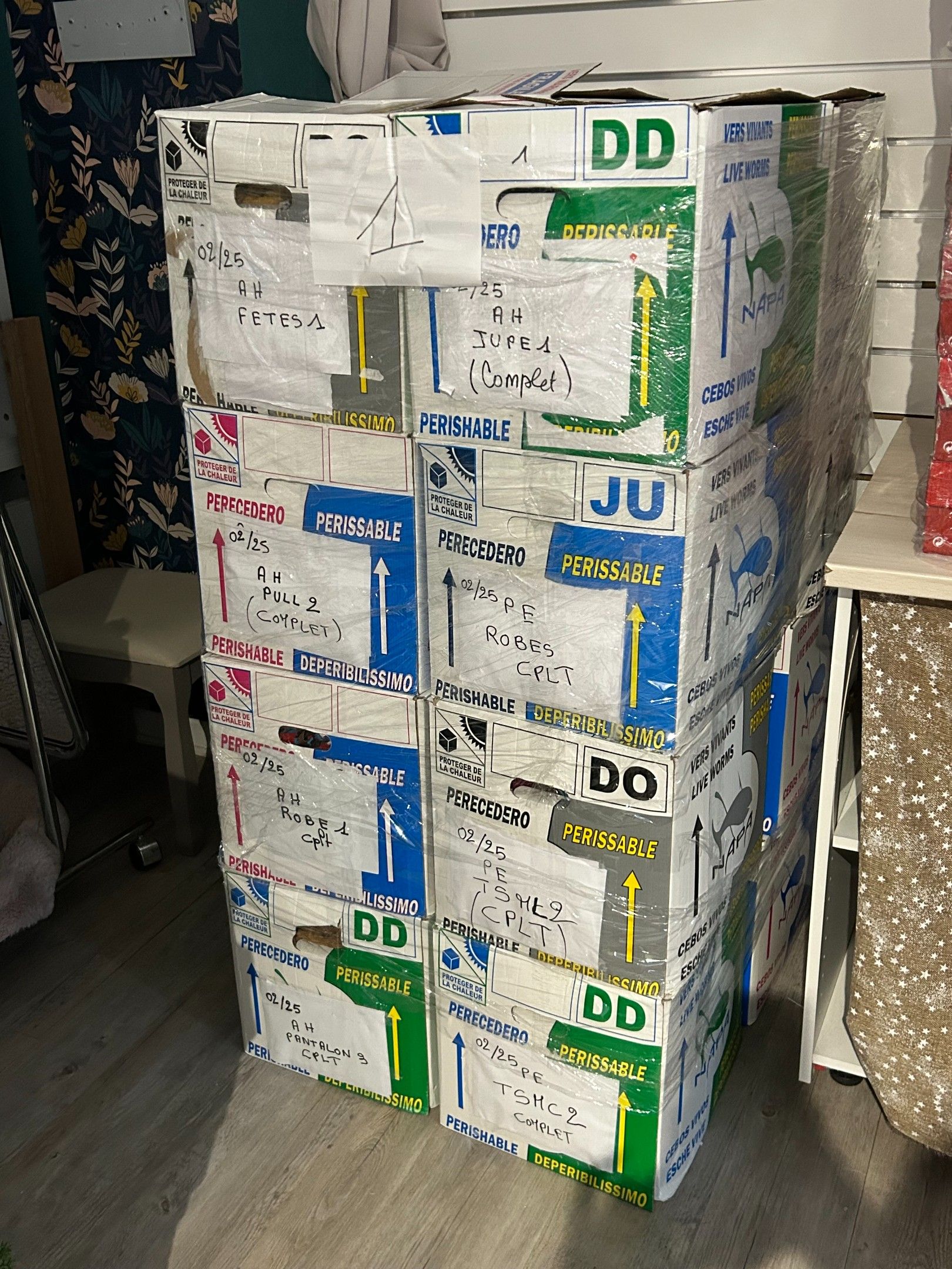 Lot de 16 cartons de vêtements de marques et types divers. Les indications inscrites sur les cartons sont données par la dirigeante