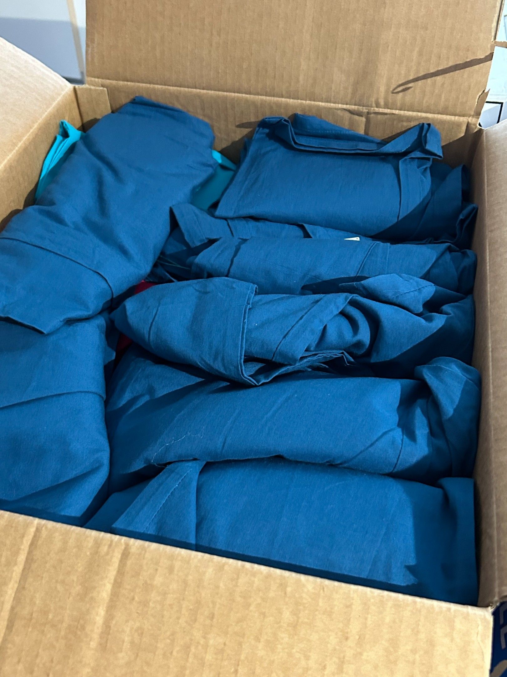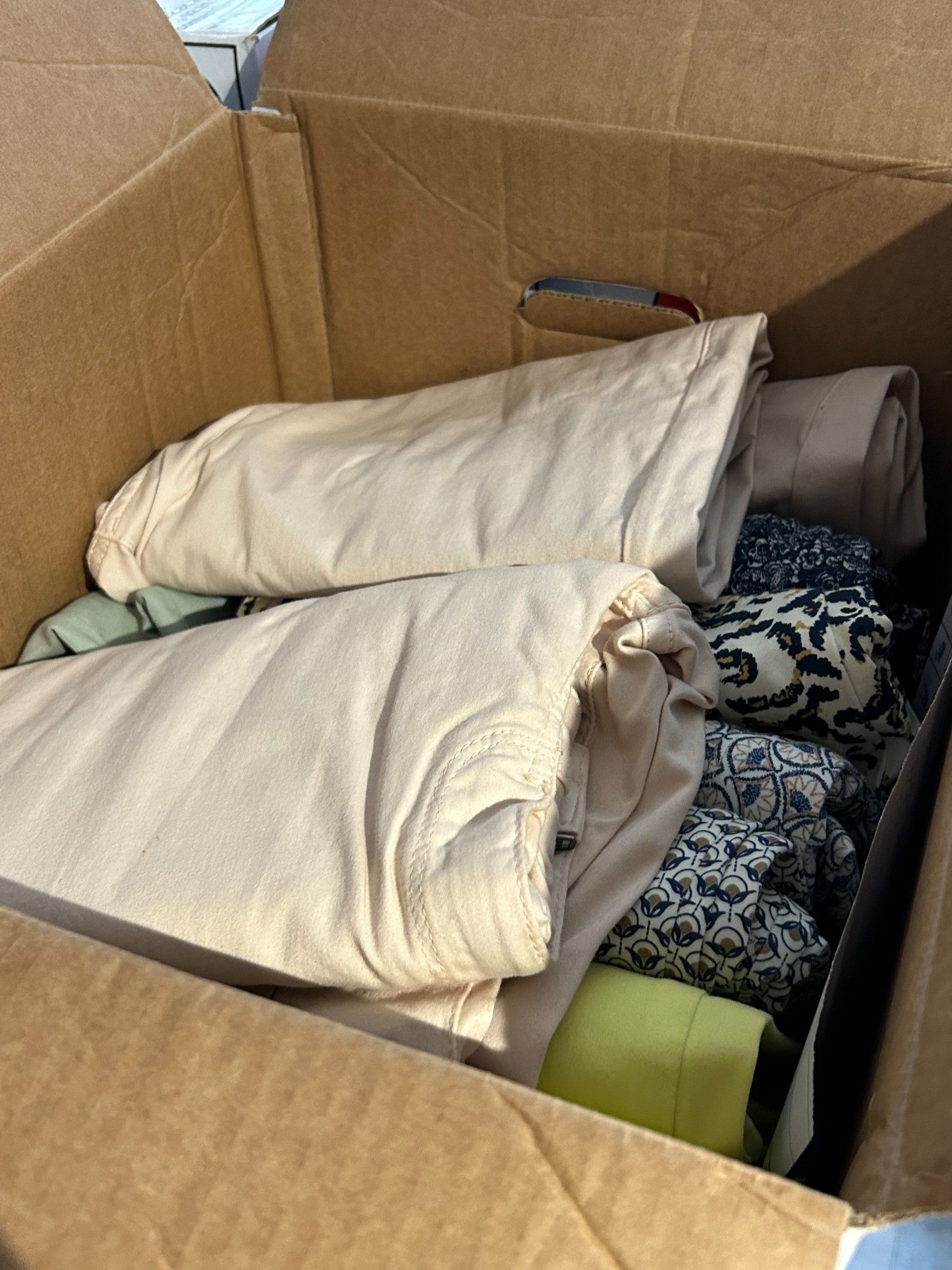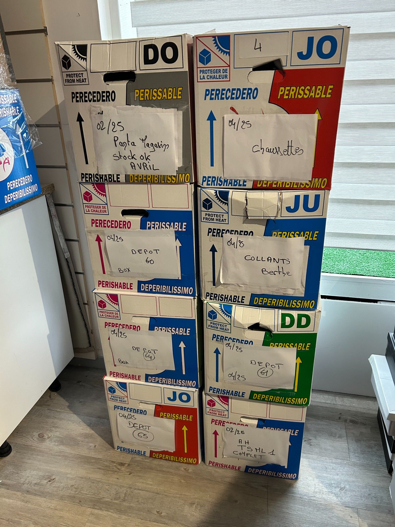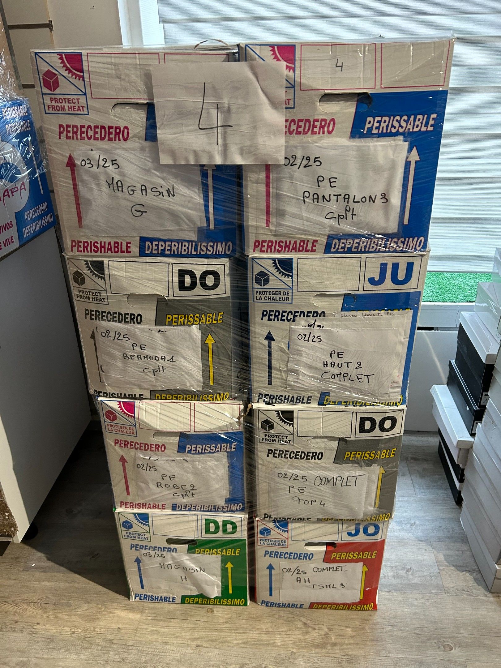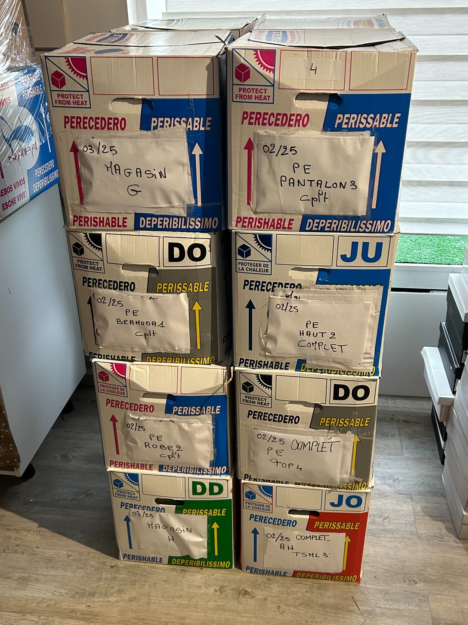 Lot de 16 cartons de vêtements de marques et types divers. Les indications inscrites sur les cartons sont données par la dirigeante