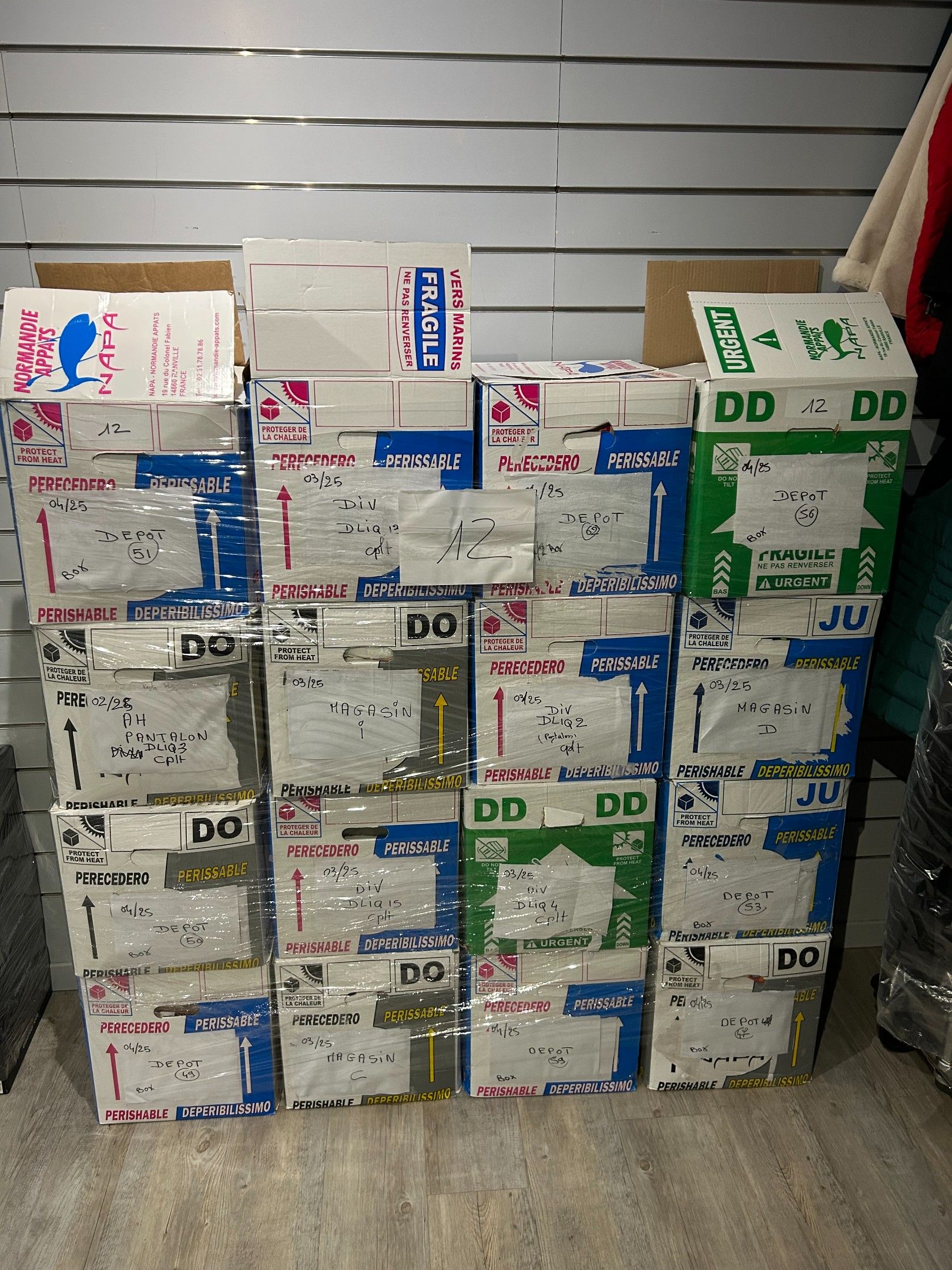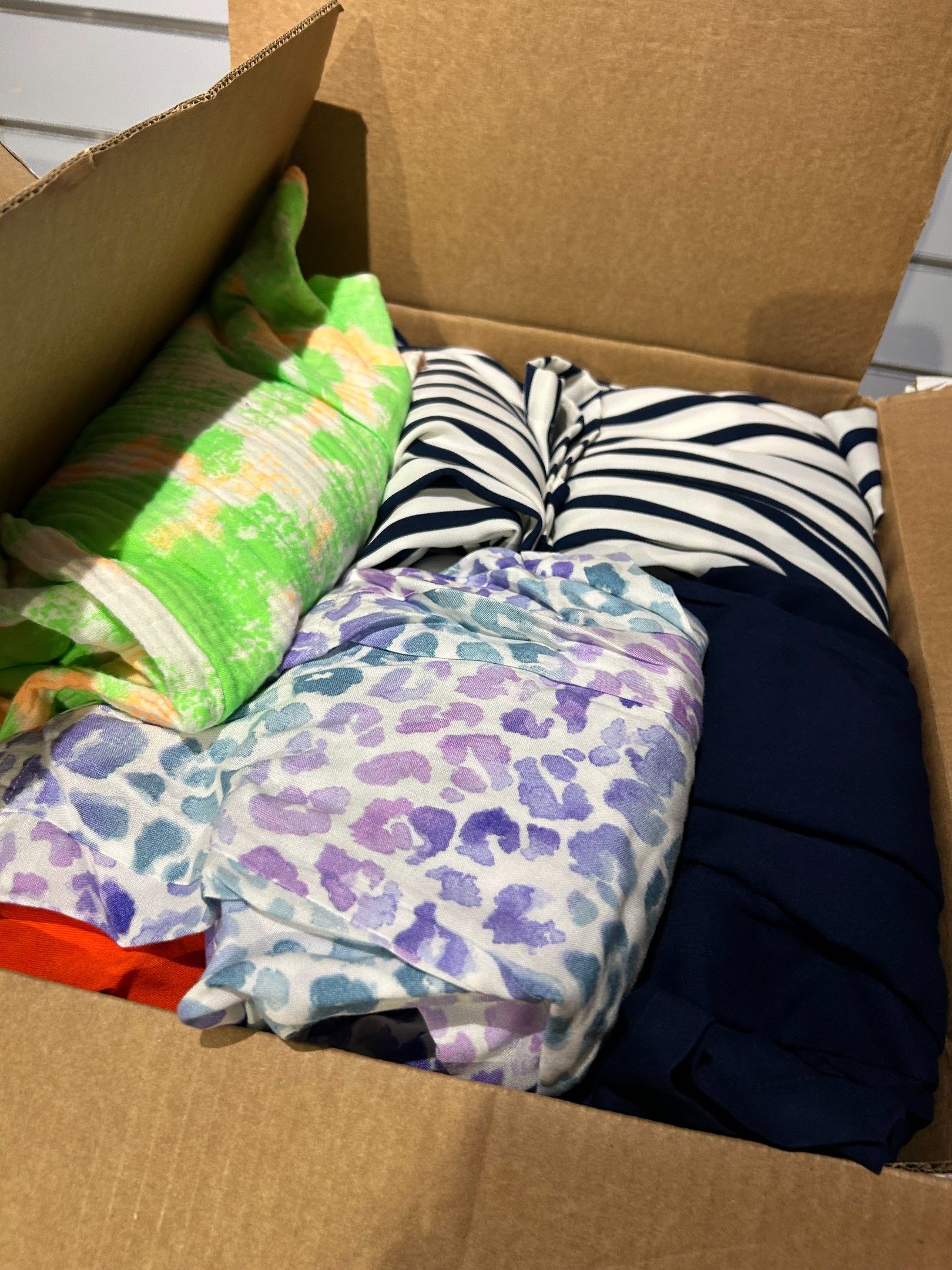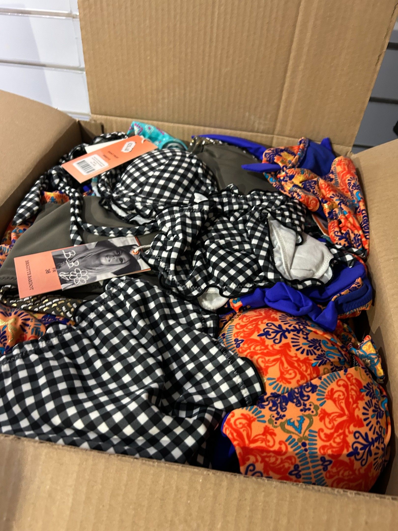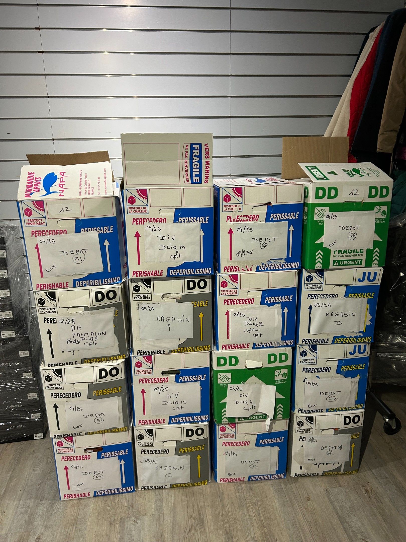 Lot de 16 cartons de vêtements de marques et types divers. Les indications inscrites sur les cartons sont données par la dirigeante