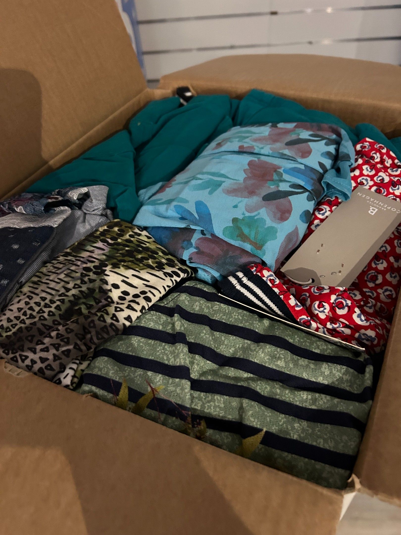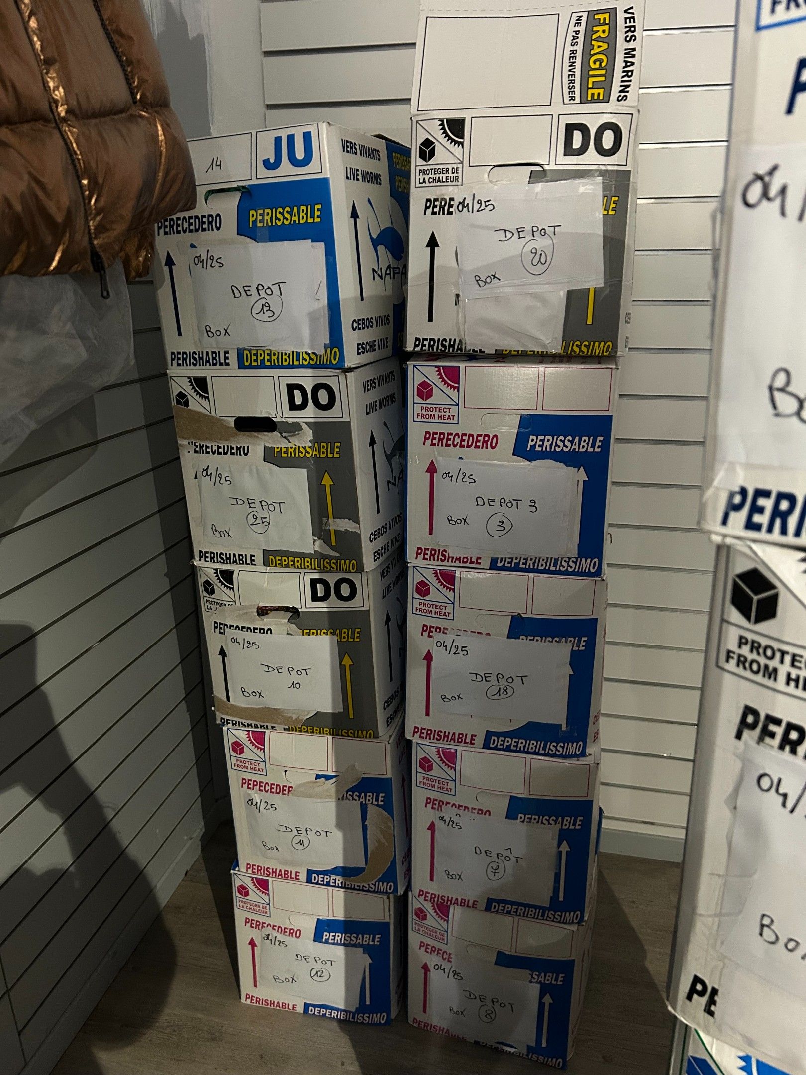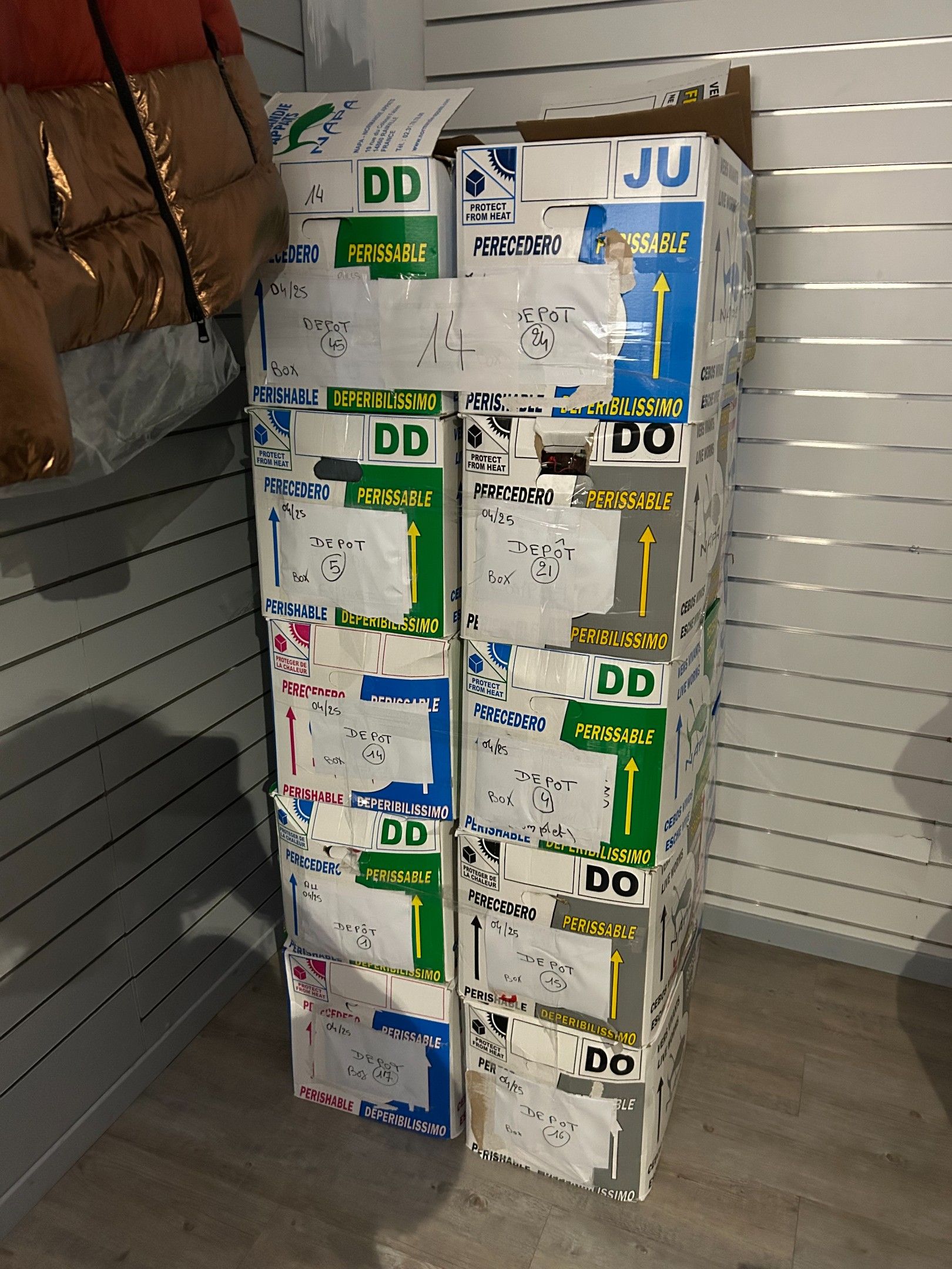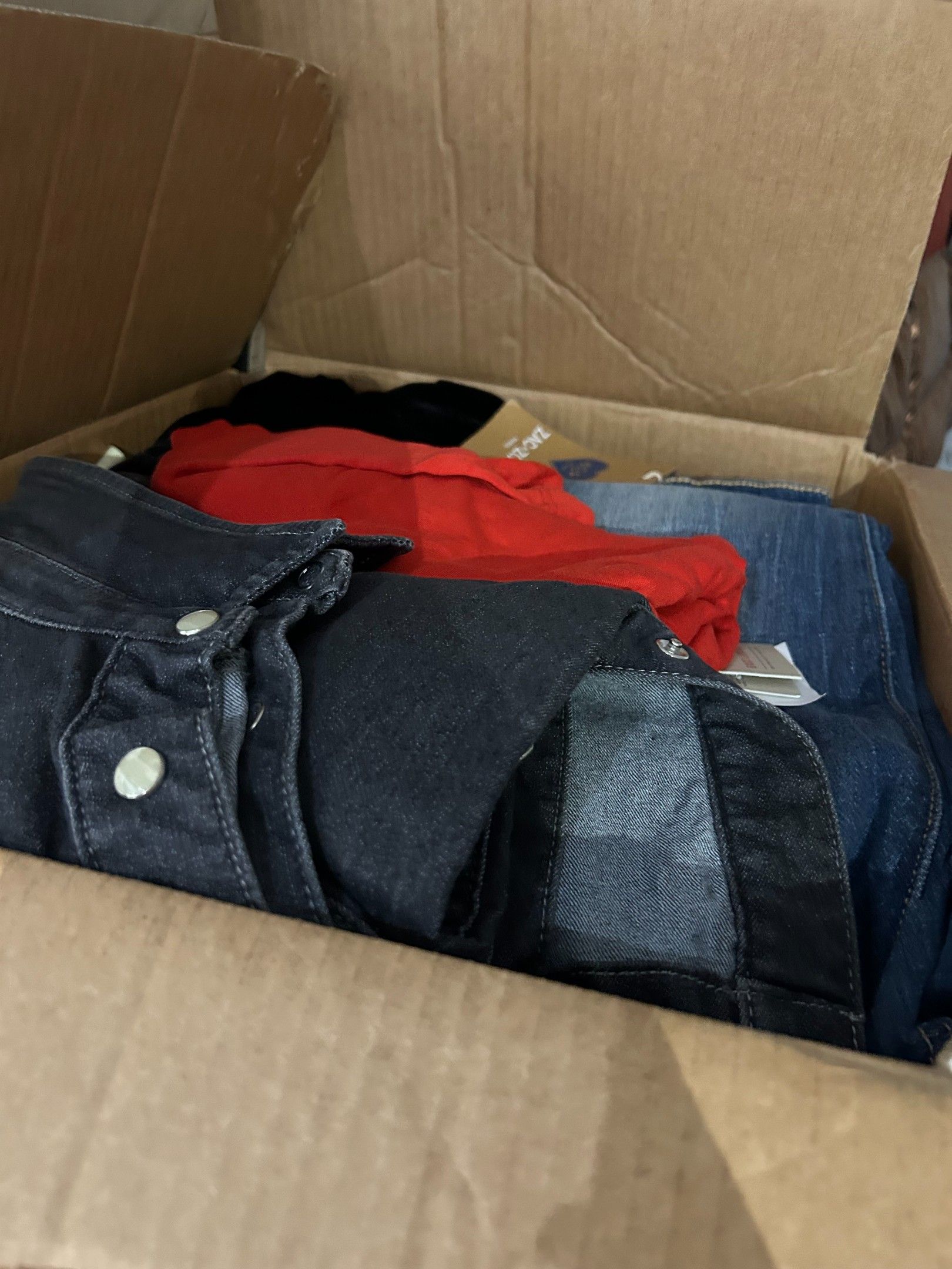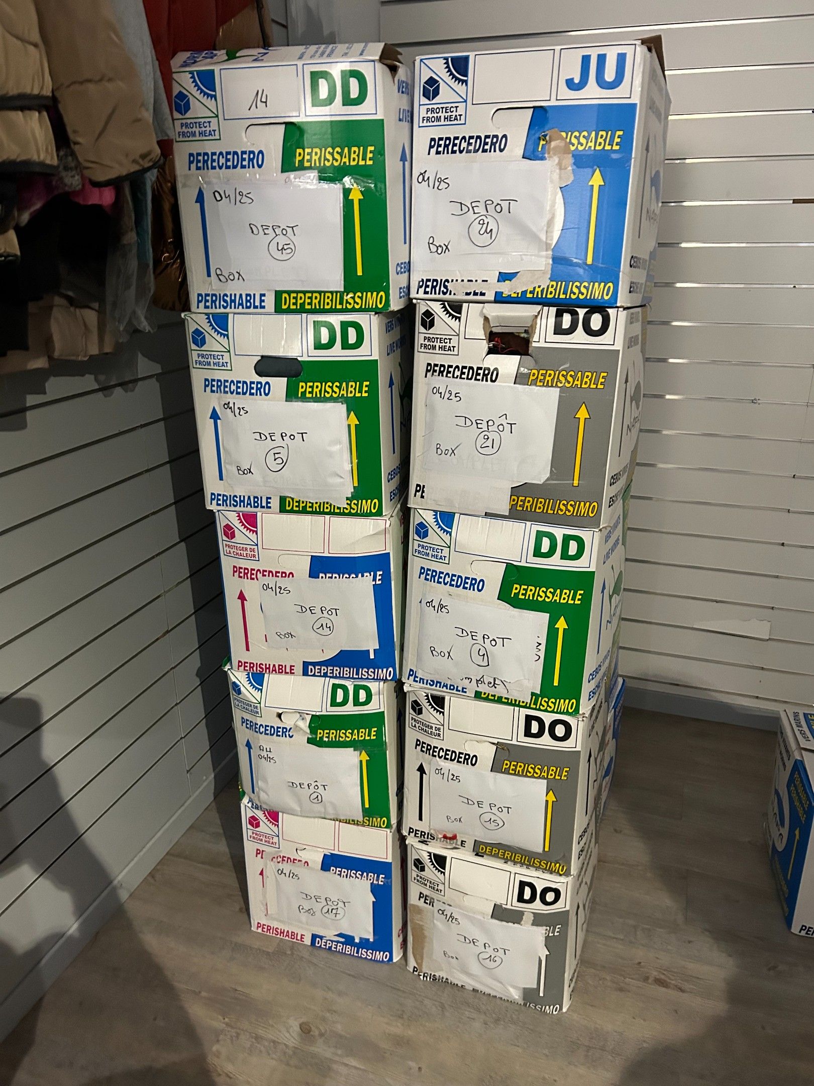 Lot de 20 cartons de vêtements de marques et types divers. Les indications inscrites sur les cartons sont données par la dirigeante