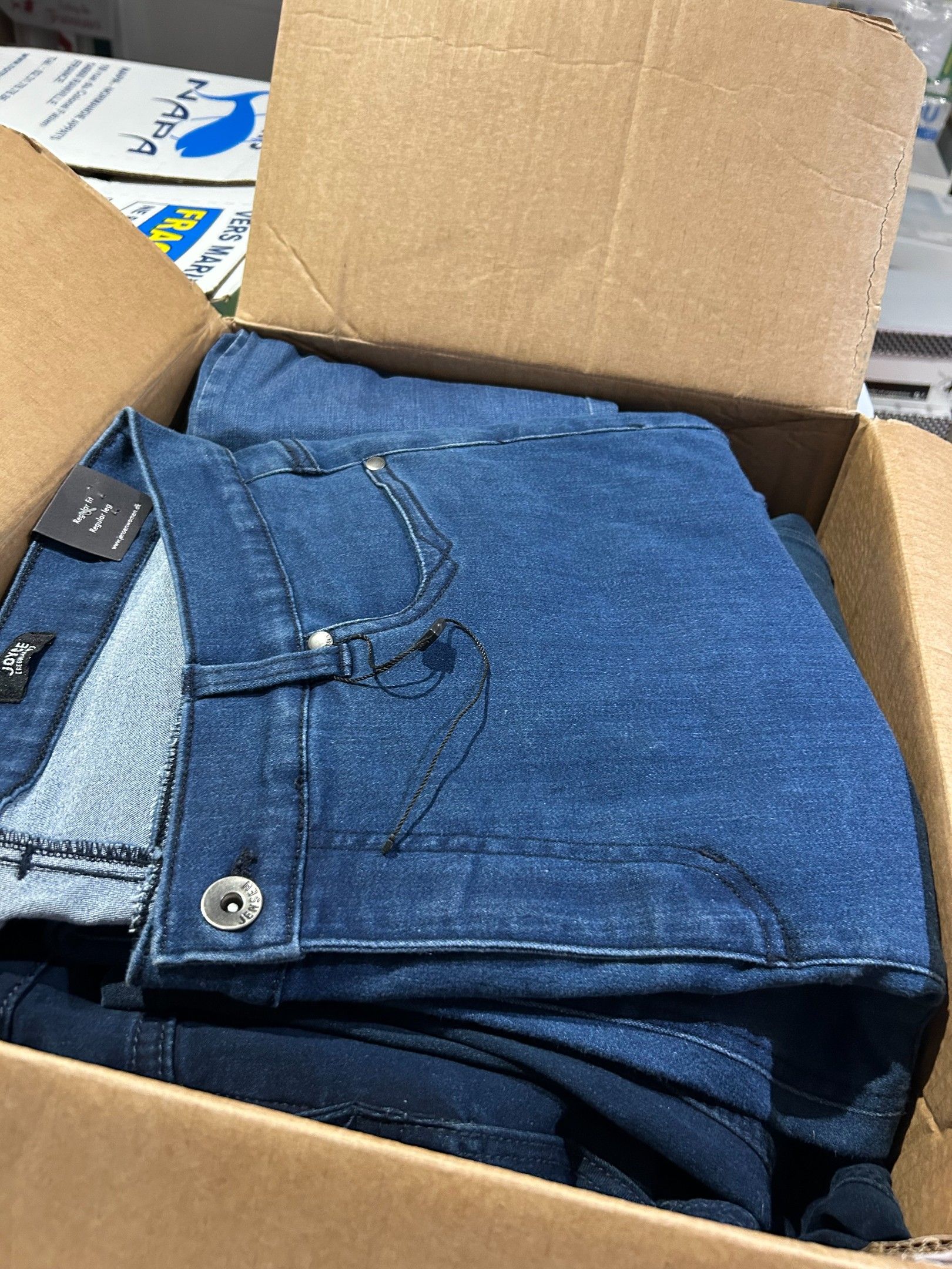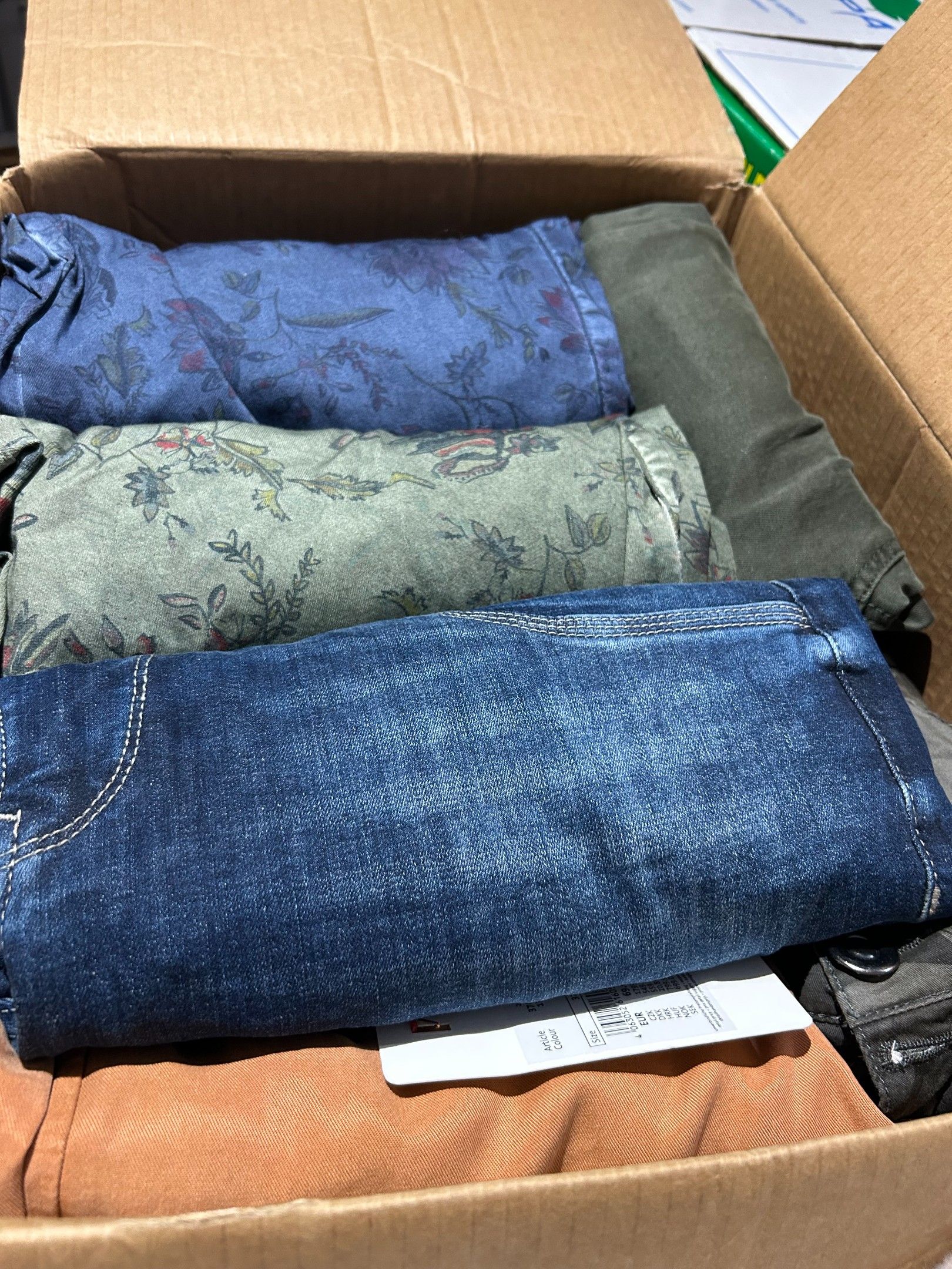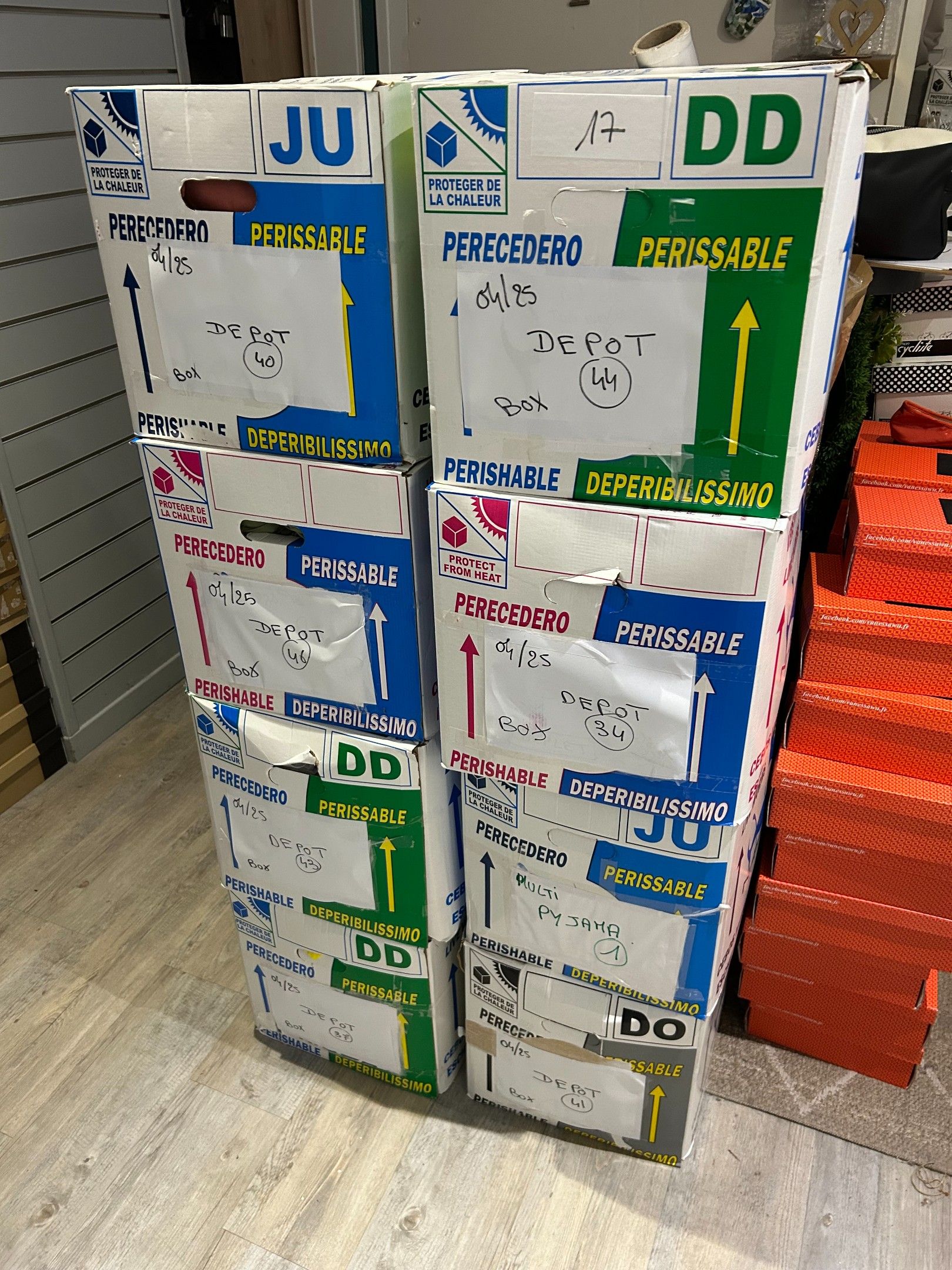 Lot de 16 cartons de vêtements de marques et types divers. Les indications inscrites sur les cartons sont données par la dirigeante