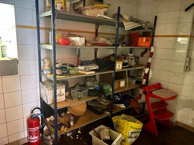 Racks en métal, fauteuil d'enfant rouge, robot KENWOOD, acce…