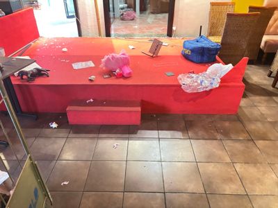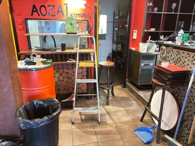 1 bidon rouge, une échelle accidentée, deux tabourets, un lo…