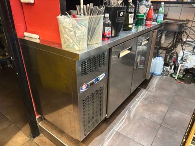 Réfrigérateur CURTISS et table haute en inox avec dosseret