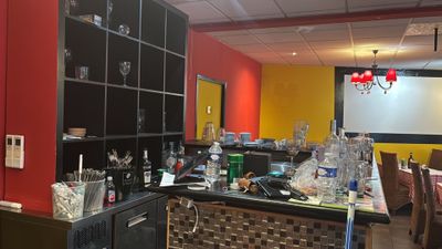 Un lot de verres, couverts, tasses, pichets (sur le bar et s…