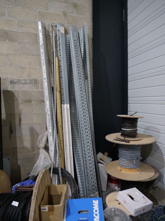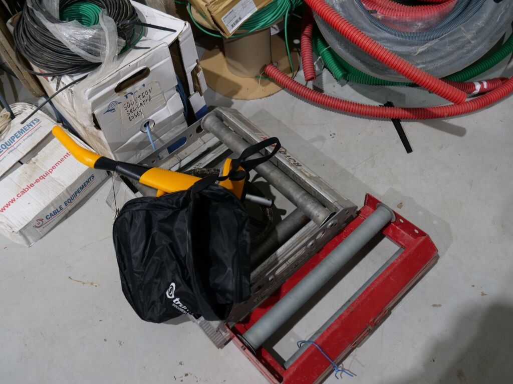 1 ENSEMBLE DE CABLAGE MAJORITAIREMENT LAN, VIDEO, + GAINE ELECTRIQUE, DEROULEUR DE CABLE WURTH, ROUE D'APPENTEUR, + GAINE TUBIRO, PANNEAUX DE CHANTIER, + 1 BROUETTE